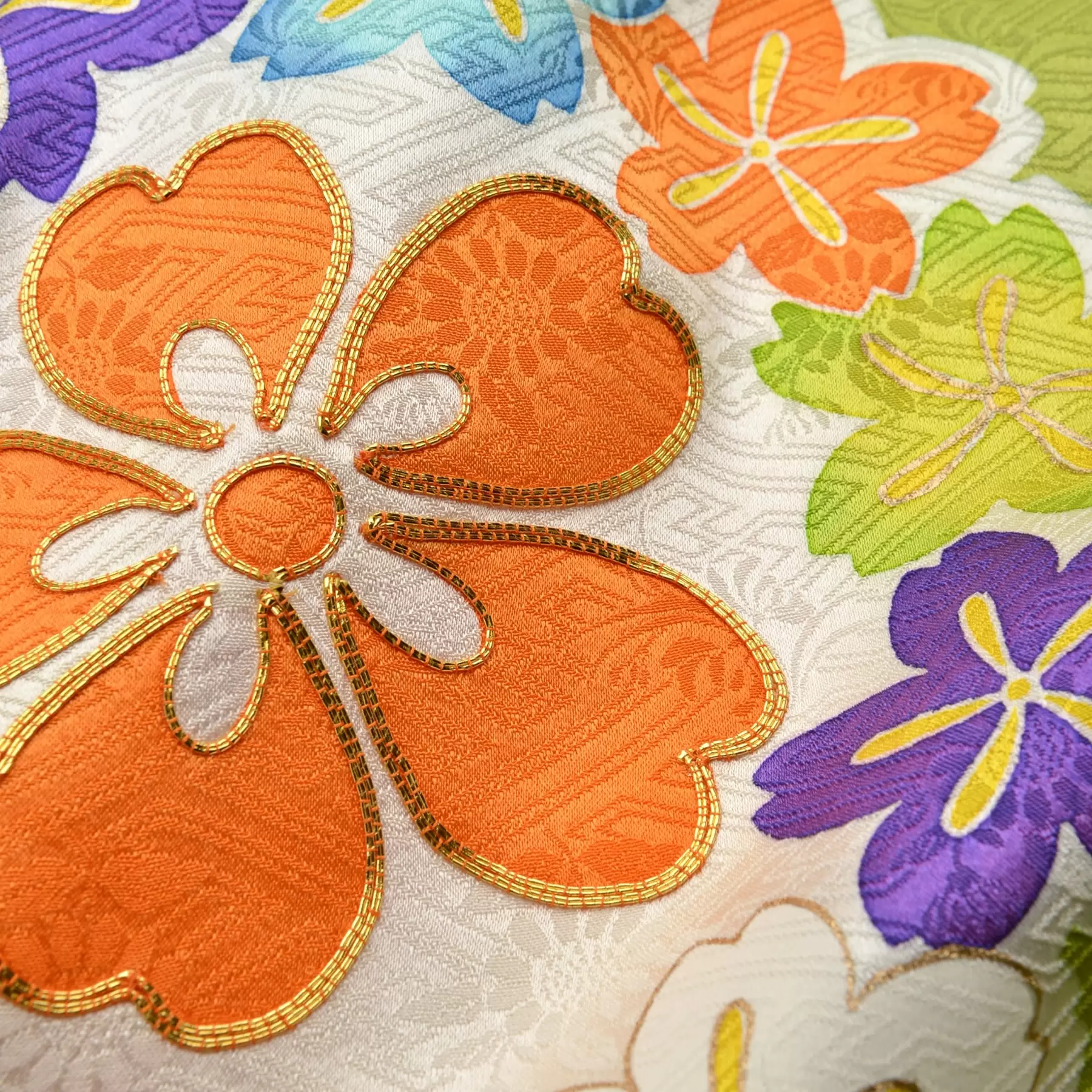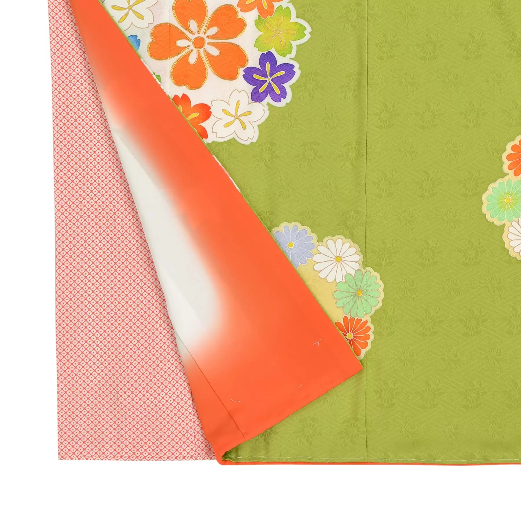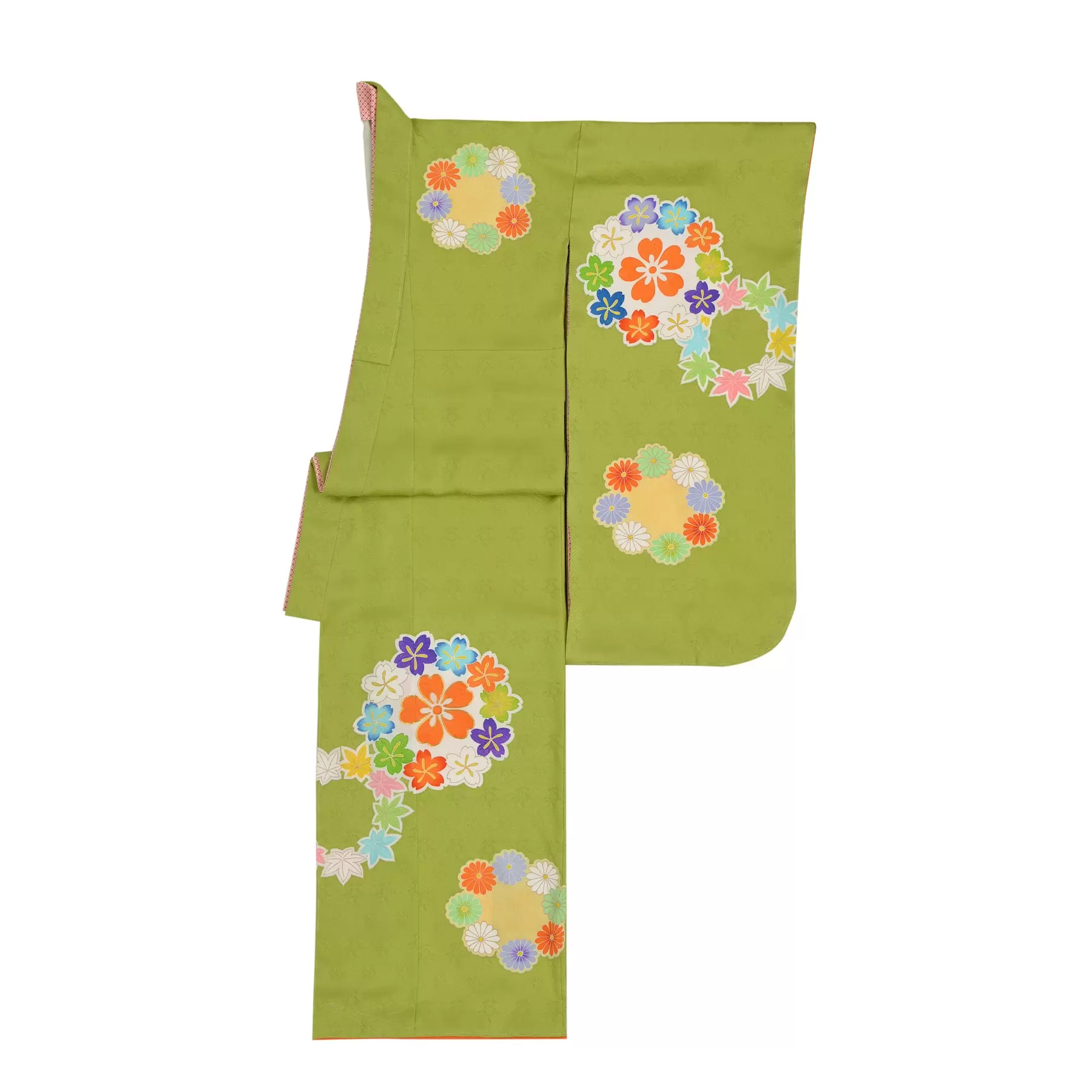 明治時代に千總が作っていた友禅柄を参考にデザインしました。光沢のある綸子の生地に染めた若草色がよく映えます。永遠に繋がっていく輪つなぎで、春秋の花を表現したカラフルで可愛らしい一枚。これから色々なご縁に恵まれ繋がっていきますようにとの願いを込めて作りました。