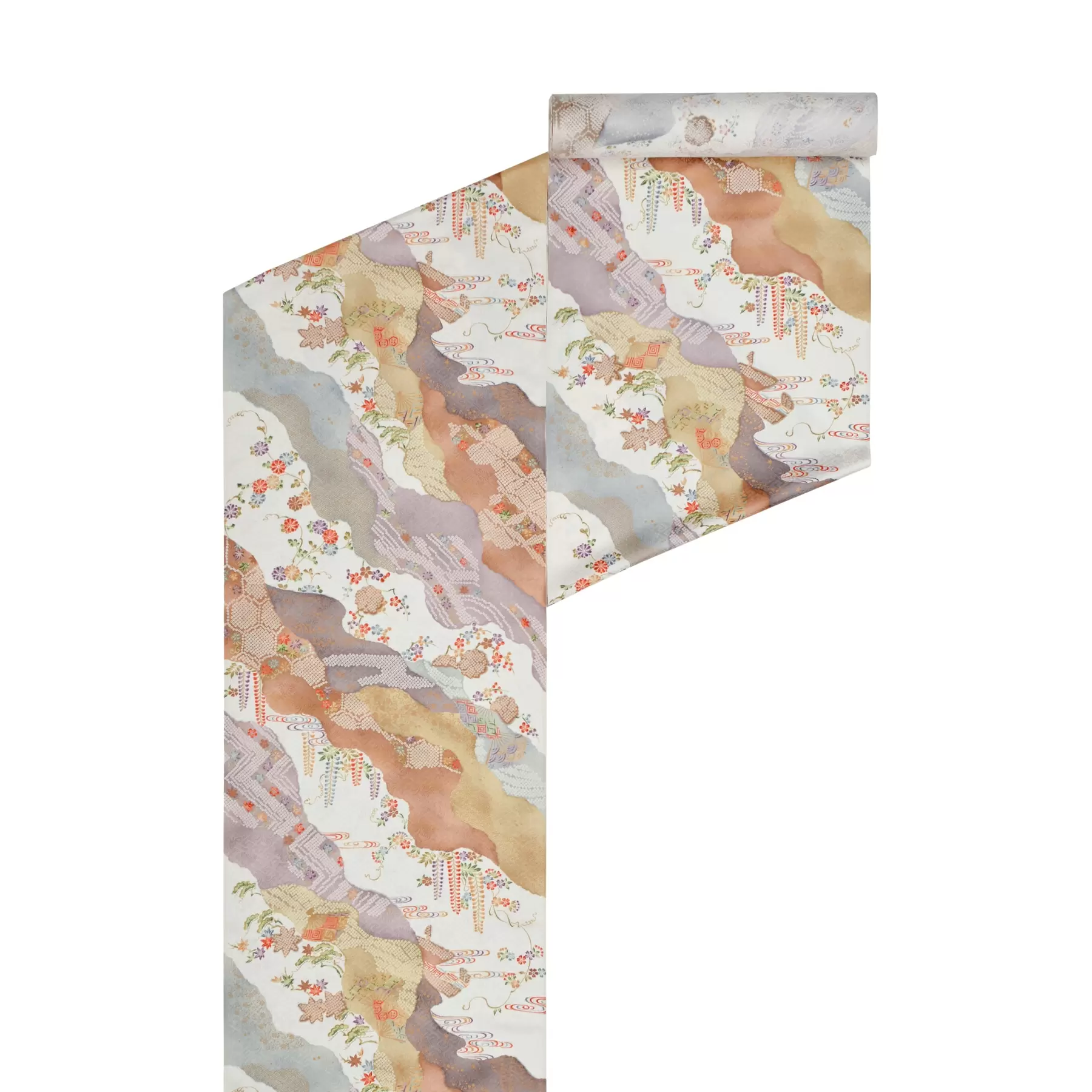 光沢のある綸子地に、自然の風景を抽象的に描き出した慶長文様を表現しました。流れるような曲線が着姿を美しく演出。またクラシックな文様に合うように全体を押さえた色彩まとめました。エレガントに、華やかにと、様々な表情の変化を楽しめる一枚です。