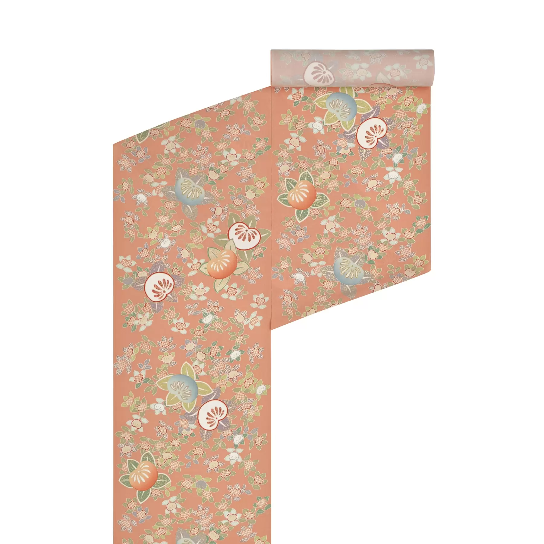 ぱっと目を引く明るいオレンジの地色の上に、大、小の橘が散りばめらた可愛らしい一枚です。千總の紋であり、数少ない日本生まれの吉祥文様である橘尽くしのこの小紋は、お洒落なお出かけ着として、お祝いの場の装いとして、卒業式のきものとして、幅広くお召しいただけます。