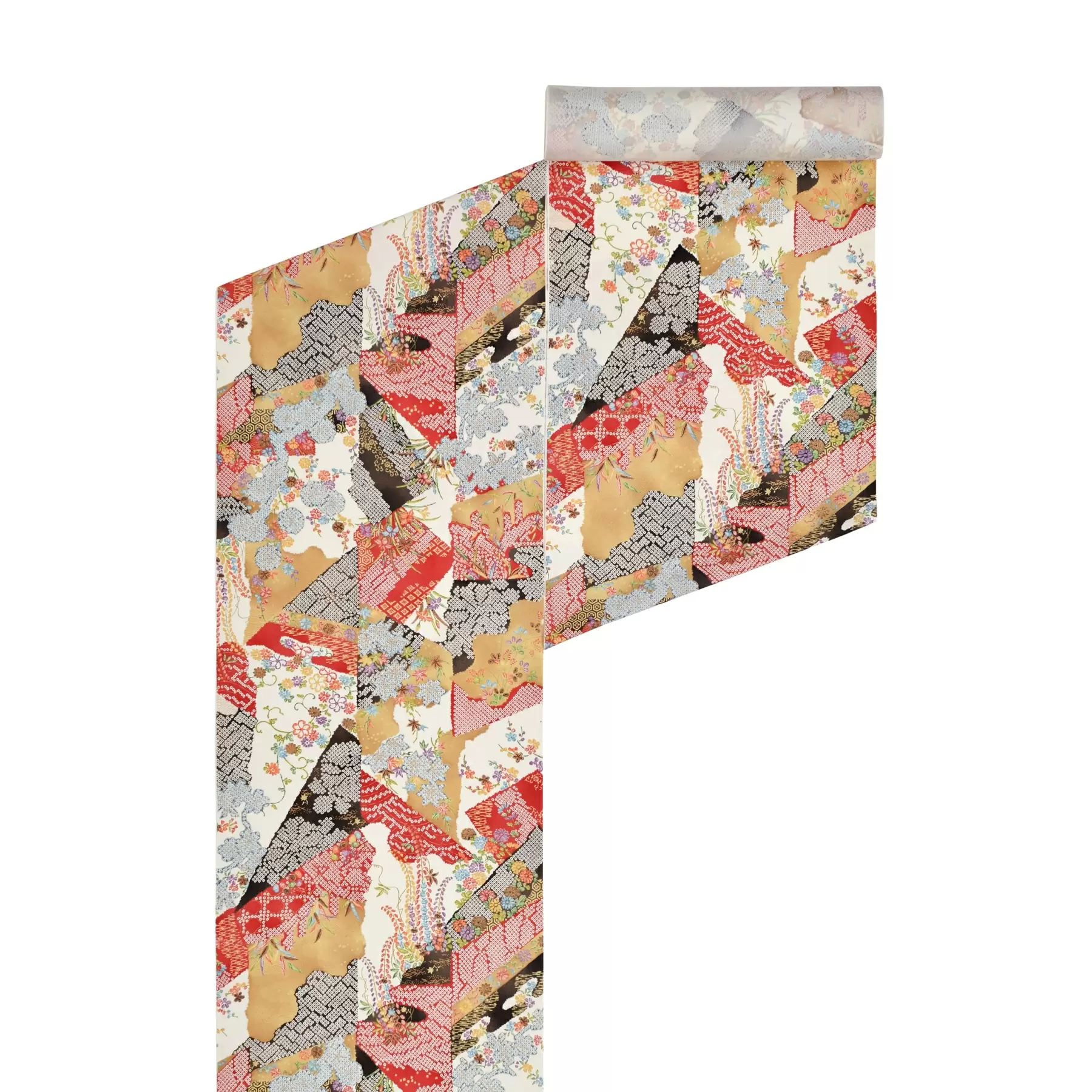 疋田や小紋箔を全体に細かく配し、自然の風景を抽象的に描き出した慶長文様を表現しました。縦方向に斜めの取り方をリズミカルに絡めたデザインは豪華な印象を与えてくれます。赤や墨色、金色の配色が全体を引き締めています。古典文様の重厚感をお楽しみいただける、パーティーにもぴったりの華やかな小紋です。