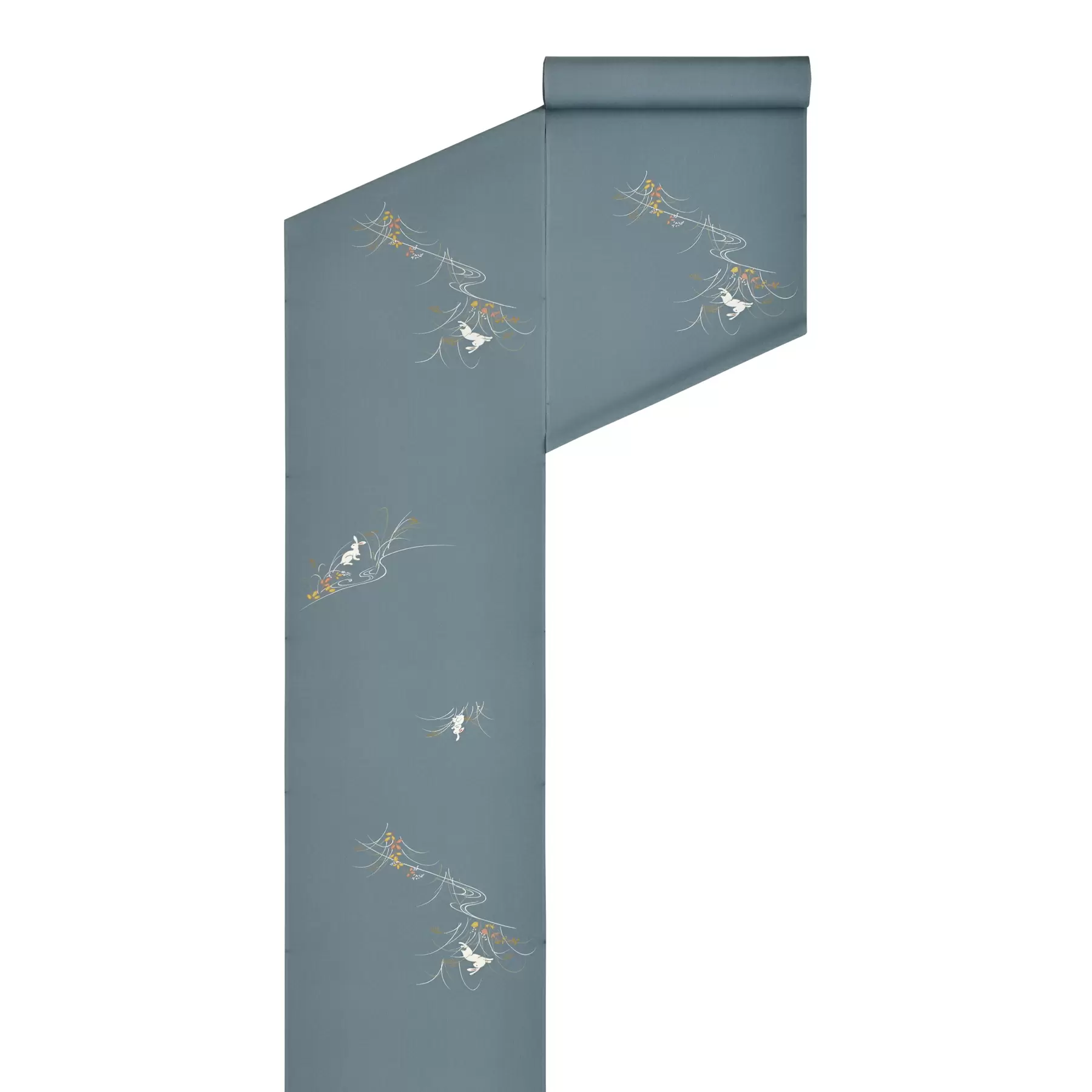 芒や萩などの秋草の草原に愛らしい兎が駆け回る可愛らしく楽しいデザインの小紋です。落ち着いたブルーの地色と流水や芒の優美な曲線が趣を添えて、すっきりとした雰囲気でお召しいただけます。