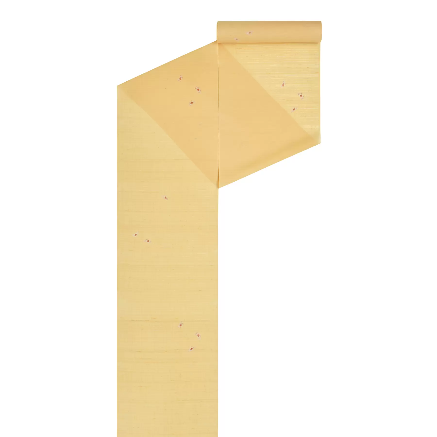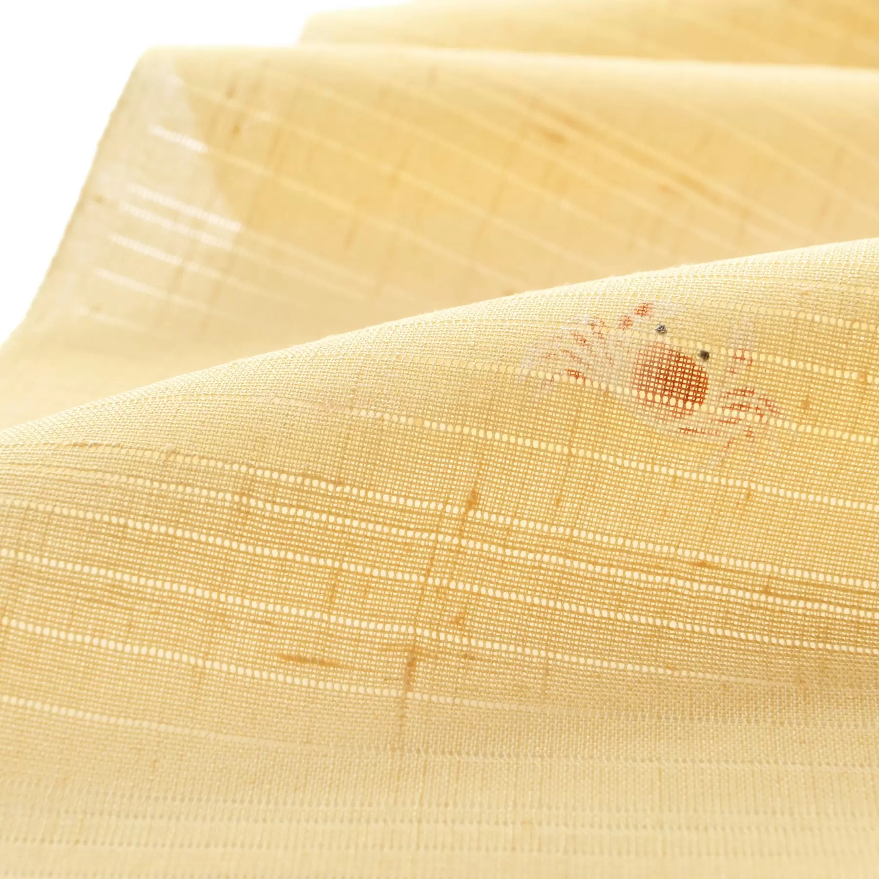さわがにが水辺を動き回る様子が思い浮かぶように愛らしい文様です。紬のシャリっとした風合いが特徴の紬絽をきれいめな黄色で染め上げました。