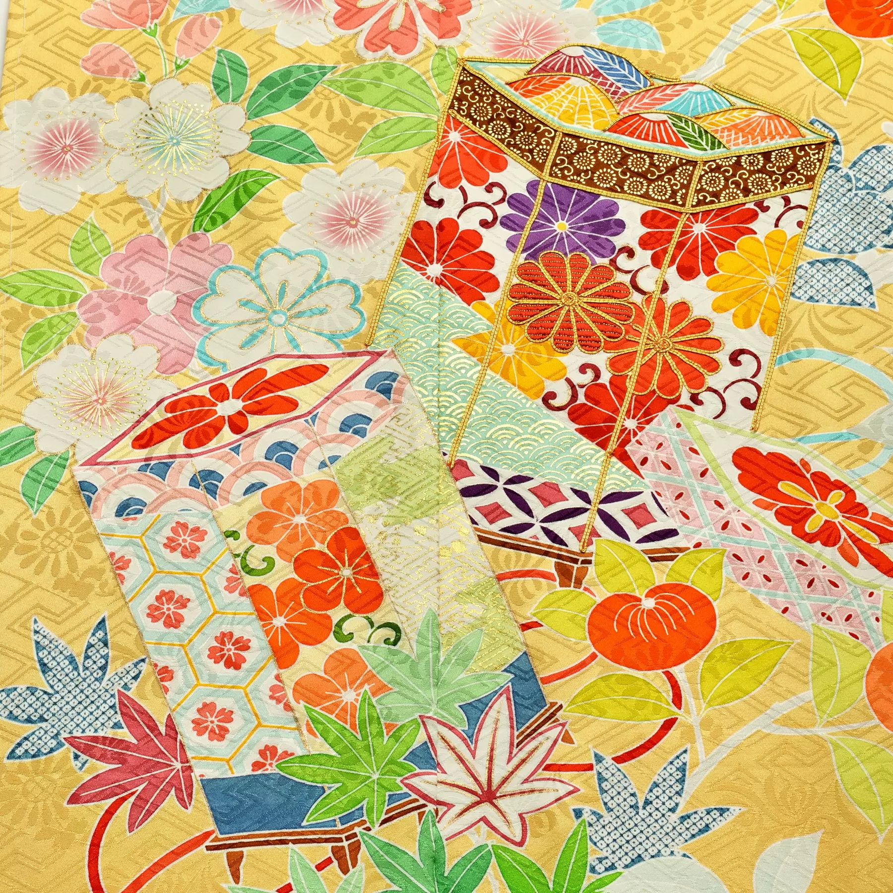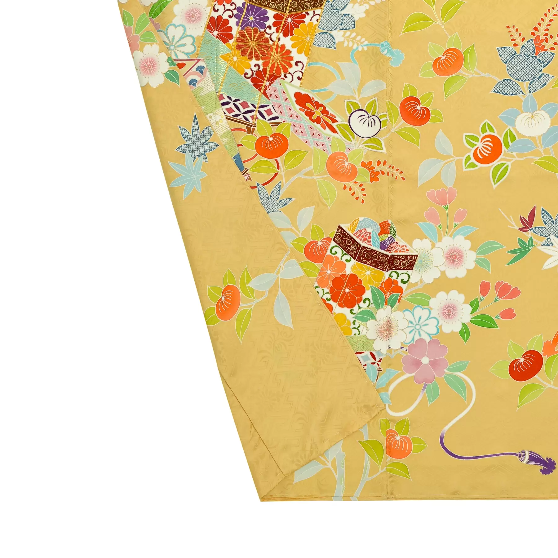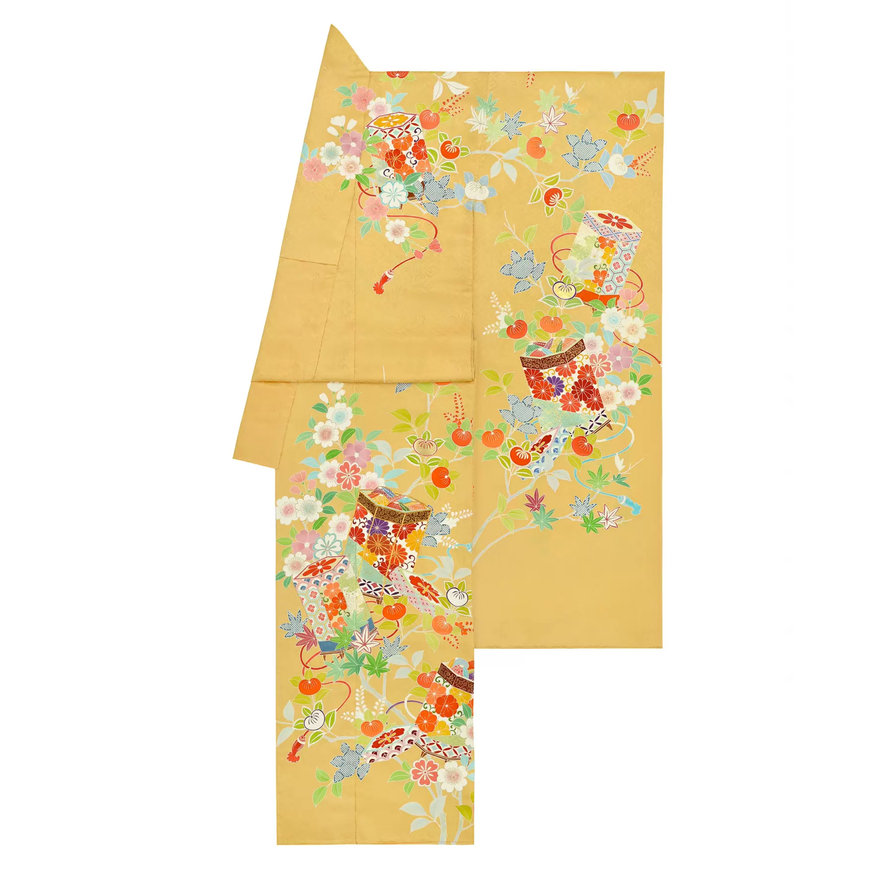 桜、楓、橘が咲き乱れる伸びやかな枝に貝桶が配された典雅なデザインです。ひときわ存在感のある貝桶は、箔や刺繍などの技法を使い分け繊細に表現し、その周りを彩る花々は多彩な色で美しく描き分けられています。優しいオレンジの地色が上品な明るさを演出してくれる優しい振袖です。