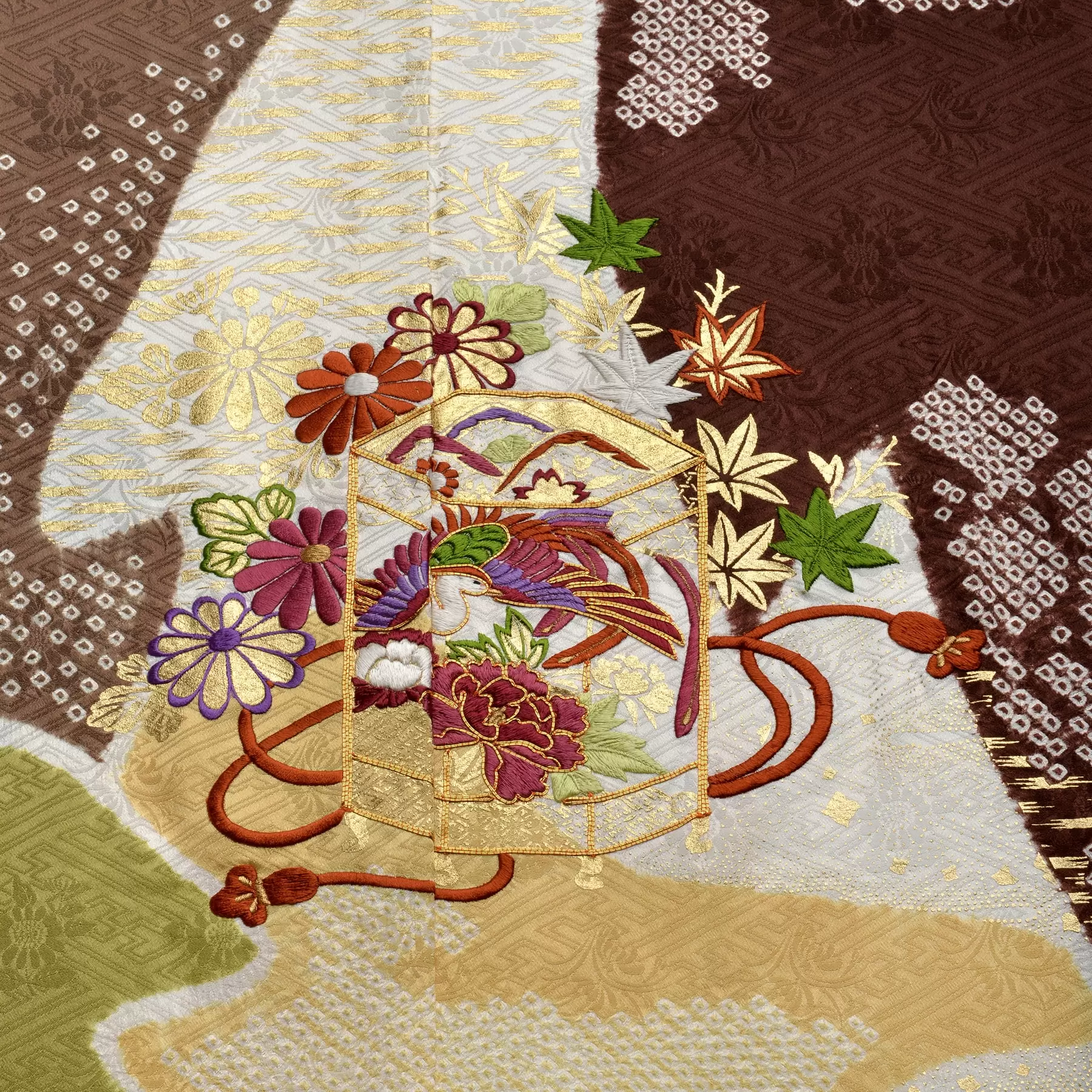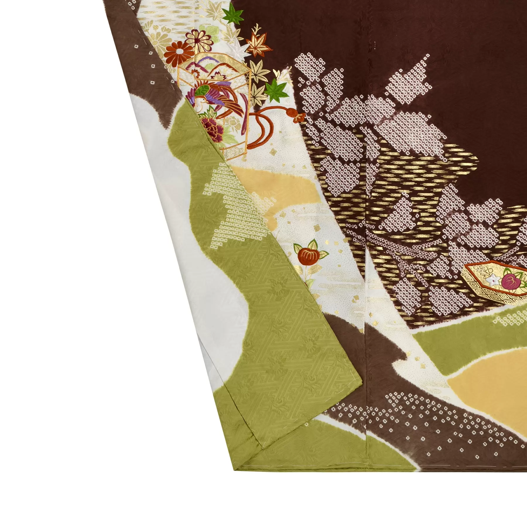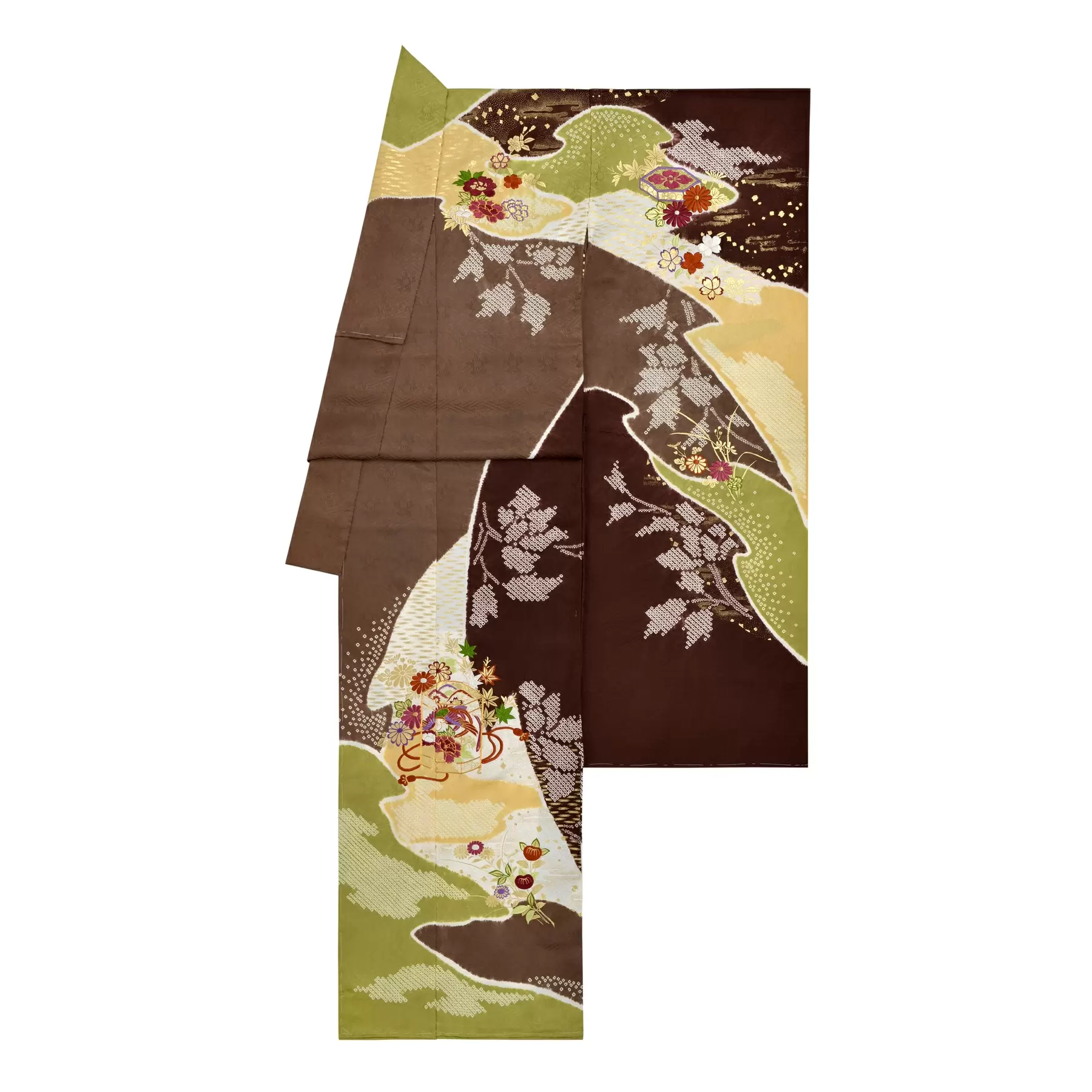 山の稜線、川の流れ、雲のたなびく様などの自然の風景を抽象的に描き出した慶長小袖をベースに、絞りと刺繍の技法で自然の豊かさを描き出した一枚です。茶色や緑に効かせたクリームが抑えた華やかさを感じさせる地色の上に、貝桶や牡丹が粋に描かれています。重厚感があり、誰とも被らない振袖です。