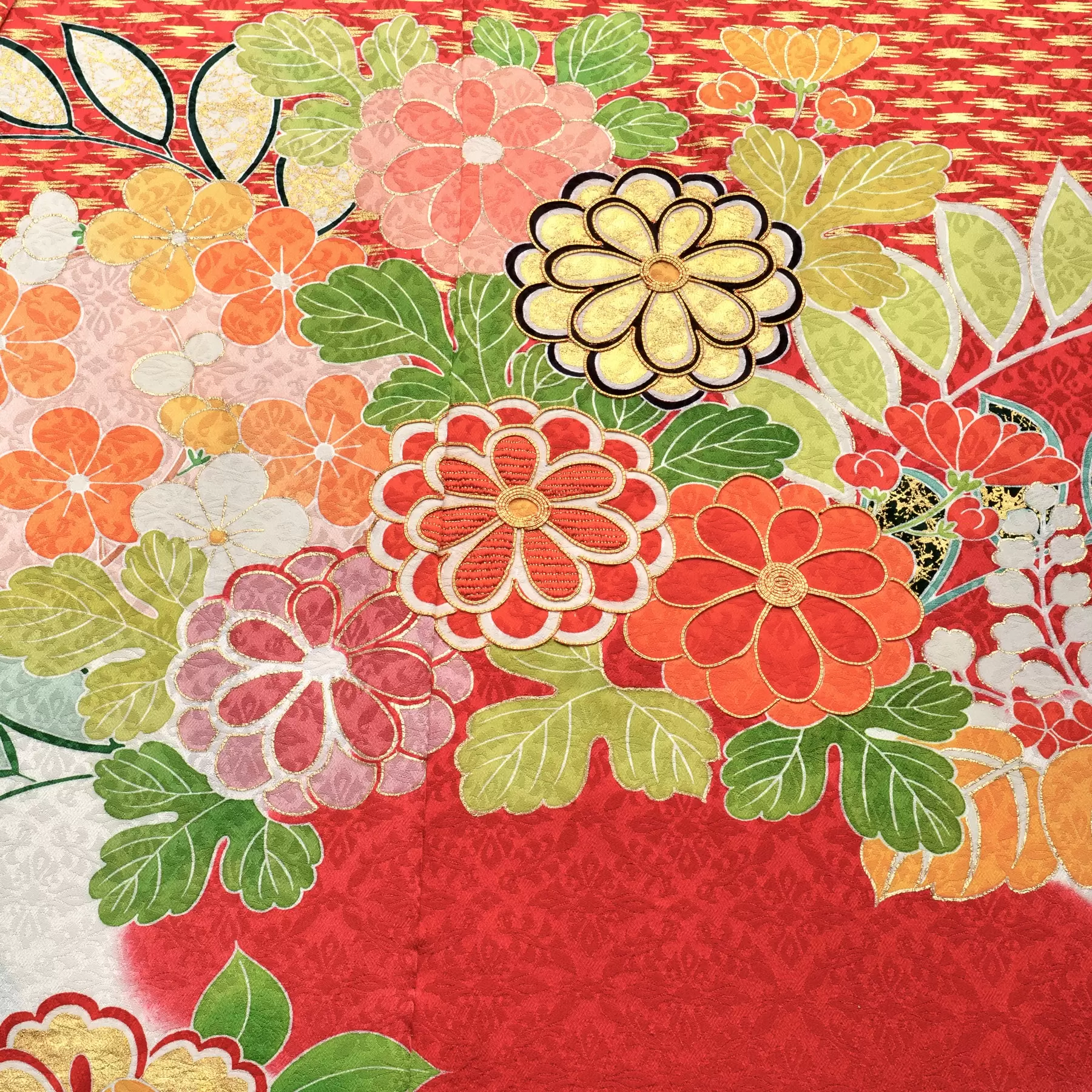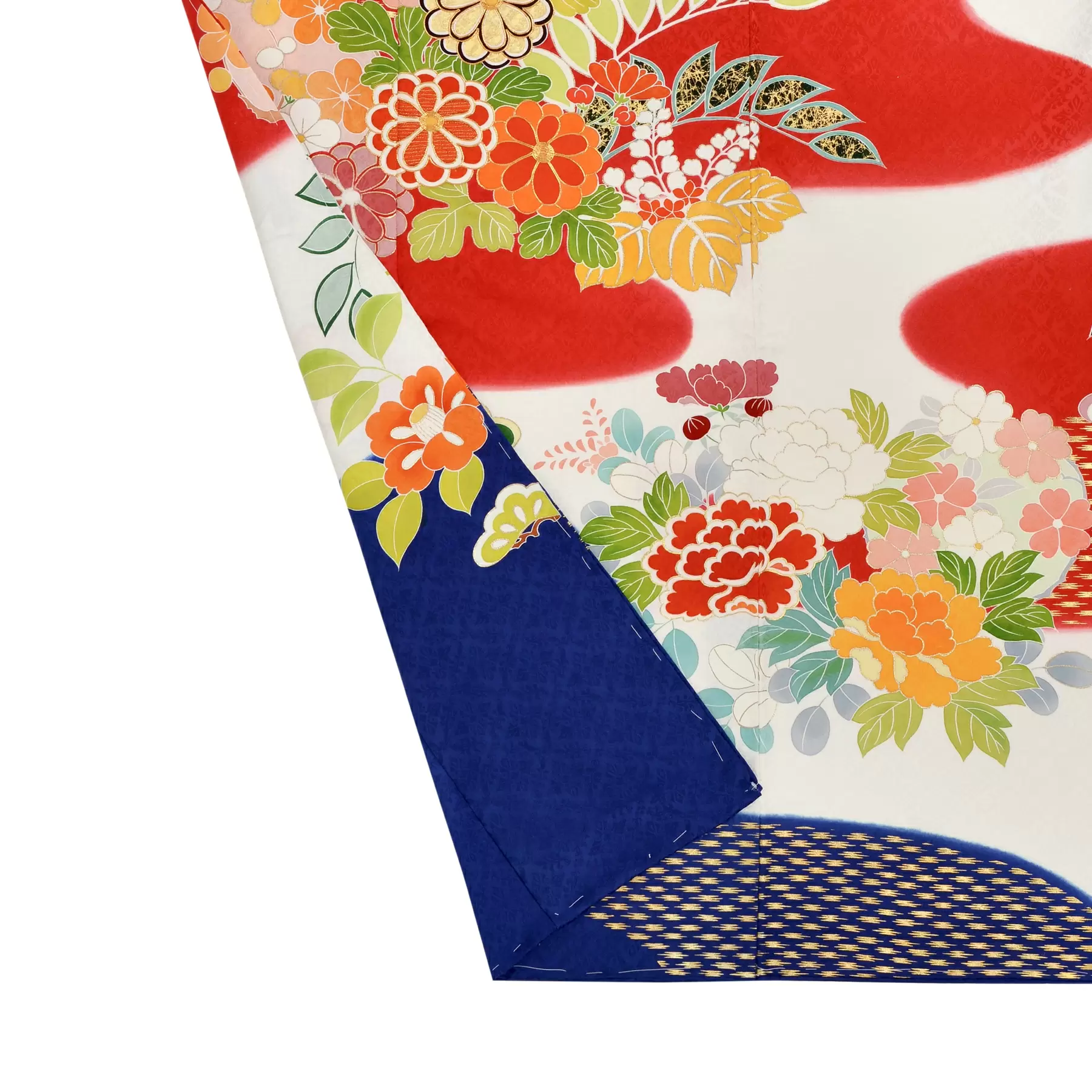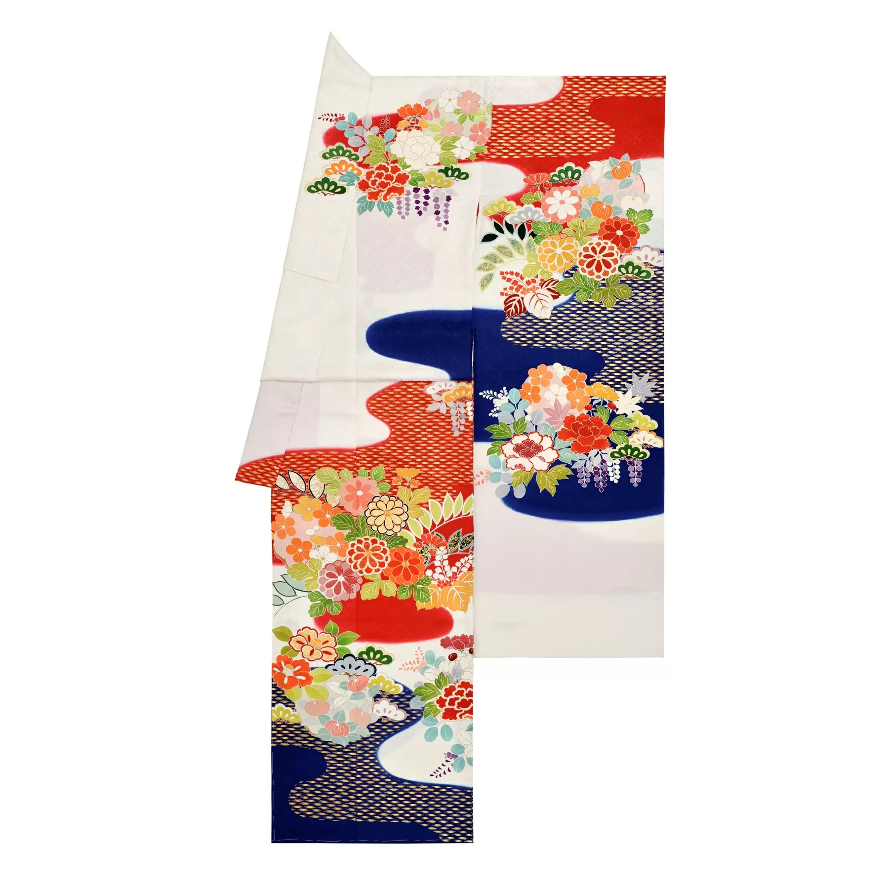 伝統的な能衣裳を参考に、白、赤、青に染分けたトリコロールカラーの地色が印象的な振袖です。花の丸を中心にして描き出される草花が、赤や青の霞の中をたゆたうように配され、幻想的な美しさが漂います。かっこよくお召しになれる一枚です。