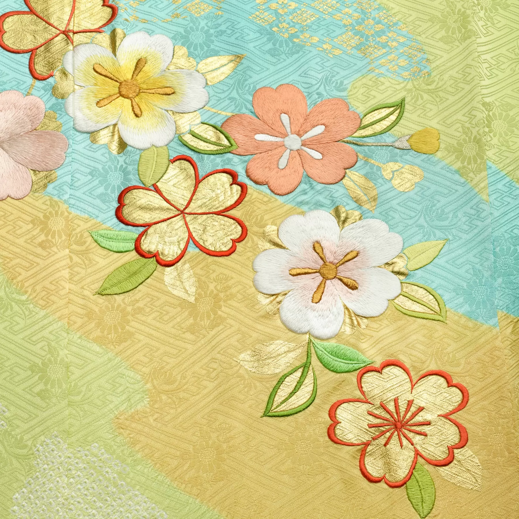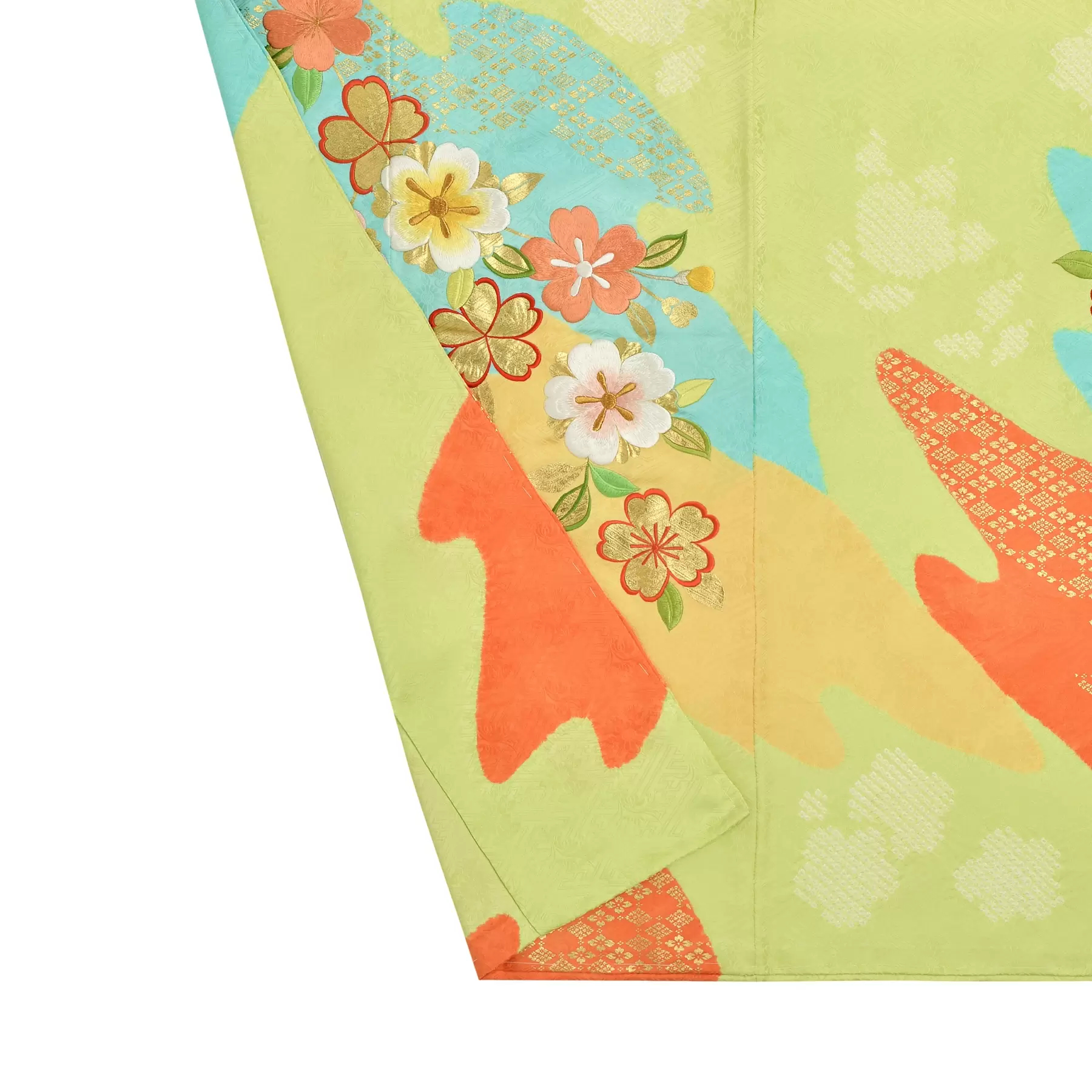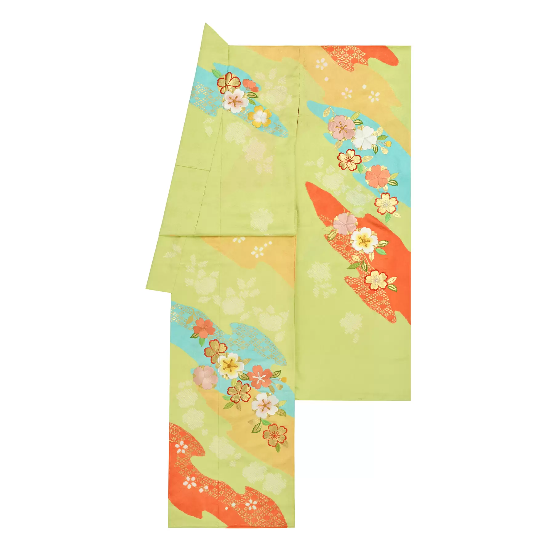 山の稜線、川の流れ、雲のたなびく様などの自然の風景を抽象的に描き出した慶長小袖をベースに、絞りと刺繍の技法で自然の豊かさを描き出した一枚です。透明感のある明るい黄緑の地色を、朱や水色、クリームで染分け、これからの豊かな人生への願いを満開の桜で表現した明るい元気な振袖です。