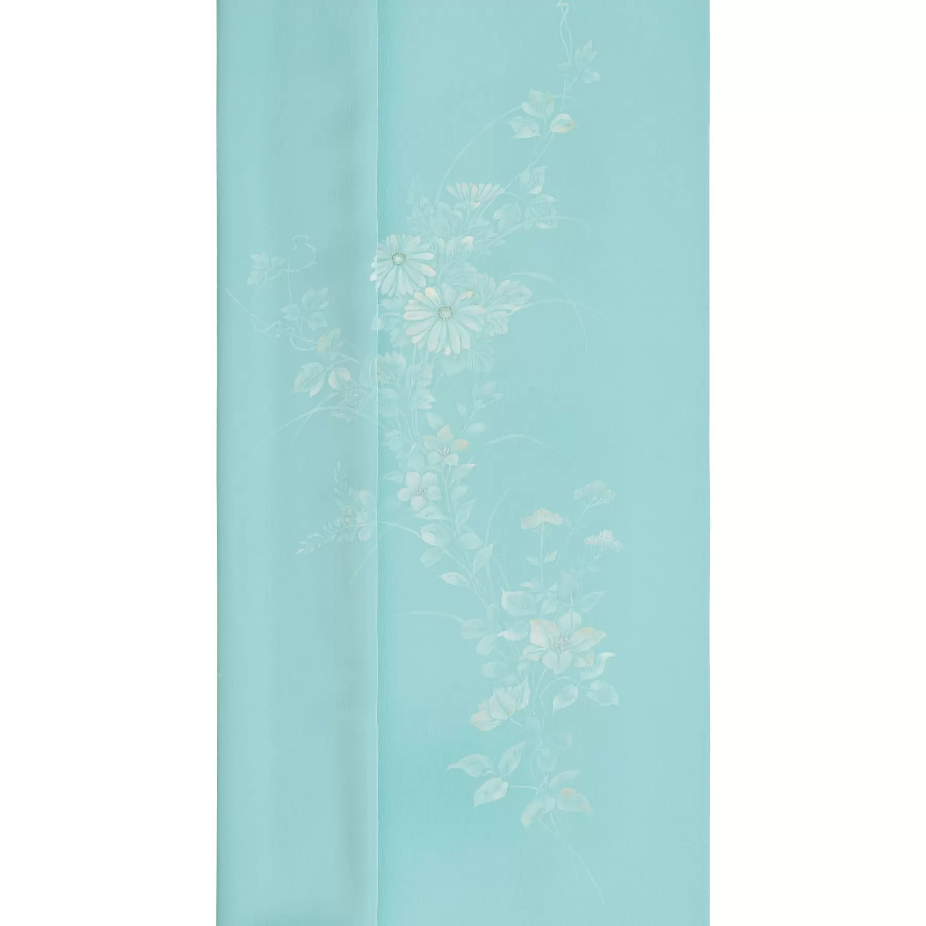 綺麗な空色の地に、白とグレーで夏の花々が生き生きと描かれています。草花が絡まり合い蔓のように伸びる楽しいデザインは、着姿をスラリと見せてくれる効果もあります。