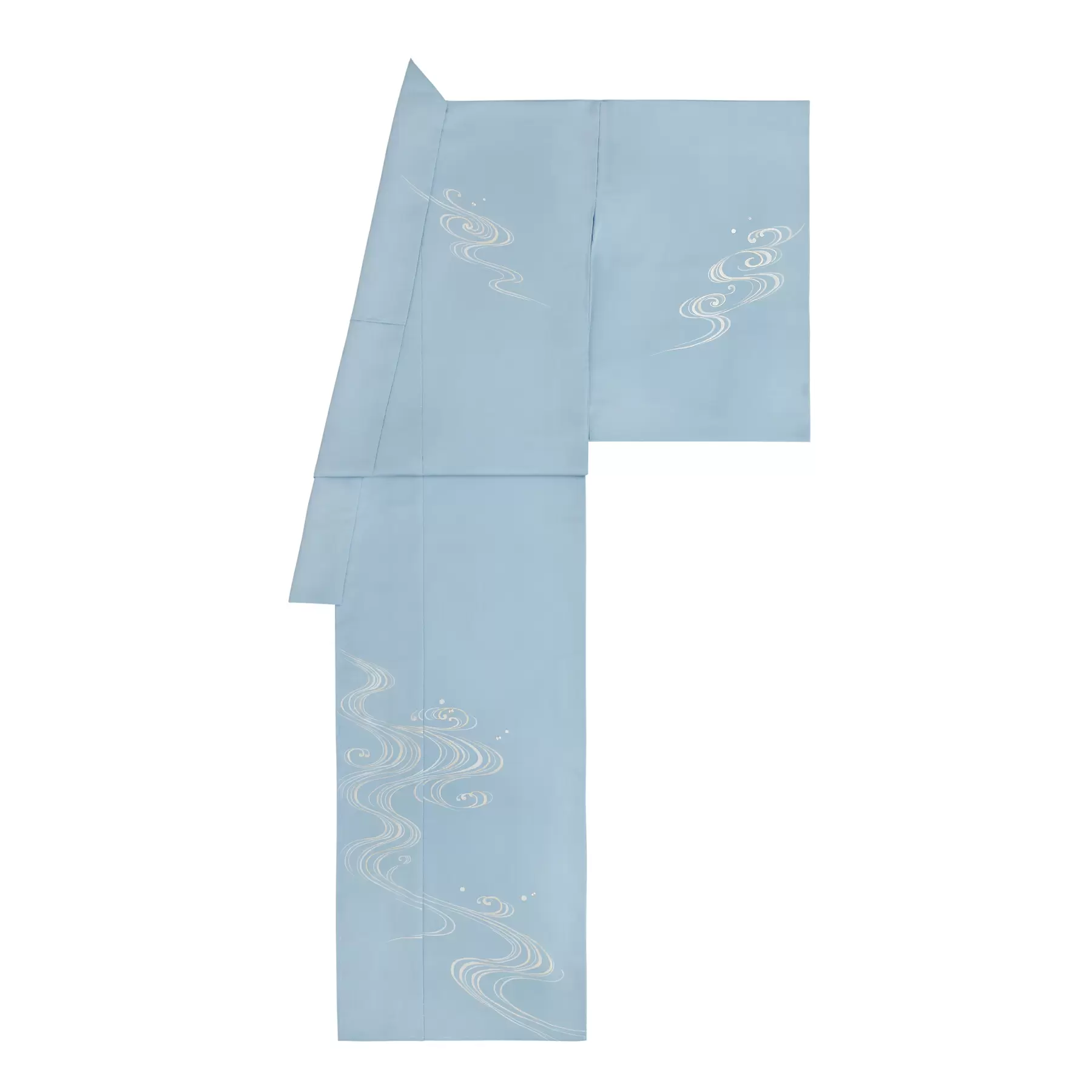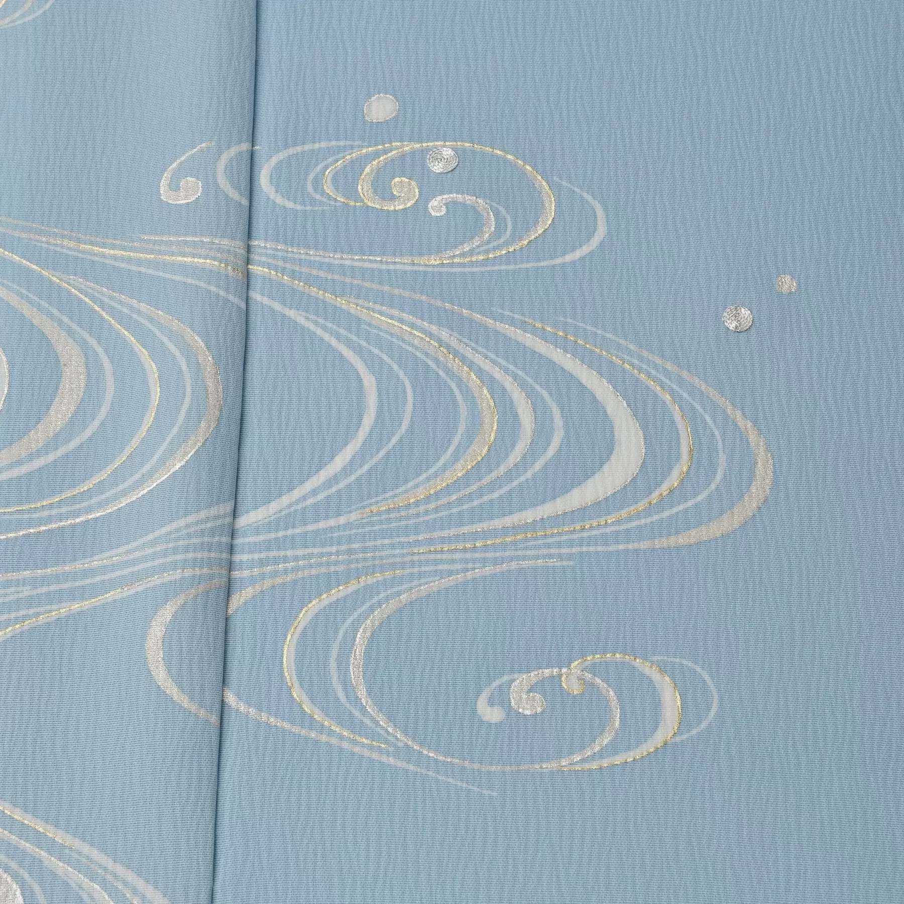 白い曲線の流れが美しい着姿を生み出してくれる軽やかな訪問着です。白と銀で表現された流水に少しだけ金が加わることにより、上品な色気が漂う華やかな一枚に。パーティーからちょっとしたお出かけまで、幅広くお召しいただけます。