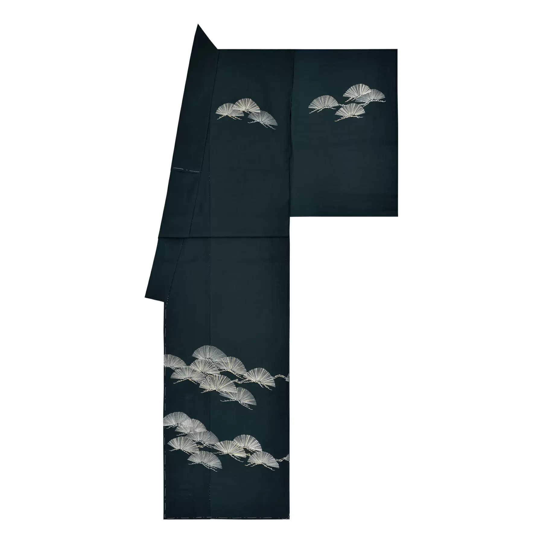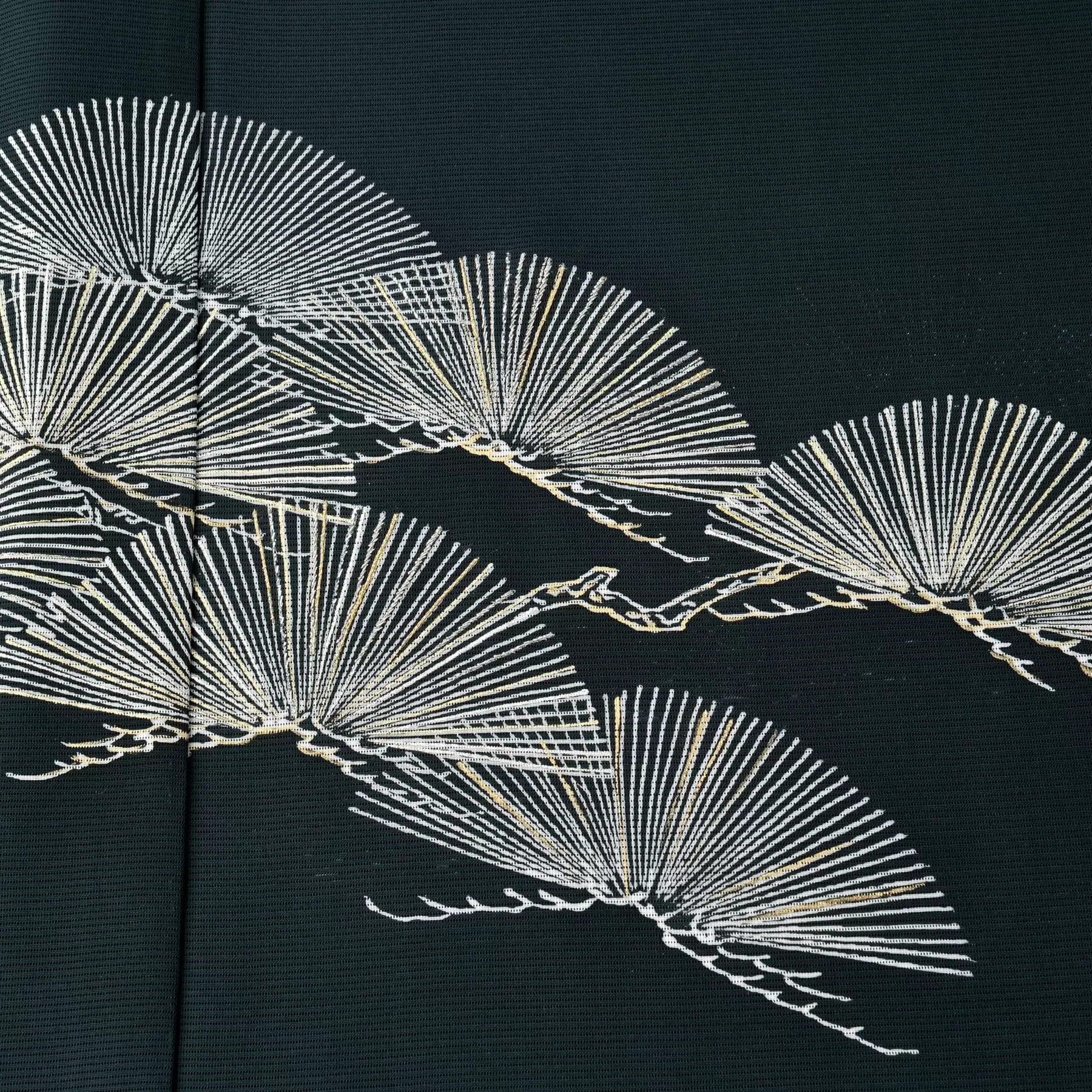 濃緑の地色にリズミカルに繰り返される松の文様が白く浮かび上がる美しいデザインです。モチーフである松は、白、グレー、銀、金の繊細な線で1本1本細かく染め分けられ、銀糸、金糸、ラメ糸を使った刺繍で立体感を表現。