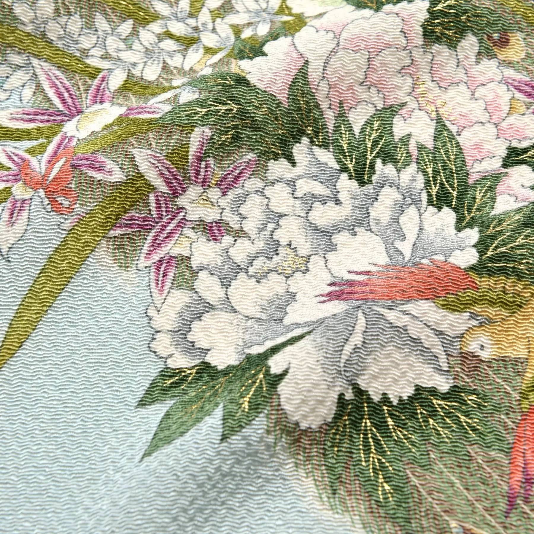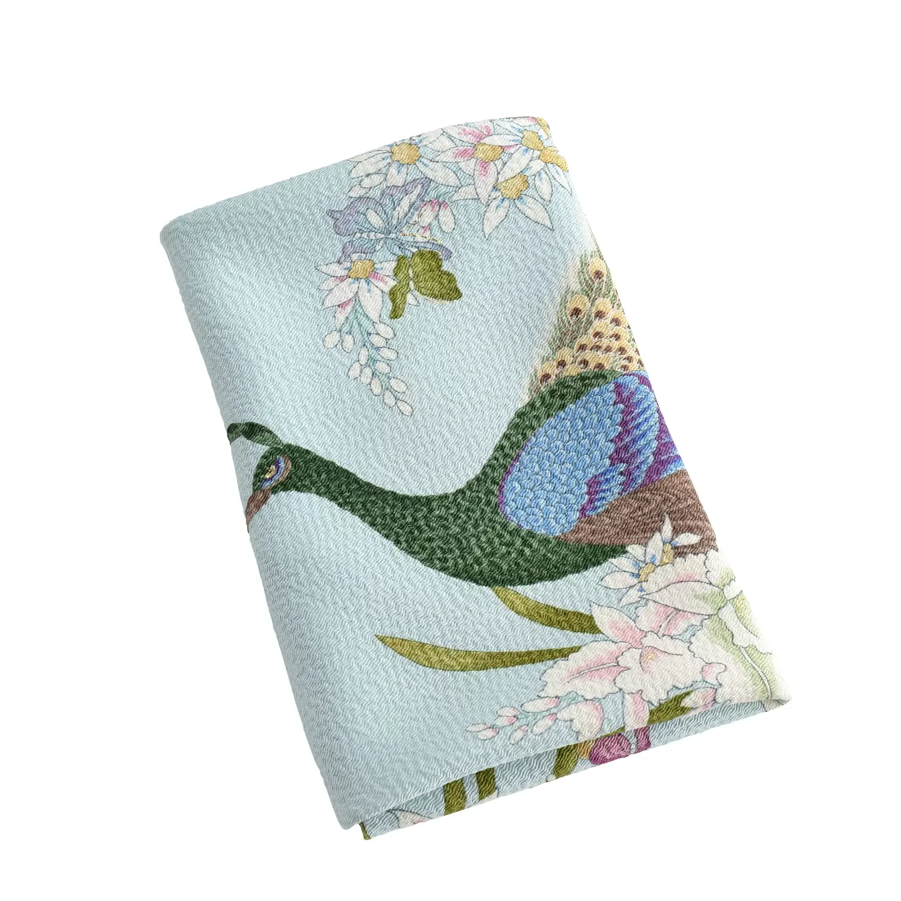 大胆かつ華やかに描かれた二羽の孔雀と四季の花々。雄の孔雀はその美しい姿から、強い生命力や気高さの象徴として古くから婚礼衣装にも用いられてきました。絢爛豪華なデザインは、慶事や晴れの日のギフトにもふさわしい格調ある一品です。