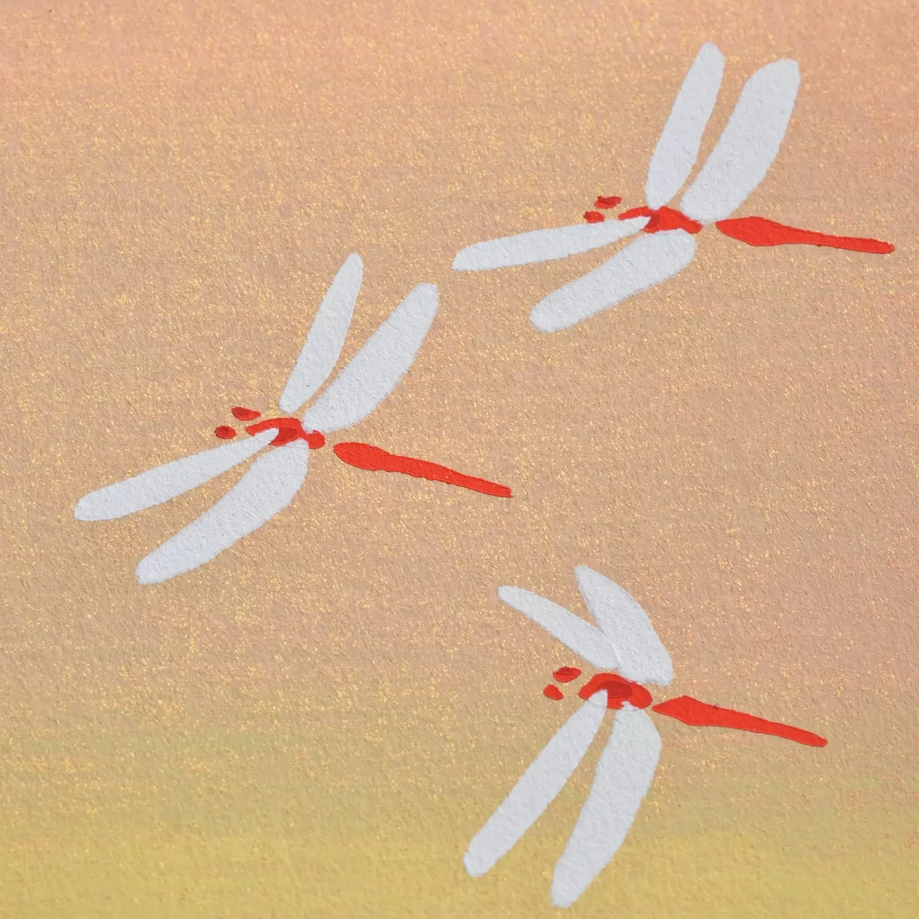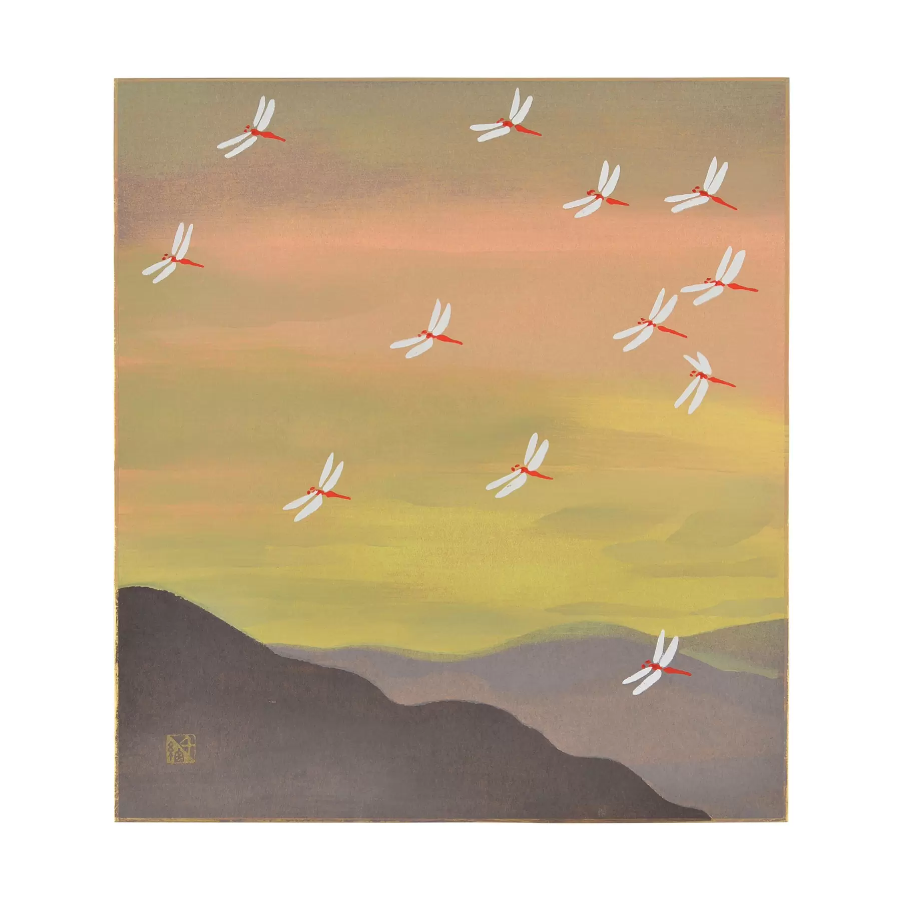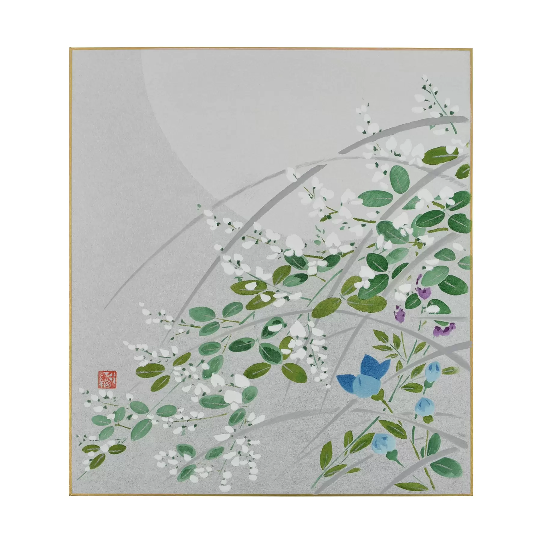 夏が終わり、自然の変化を通して感じる季節の移ろい。果実の実り、赤とんぼの群れ、楓の色づきや、秋の七草。日本の秋の風景を色紙に表現しました。