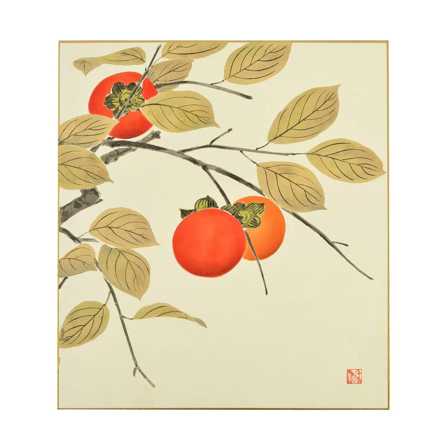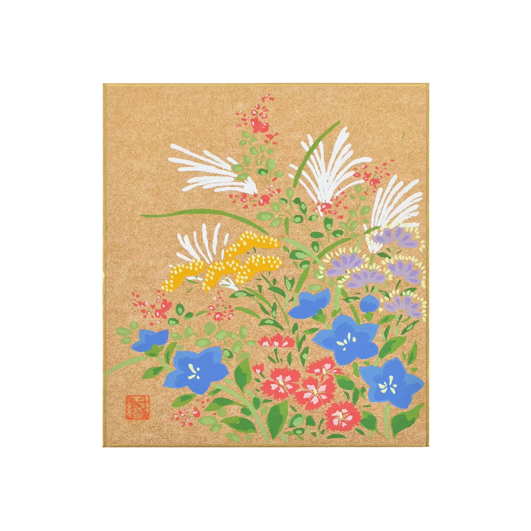夏が終わり、自然の変化を通して感じる季節の移ろい。果実の実り、赤とんぼの群れ、楓の色づきや、秋の七草。日本の秋の風景を色紙に表現しました。
