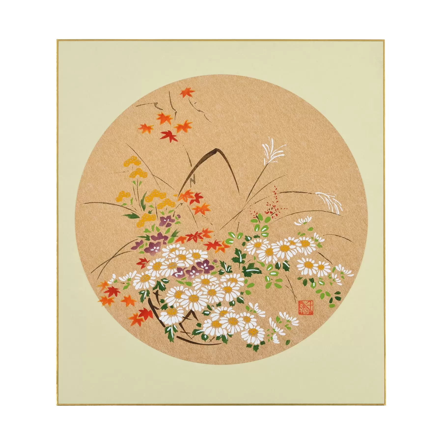 夏が終わり、自然の変化を通して感じる季節の移ろい。果実の実り、赤とんぼの群れ、楓の色づきや、秋の七草。日本の秋の風景を色紙に表現しました。