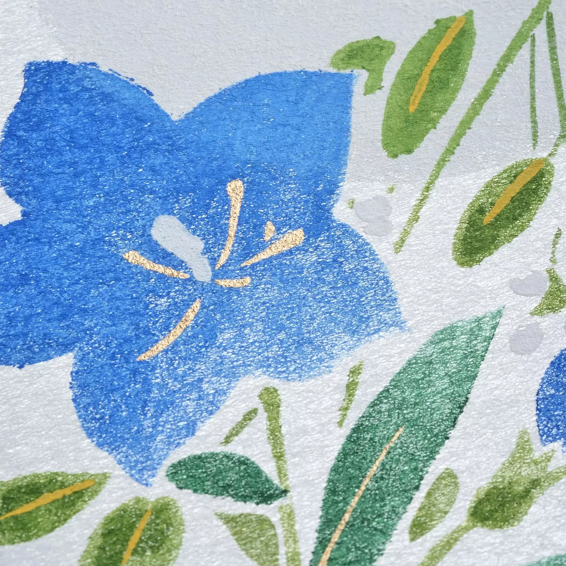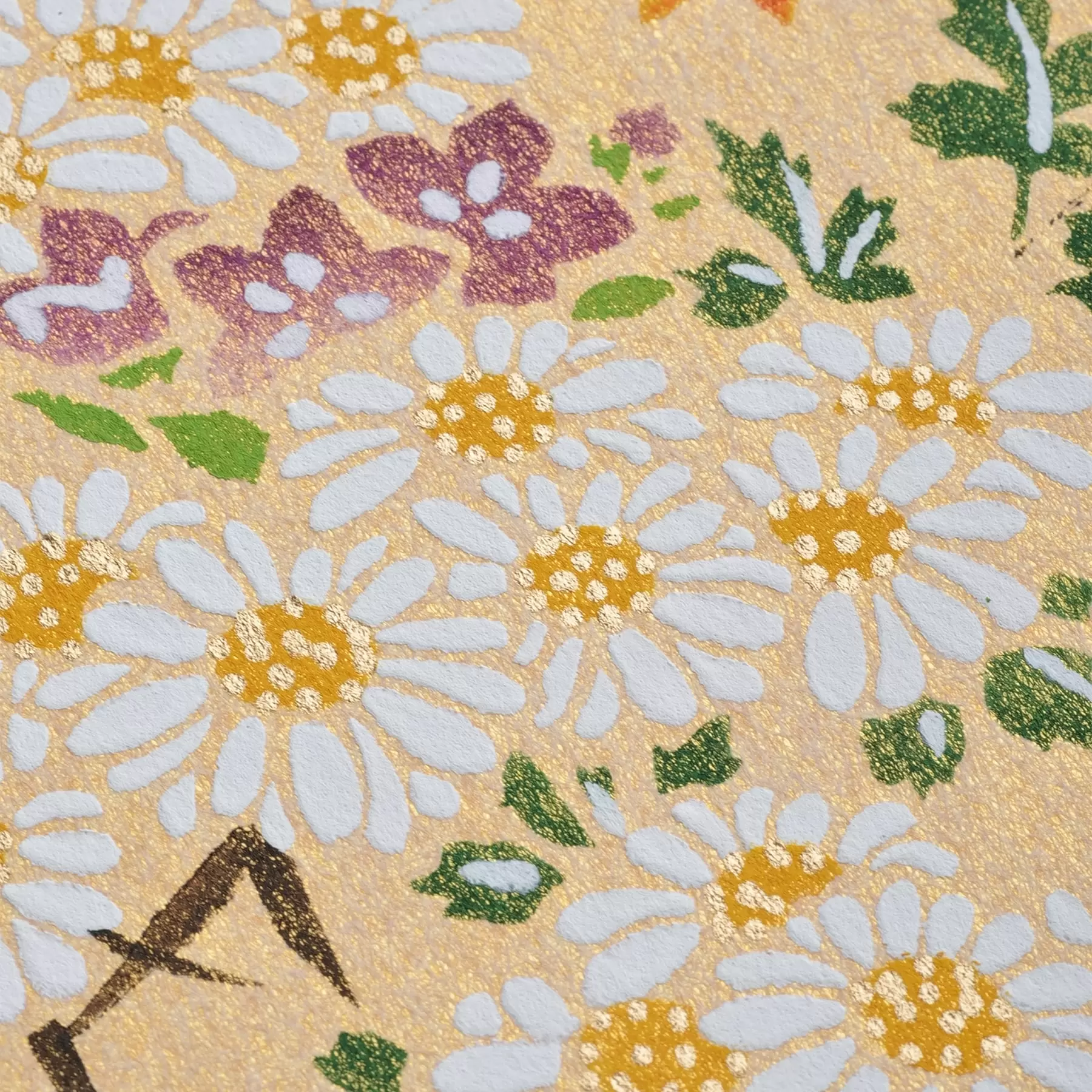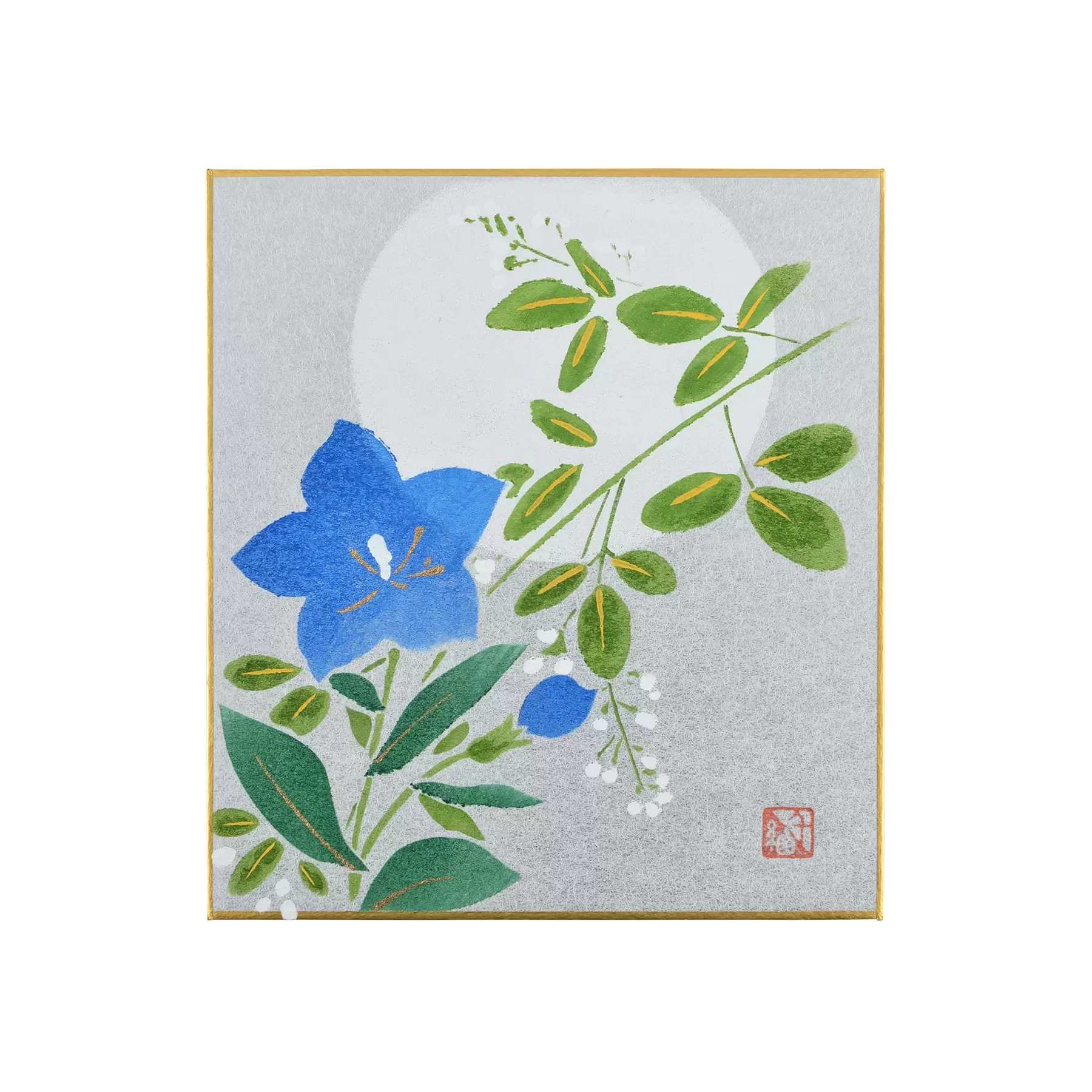 千總が得意とする型友禅の技法で作られたオリジナルの色紙です。染色する色の数だけ型紙を作り、職人が手で一枚一枚刷り上げる「手捺染」という技法が使われています。手作業が生み出すやわらかな風合いや顔料のあざやかな発色が、きもので培われた図案をいきいきと花咲かせます。季節のご挨拶や、お部屋の彩りにお楽しみください。