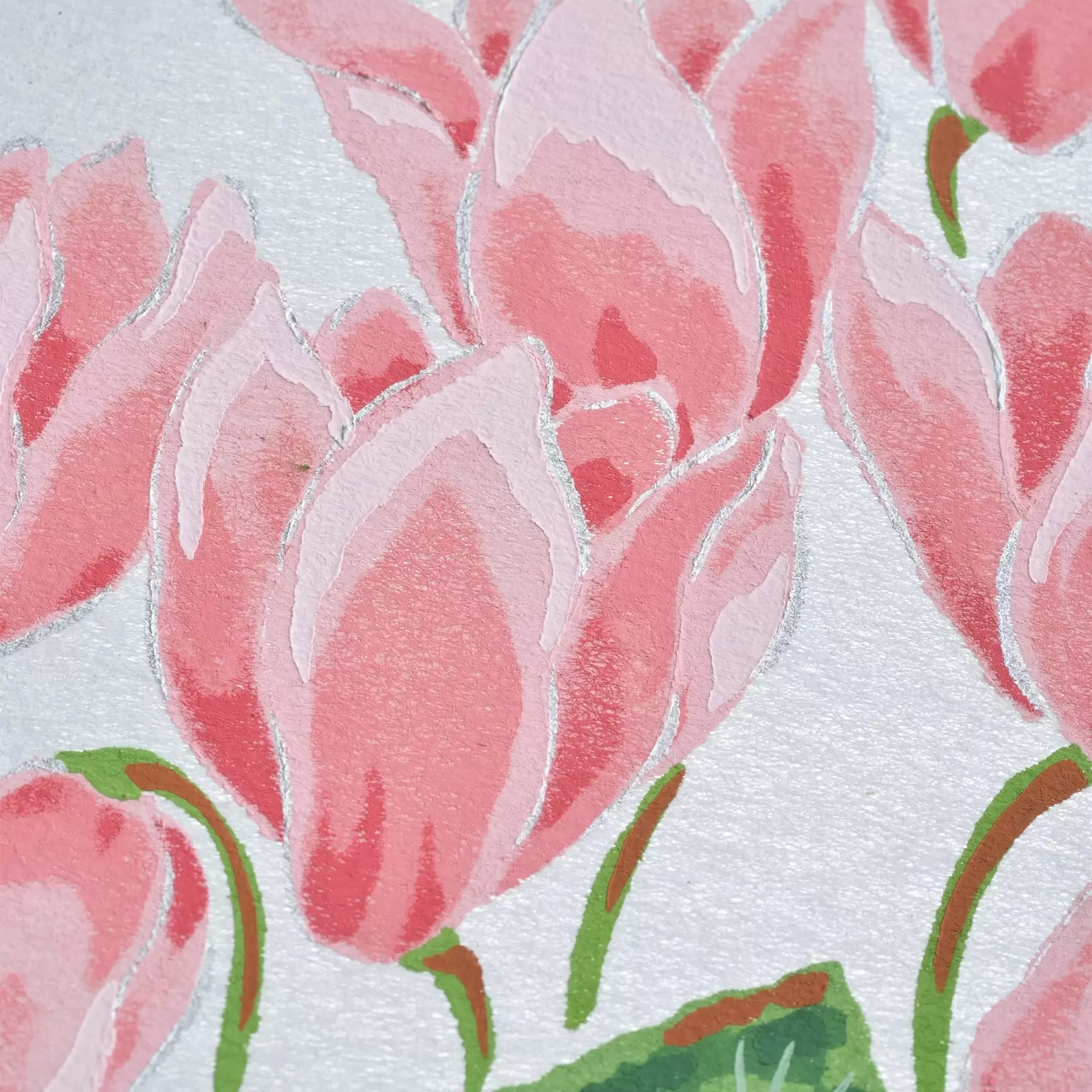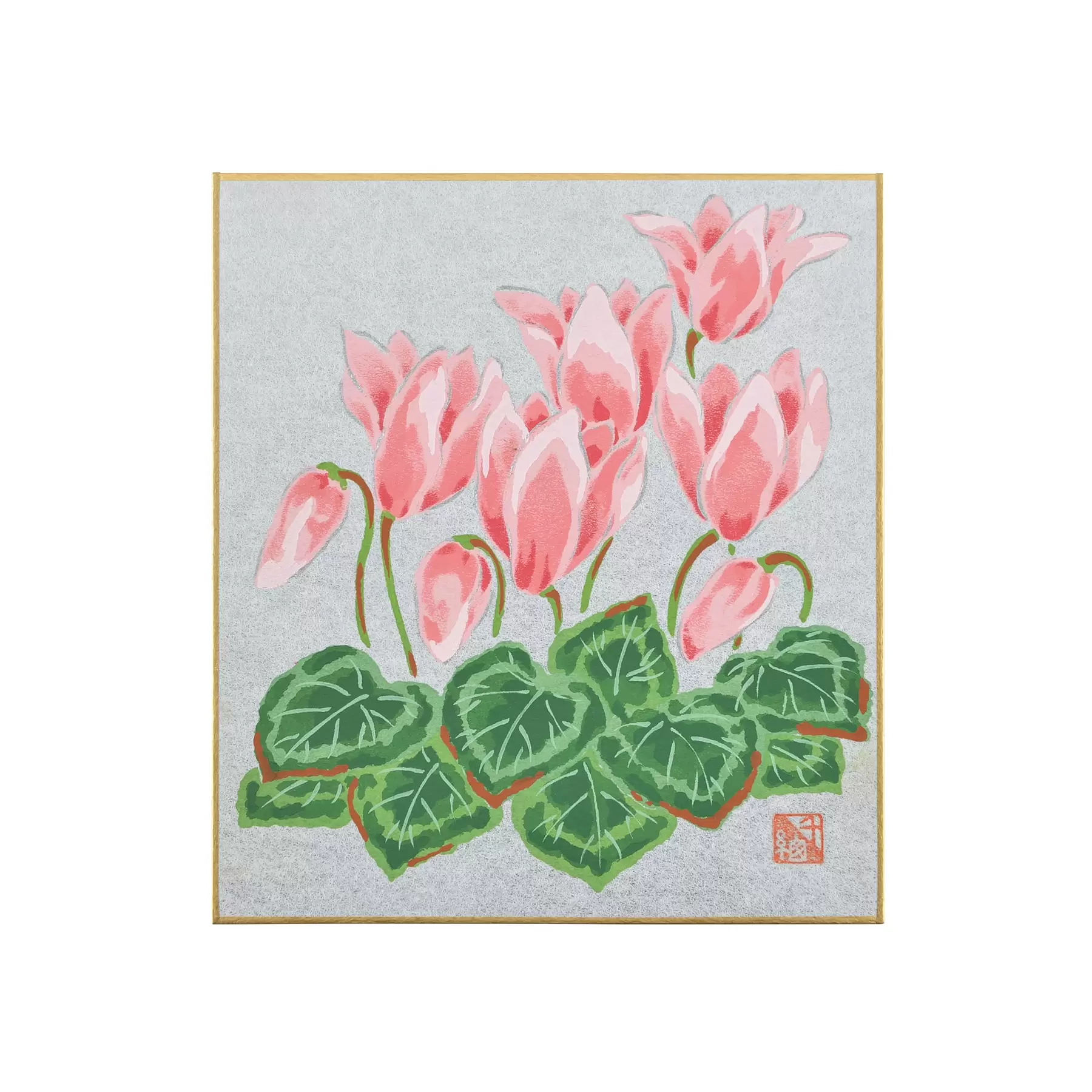 千總が得意とする型友禅の技法で作られたオリジナルの色紙です。染色する色の数だけ型紙を作り、職人が手で一枚一枚刷り上げる「手捺染」という技法が使われています。手作業が生み出すやわらかな風合いや顔料のあざやかな発色が、きもので培われた図案をいきいきと花咲かせます。季節のご挨拶や、お部屋の彩りにお楽しみください。