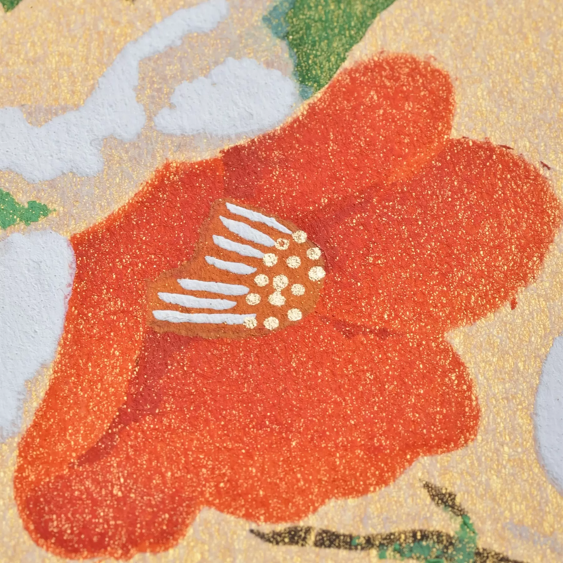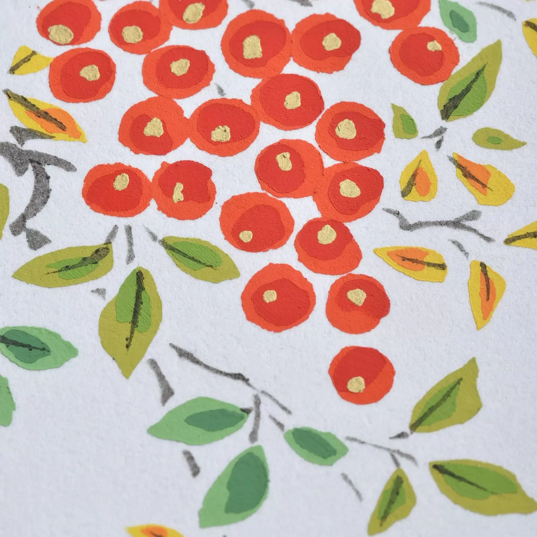 千總が得意とする型友禅の技法で作られたオリジナルの色紙です。染色する色の数だけ型紙を作り、職人が手で一枚一枚刷り上げる「手捺染」という技法が使われています。手作業が生み出すやわらかな風合いや顔料のあざやかな発色が、きもので培われた図案をいきいきと花咲かせます。季節のご挨拶や、お部屋の彩りにお楽しみください。