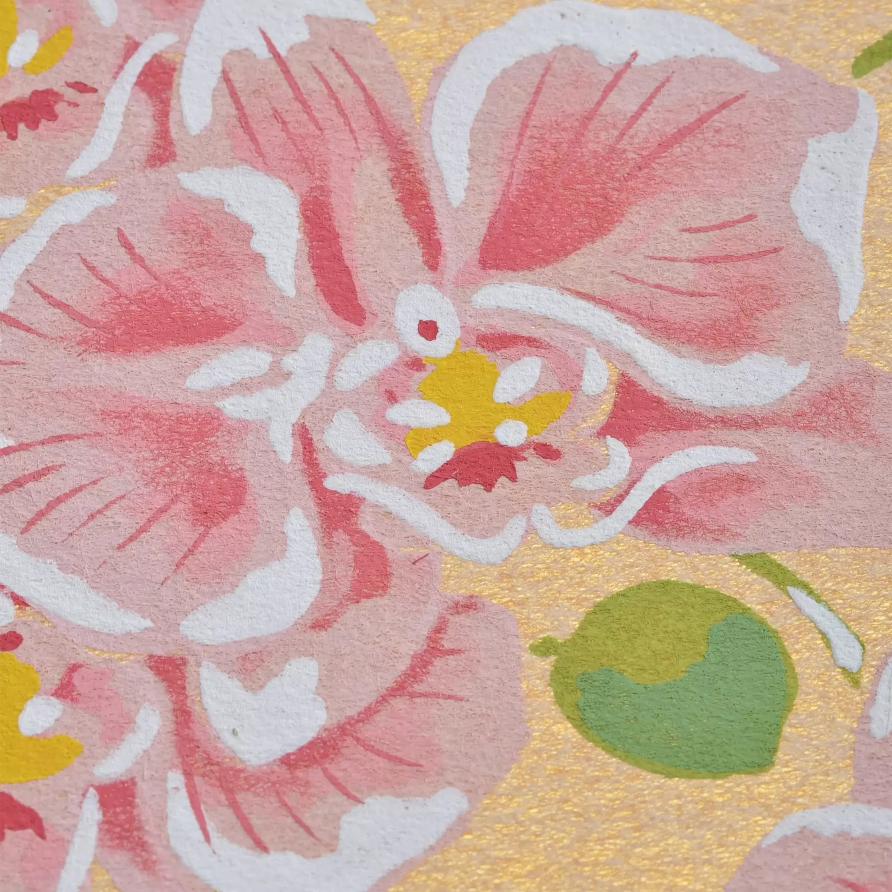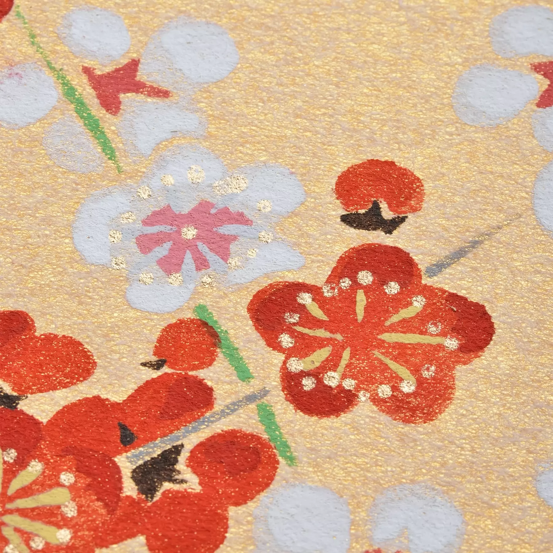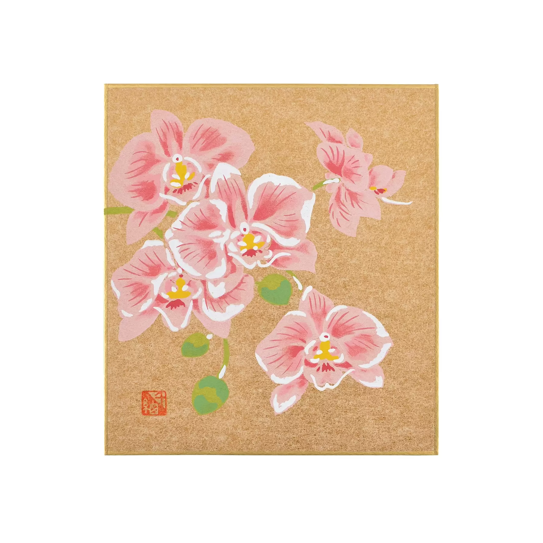 千總が得意とする型友禅の技法で作られたオリジナルの色紙です。染色する色の数だけ型紙を作り、職人が手で一枚一枚刷り上げる「手捺染」という技法が使われています。手作業が生み出すやわらかな風合いや顔料のあざやかな発色が、きもので培われた図案をいきいきと花咲かせます。季節のご挨拶や、お部屋の彩りにお楽しみください。