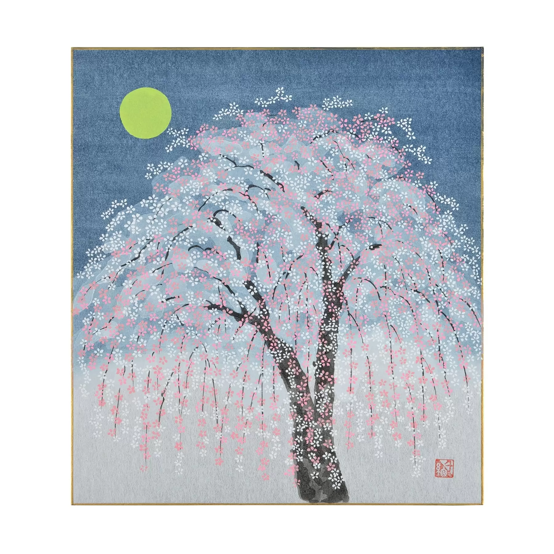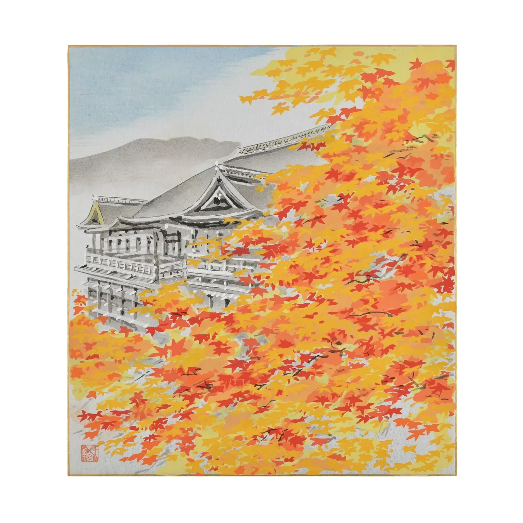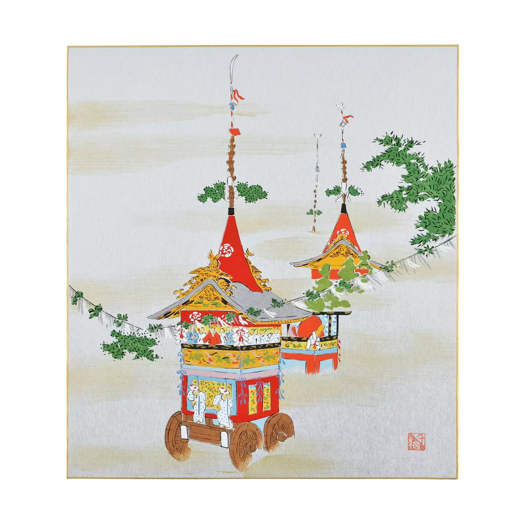 千總が得意とする型友禅の技法で作られたオリジナルの色紙です。染色する色の数だけ型紙を作り、職人が手で一枚一枚刷り上げる「手捺染」という技法が使われています。手作業が生み出すやわらかな風合いや顔料のあざやかな発色が、きもので培われた図案をいきいきと花咲かせます。季節のご挨拶や、お部屋の彩りにお楽しみください。