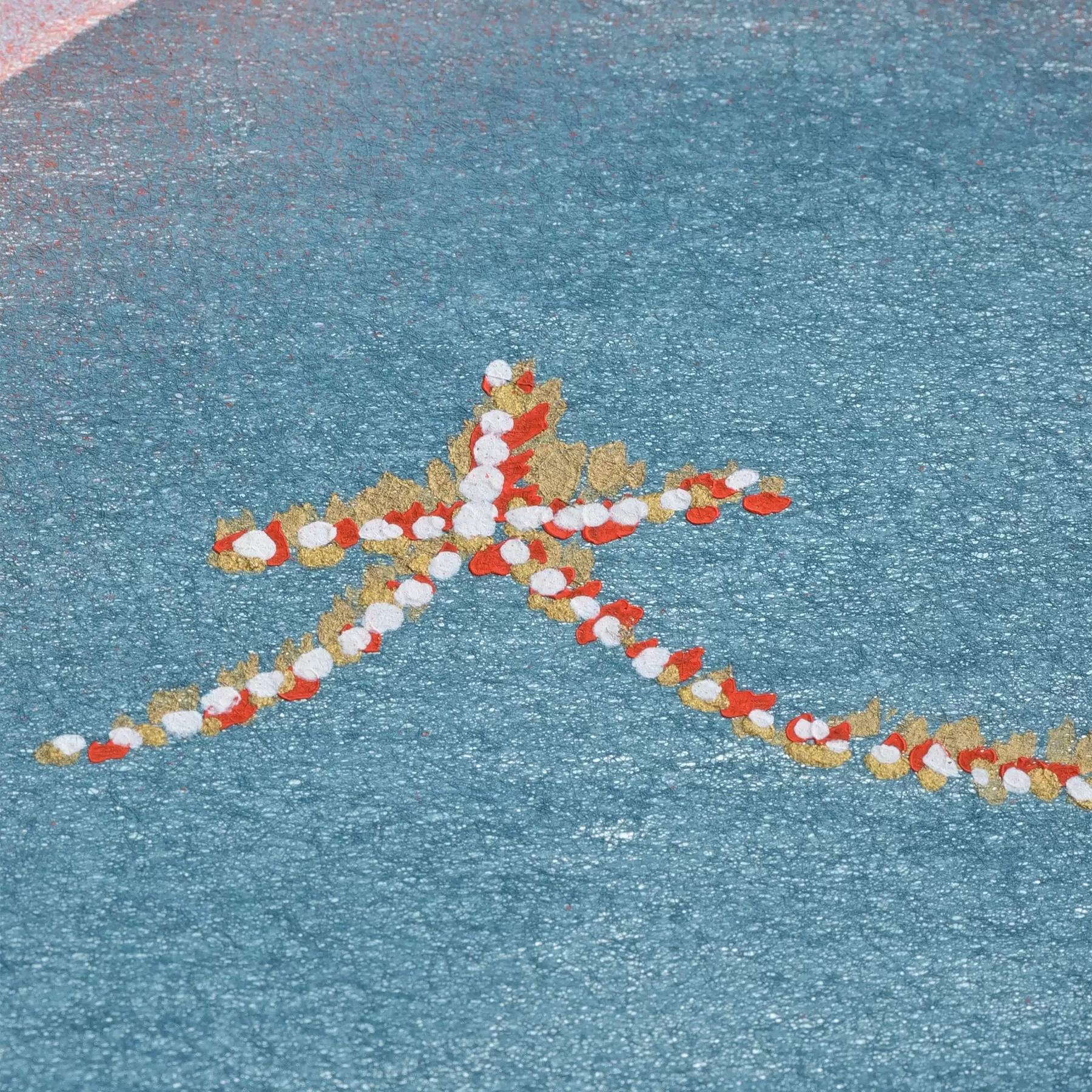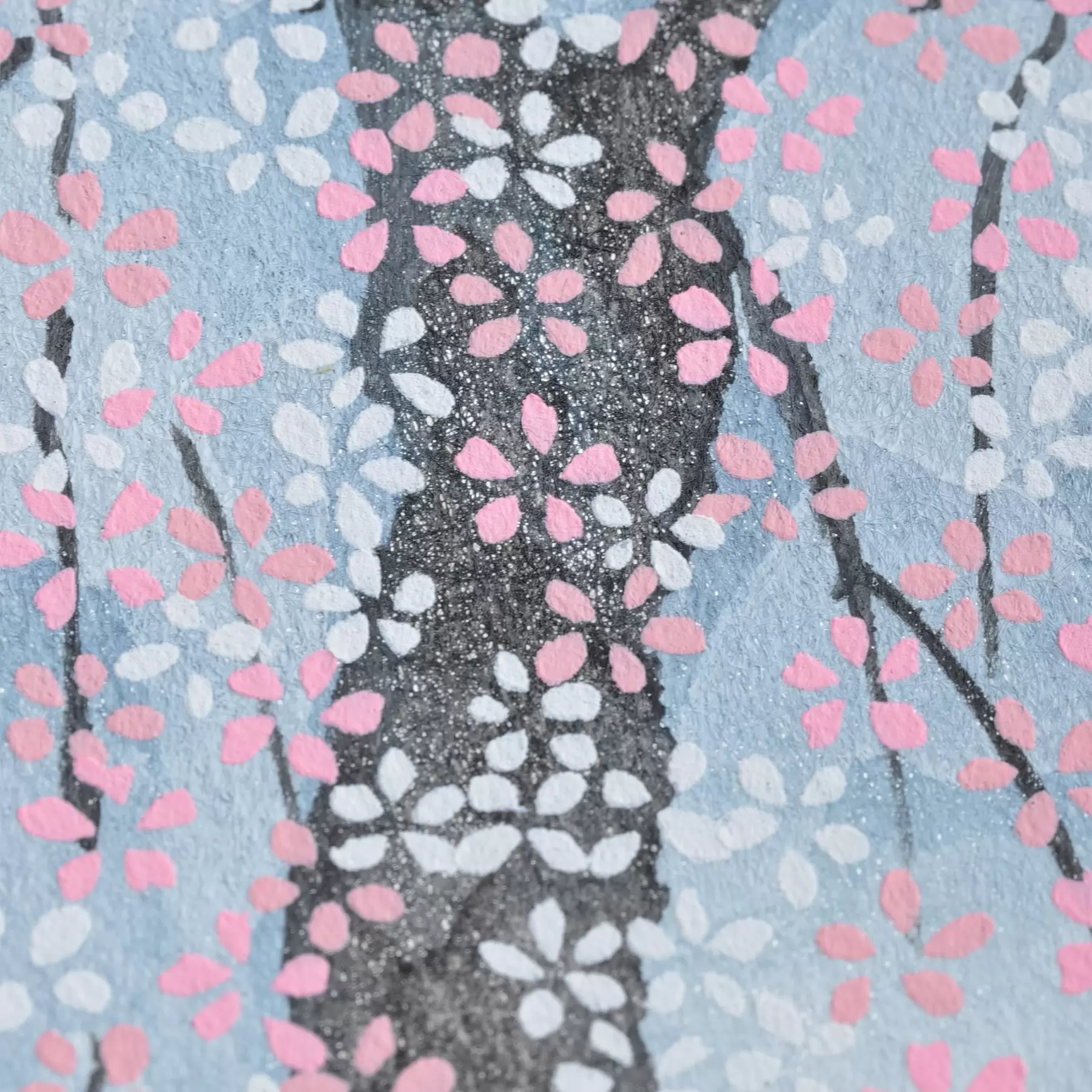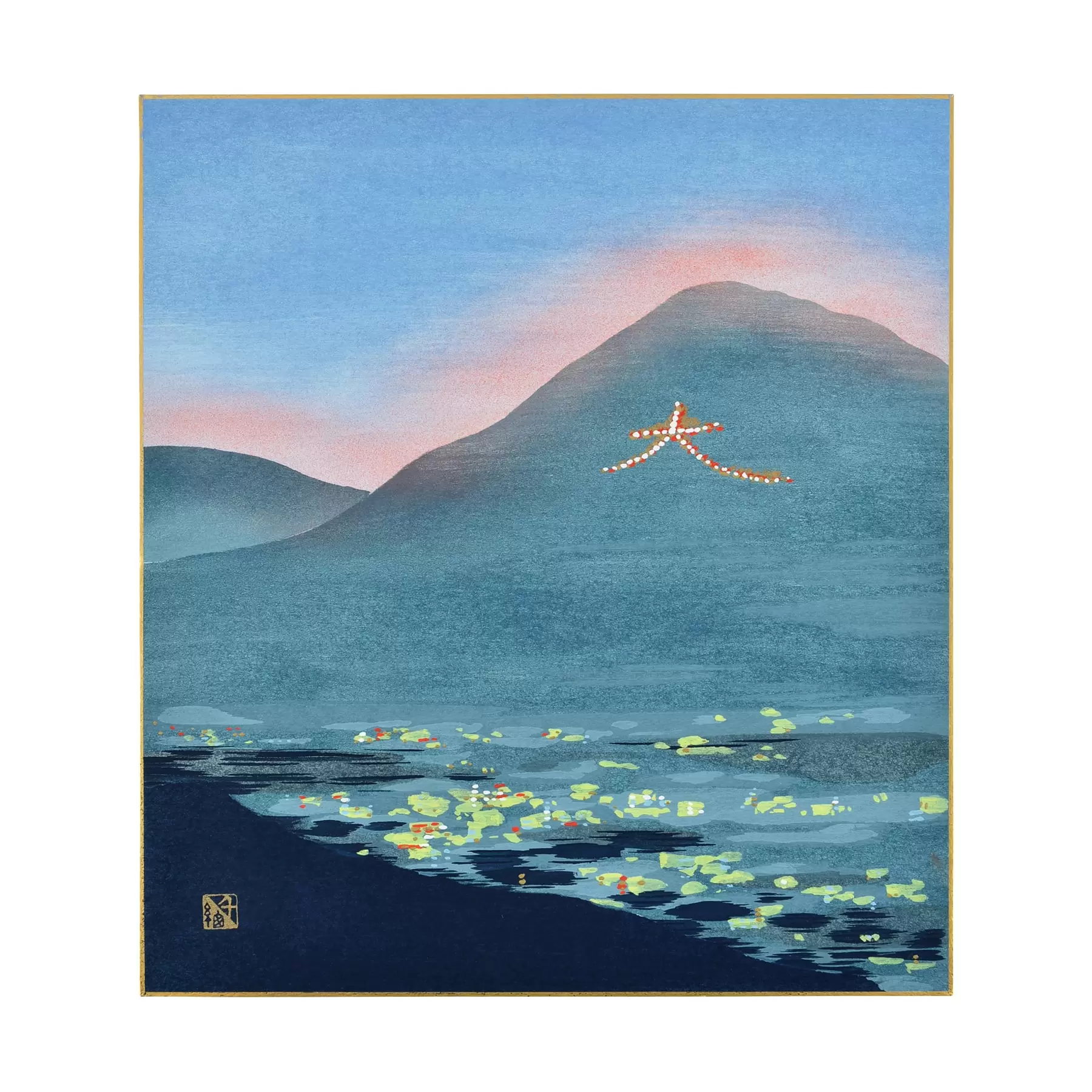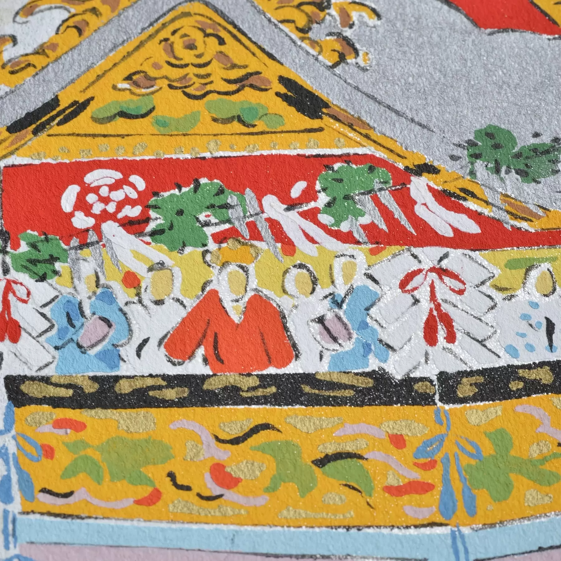 千總が得意とする型友禅の技法で作られたオリジナルの色紙です。染色する色の数だけ型紙を作り、職人が手で一枚一枚刷り上げる「手捺染」という技法が使われています。手作業が生み出すやわらかな風合いや顔料のあざやかな発色が、きもので培われた図案をいきいきと花咲かせます。季節のご挨拶や、お部屋の彩りにお楽しみください。