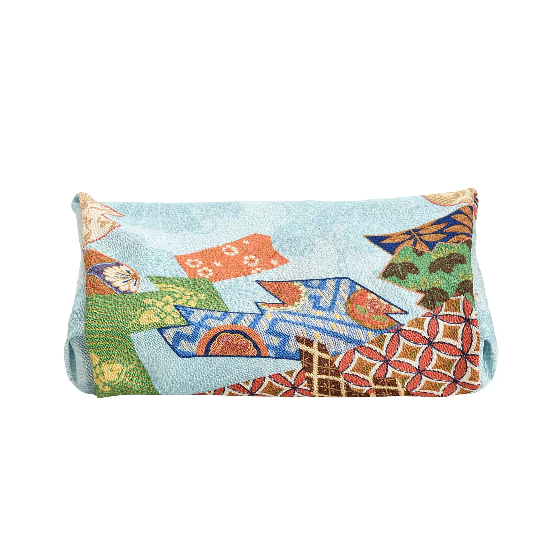 千總が所蔵する江戸末期の小袖をモチーフにした名物裂文様の風呂敷。大陸より伝来した裂の中でも、豪華さや優美さ、染織技術や造形美に優れたものが名物裂といわれ、今でも珍重されています。その名物裂をリズミカルに配したこの風呂敷は、包み方によっていくつもの表情を楽しむことが出来ます。末広がりの扇がさりげなく散らされ、慶事や晴れの日のギフトにもふさわしい格調ある一品です。