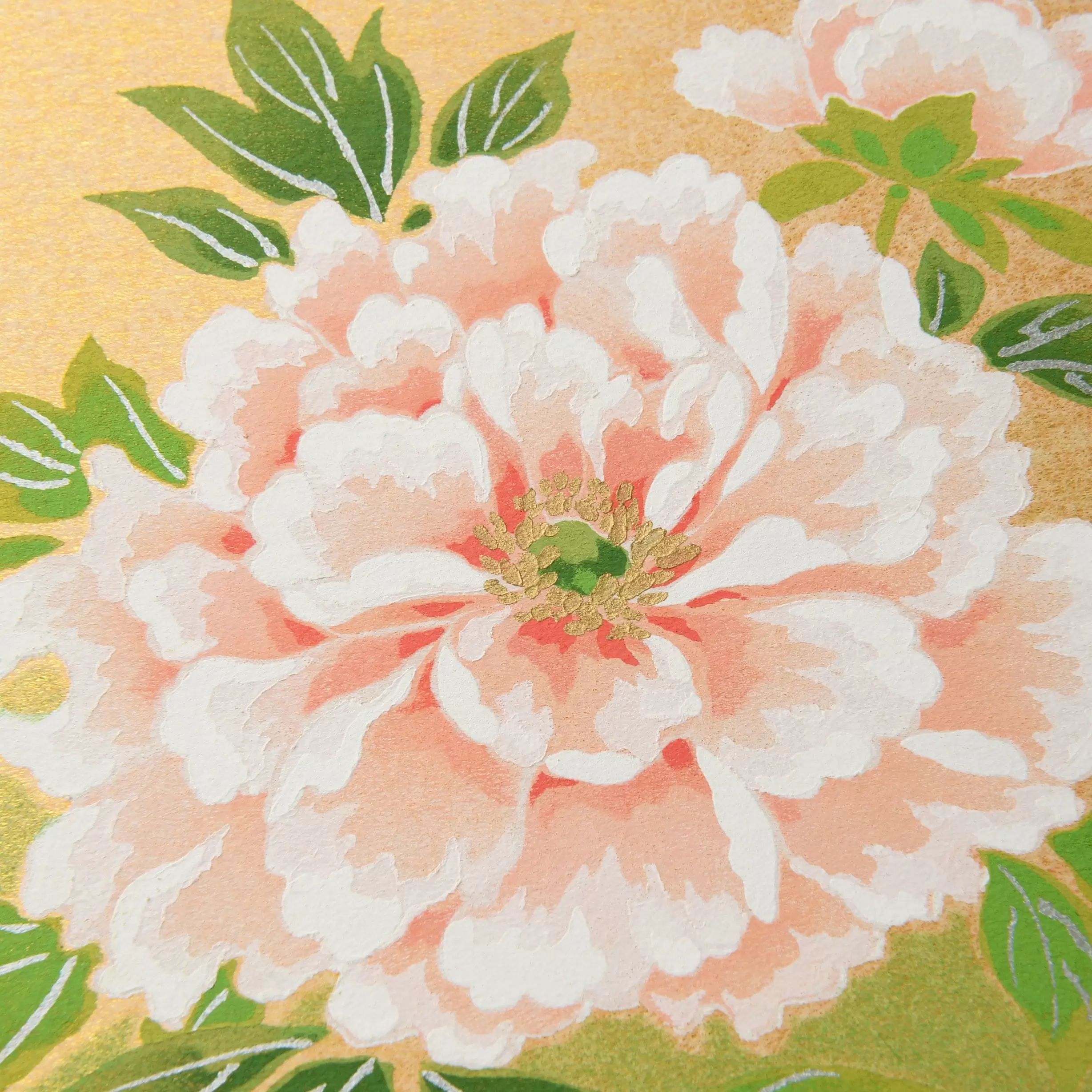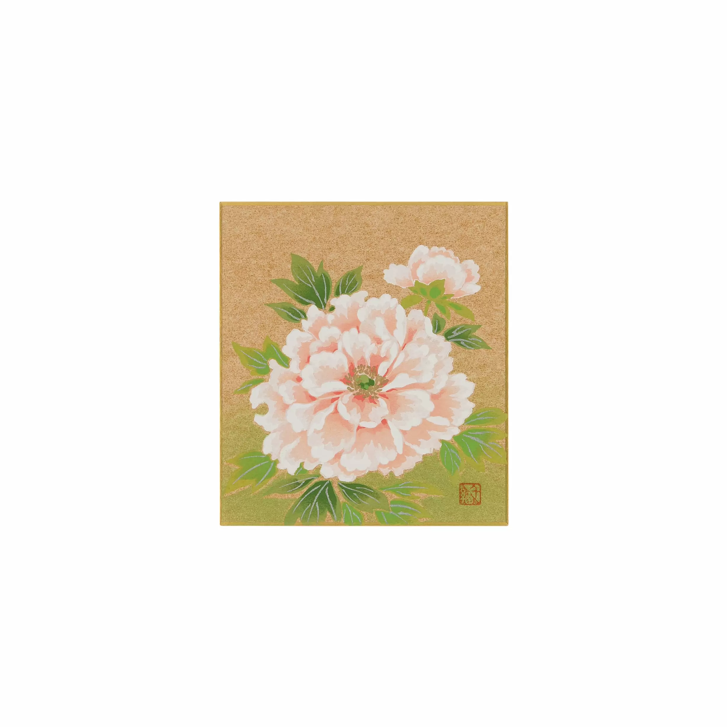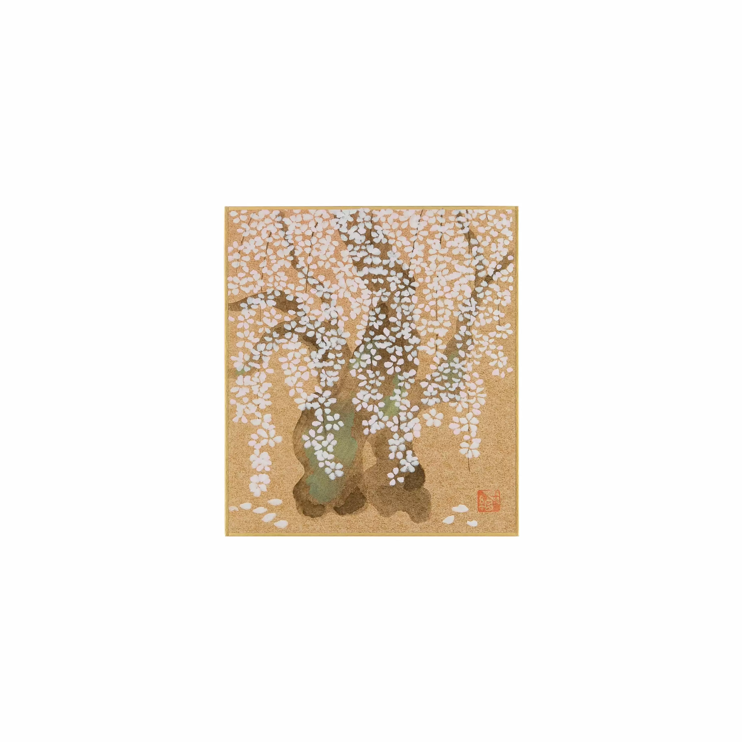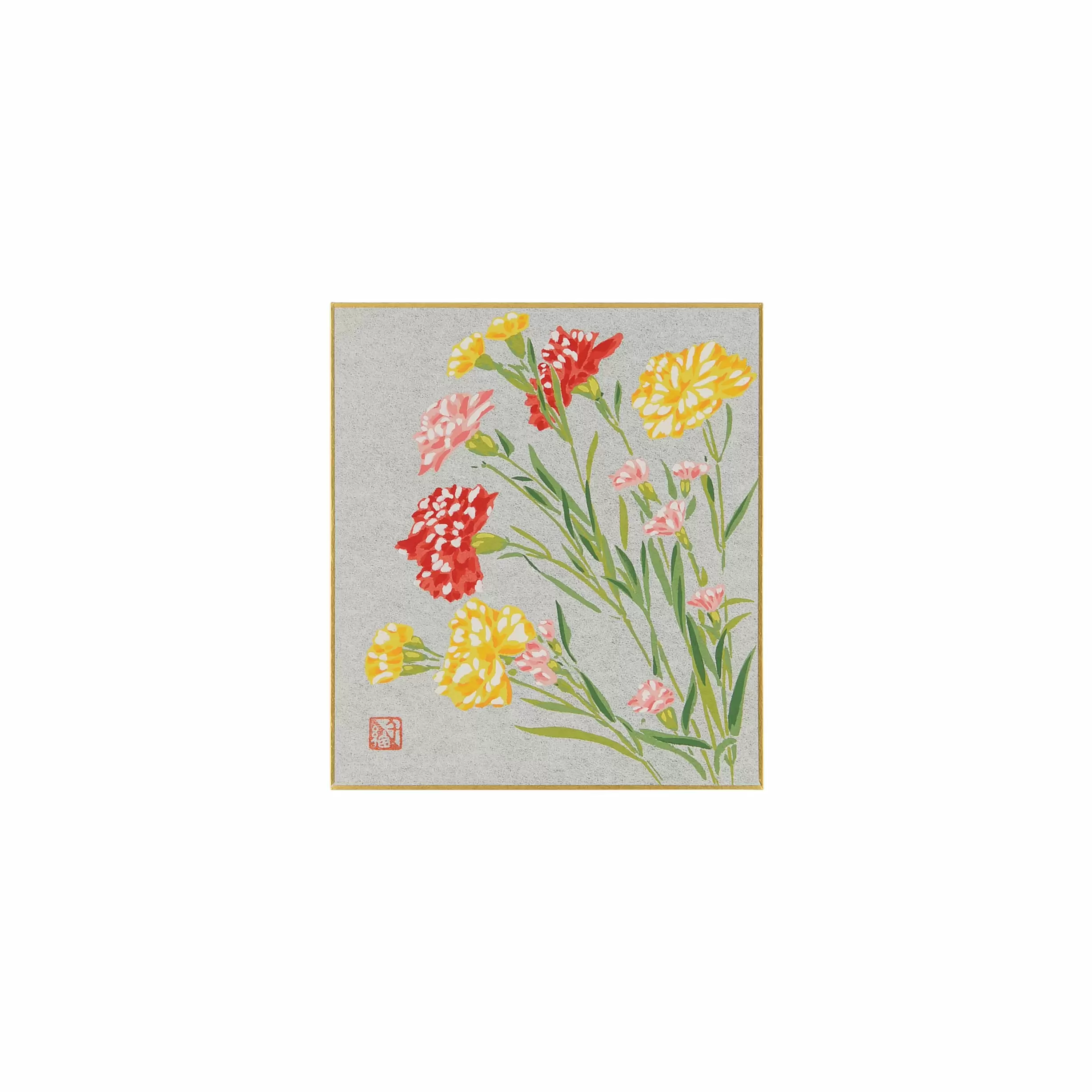 千總が得意とする型友禅の技法で作られたオリジナルの色紙です。染色する色の数だけ型紙を作り、職人が手で一枚一枚刷り上げる「手捺染」という技法が使われています。手作業が生み出すやわらかな風合いや顔料のあざやかな発色が、きもので培われた図案をいきいきと花咲かせます。季節のご挨拶や、お部屋の彩りにお楽しみください。