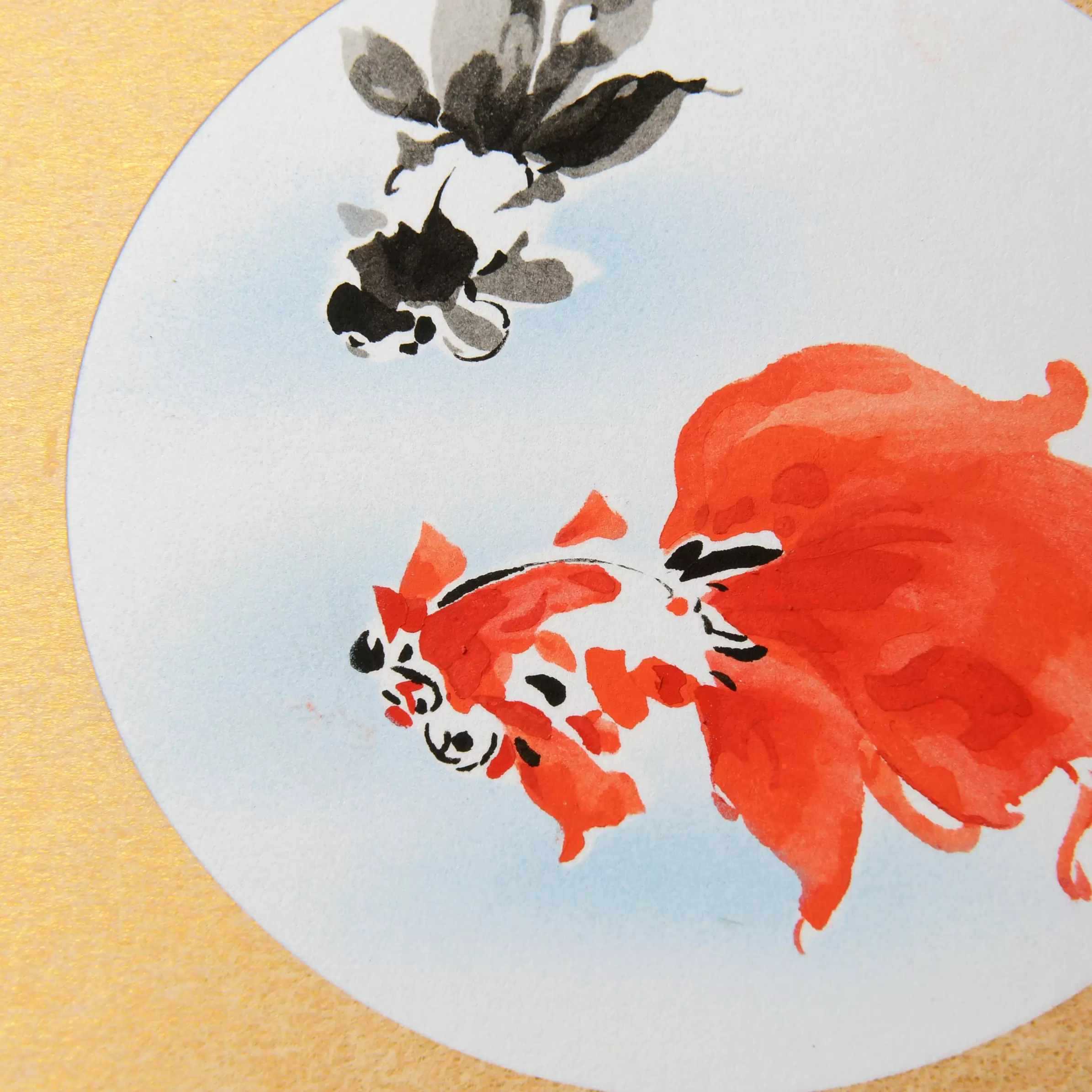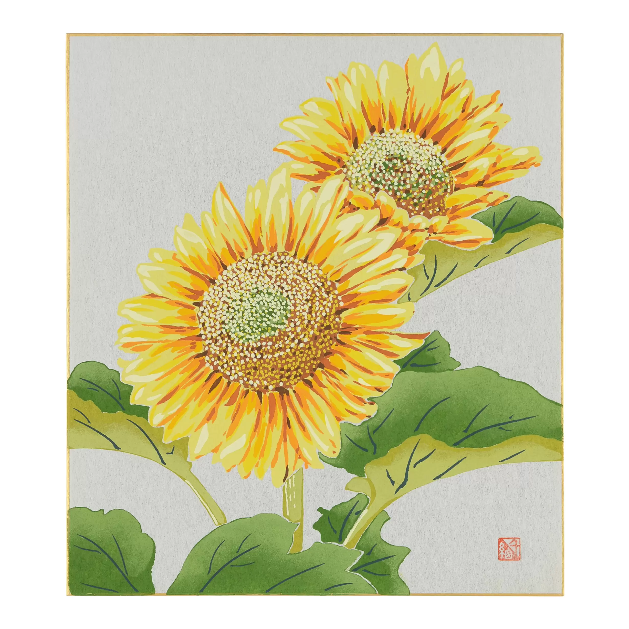 千總が得意とする型友禅の技法で作られたオリジナルの色紙です。染色する色の数だけ型紙を作り、職人が手で一枚一枚刷り上げる「手捺染」という技法が使われています。手作業が生み出すやわらかな風合いや顔料のあざやかな発色が、きもので培われた図案をいきいきと花咲かせます。季節のご挨拶や、お部屋の彩りにお楽しみください。
