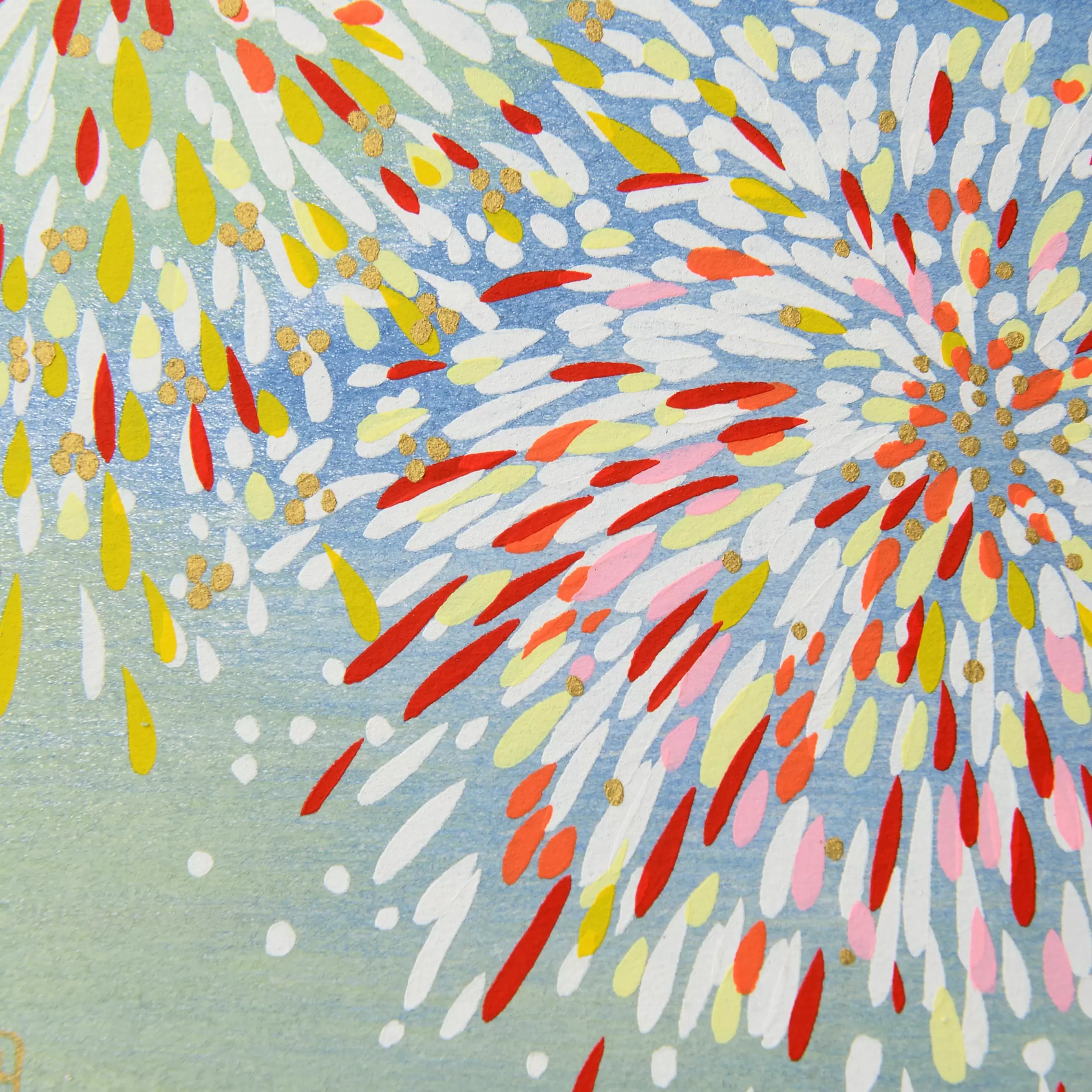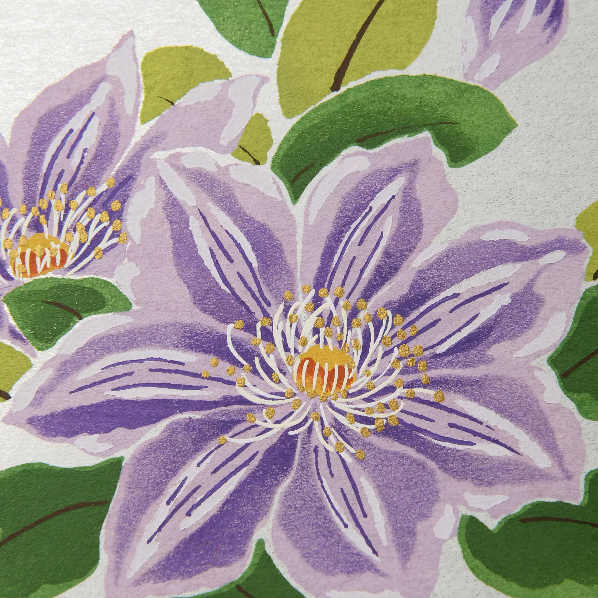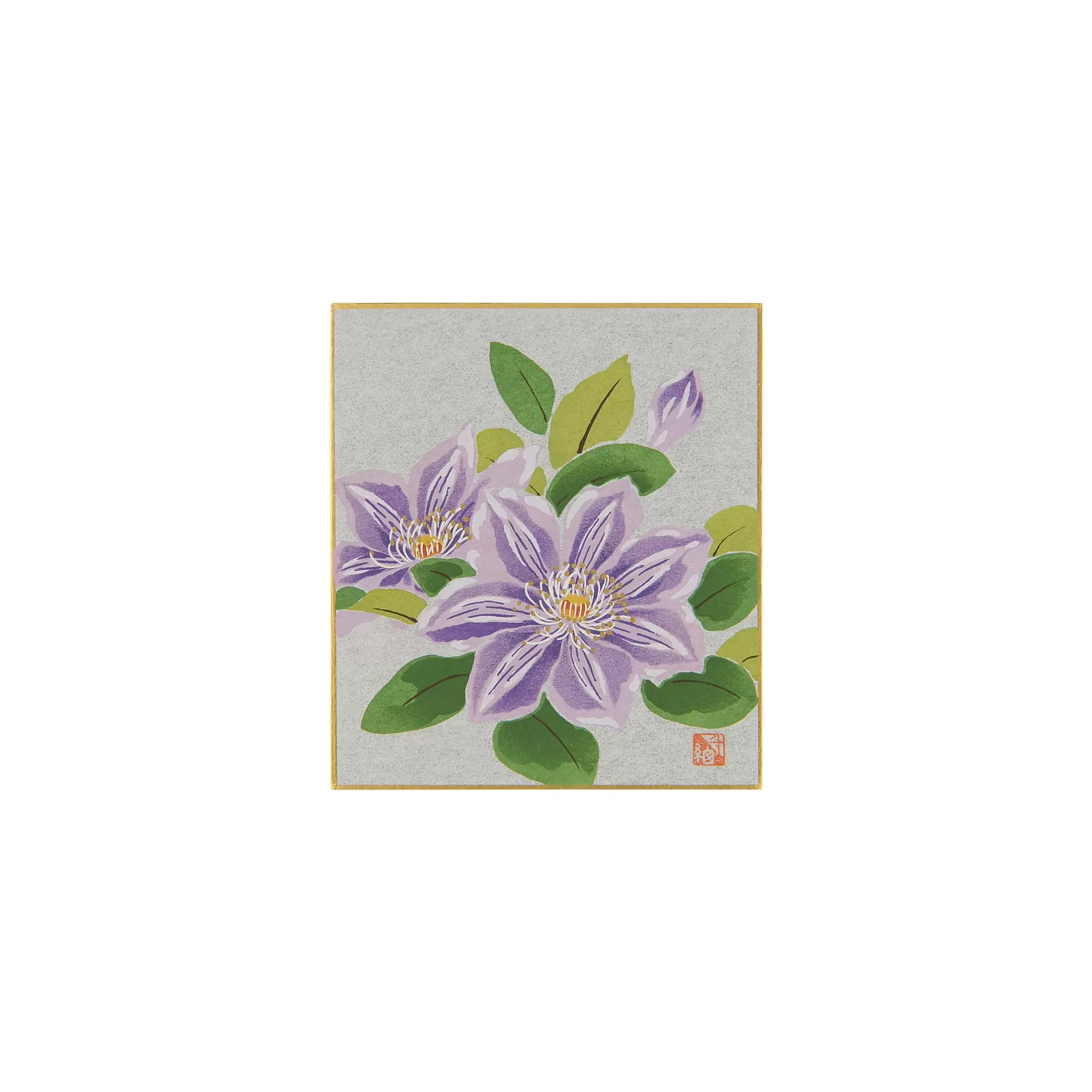 千總が得意とする型友禅の技法で作られたオリジナルの色紙です。染色する色の数だけ型紙を作り、職人が手で一枚一枚刷り上げる「手捺染」という技法が使われています。手作業が生み出すやわらかな風合いや顔料のあざやかな発色が、きもので培われた図案をいきいきと花咲かせます。季節のご挨拶や、お部屋の彩りにお楽しみください。