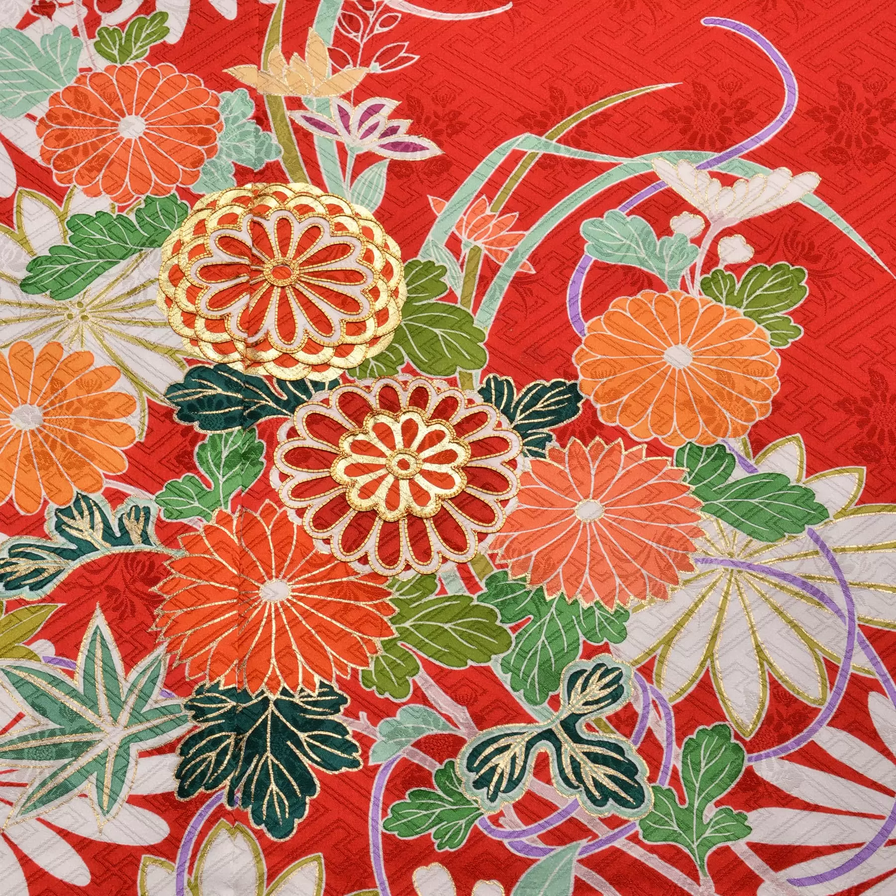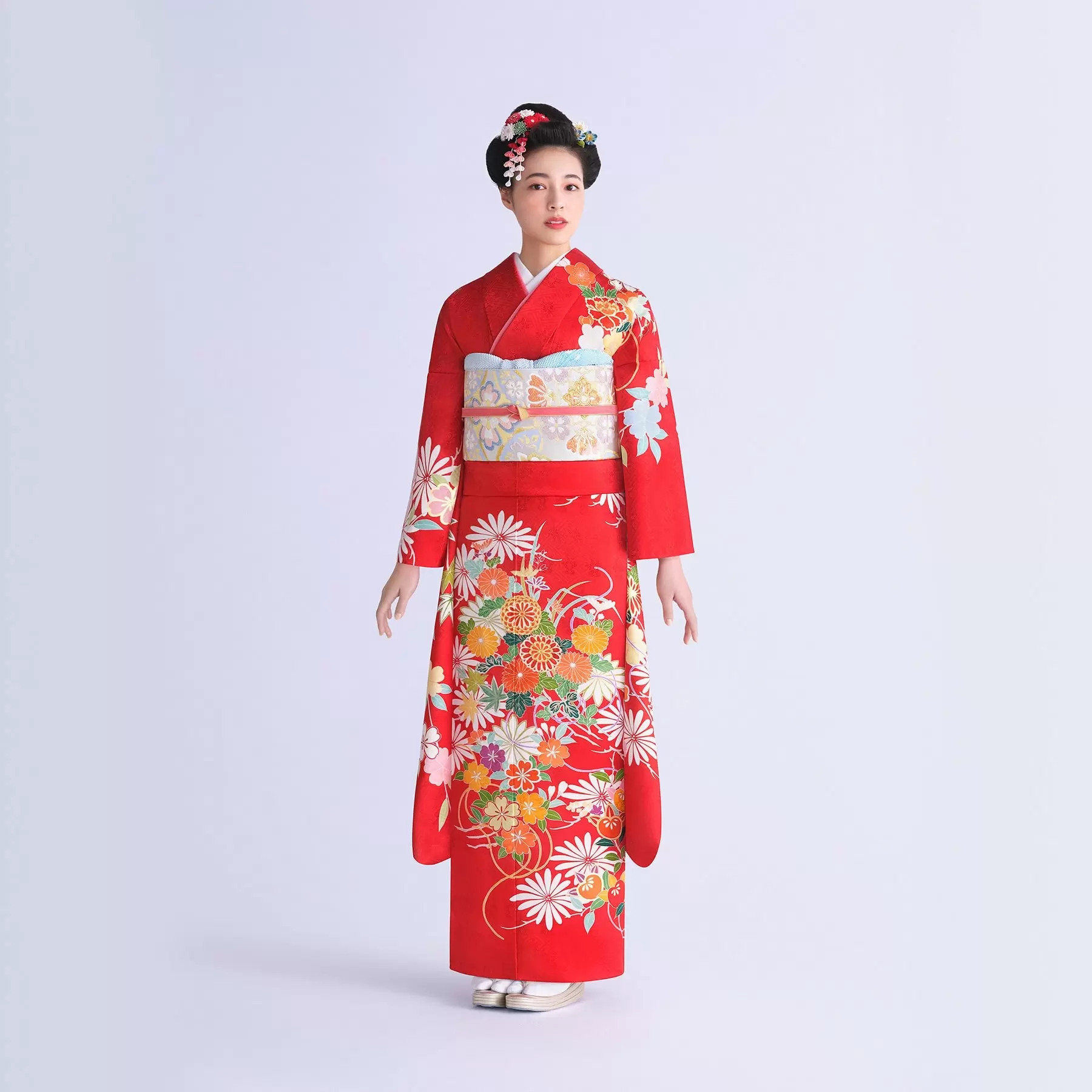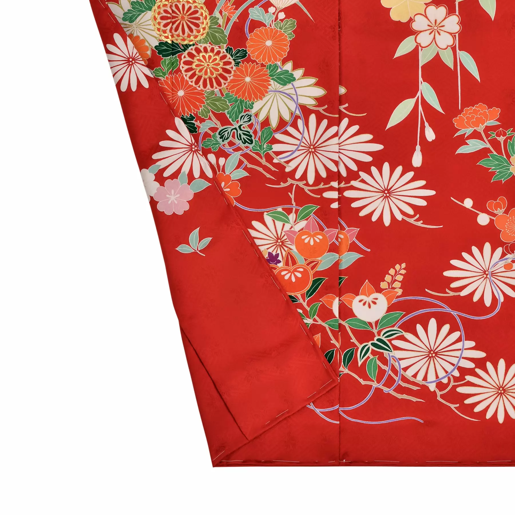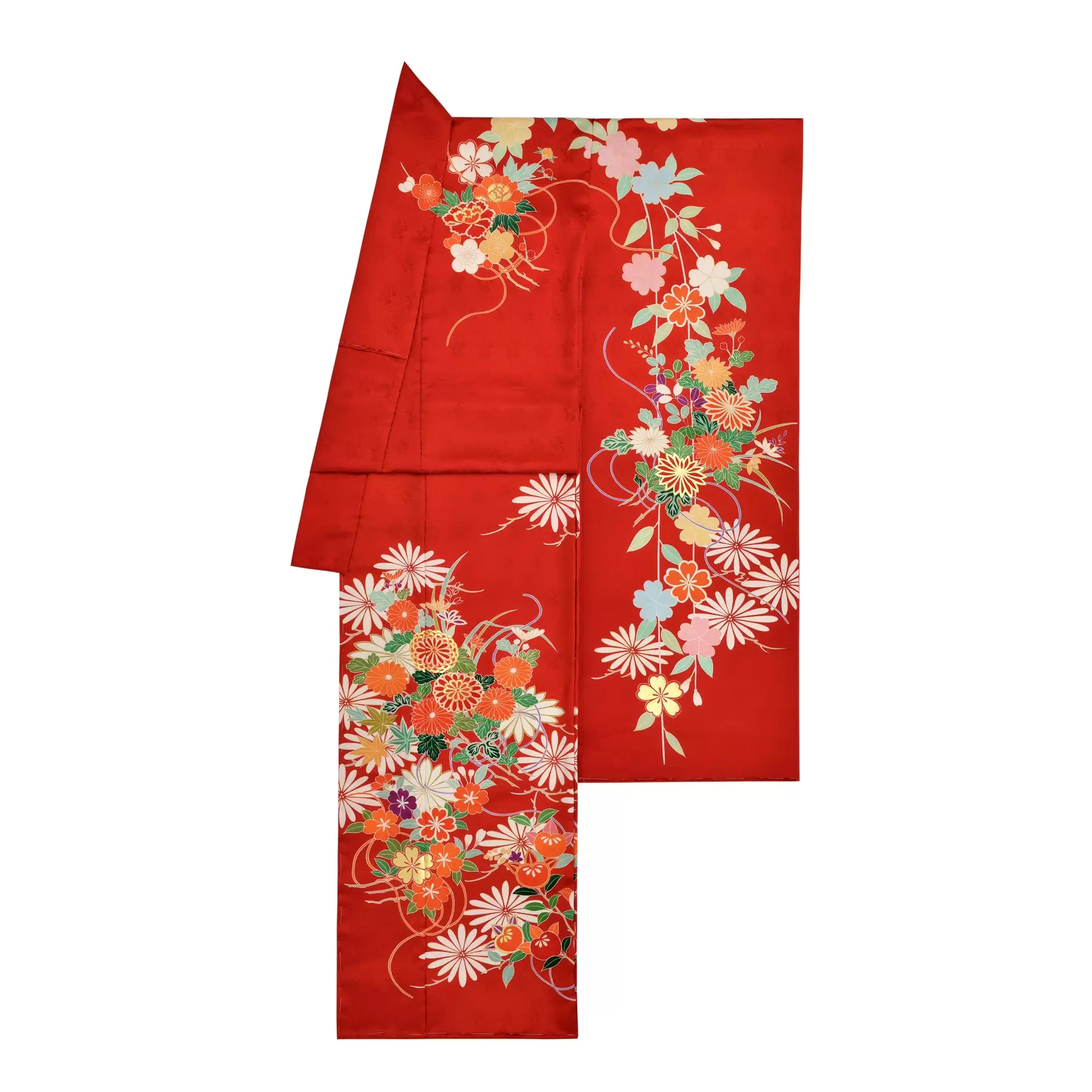 季節を愛でる日本人らしい感性が込められた花束文様をモチーフに、四季の花々を描き出しました。深い赤の地色に映える白の菱文様の組み合わせが、花々の繊細さやたおやかさを際立たせ、振袖全体に瑞々しさを添えてくれています。肩から袖に向かって流れるように描かれた華麗な枝垂れ桜が美しい、華麗な振袖です。