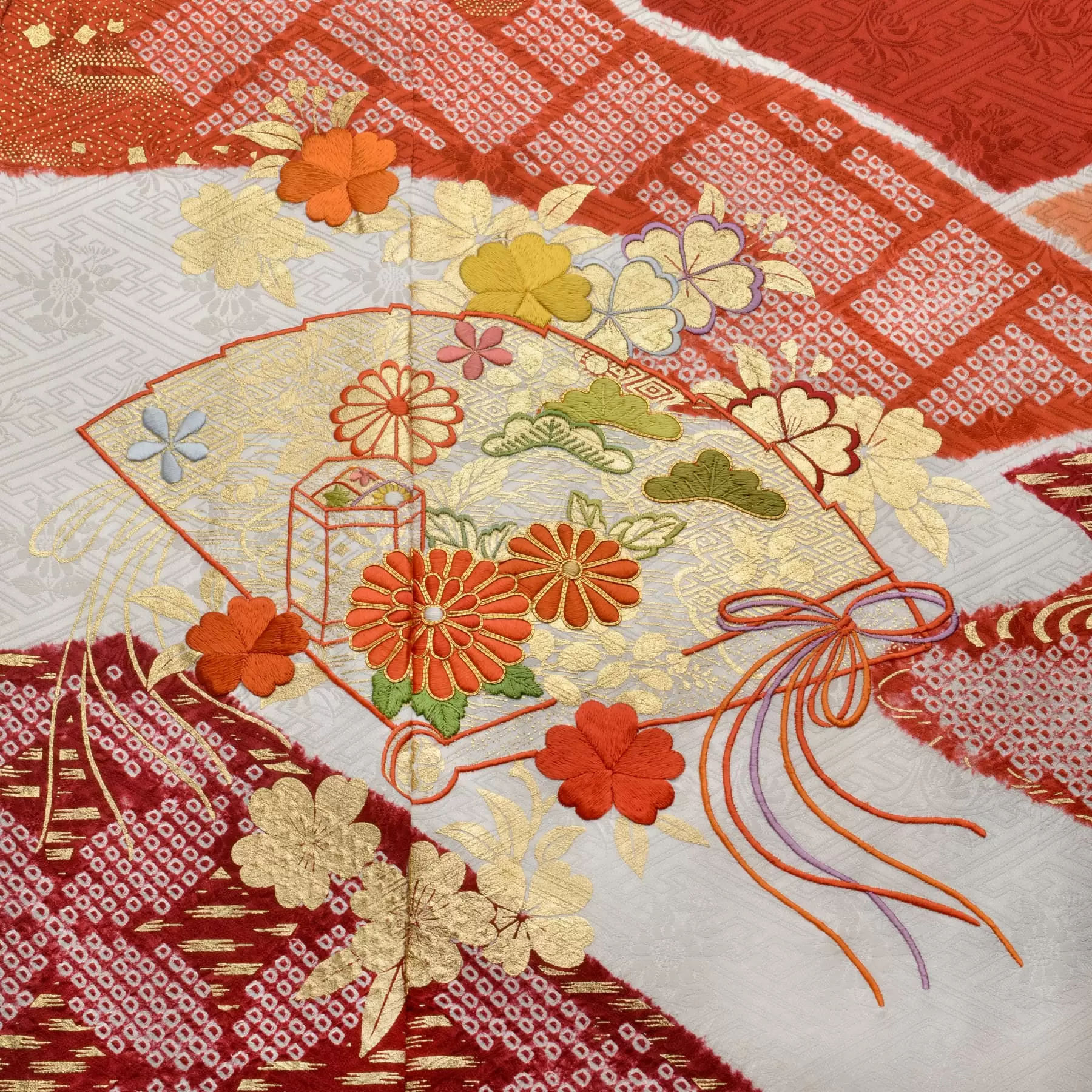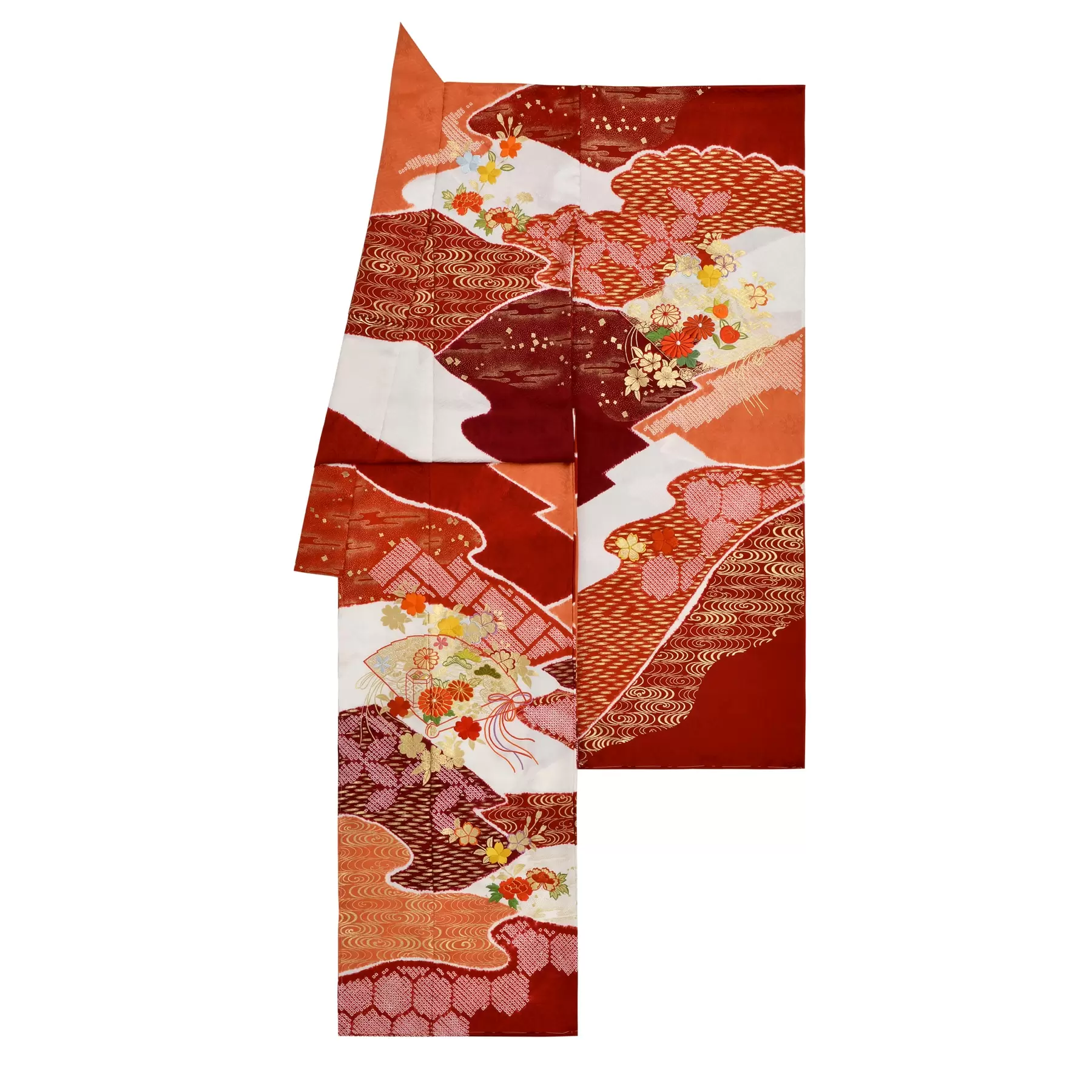山の稜線、川の流れ、雲のたなびく様などの自然の風景を抽象的に描き出した慶長小袖をベースに、絞りと刺繍の技法で自然の豊かさを描き出した振袖です。地色を白と赤の濃淡でまとめ、桧扇、草花を配しました。時代を経ても変わらないスタンダードな一枚です。