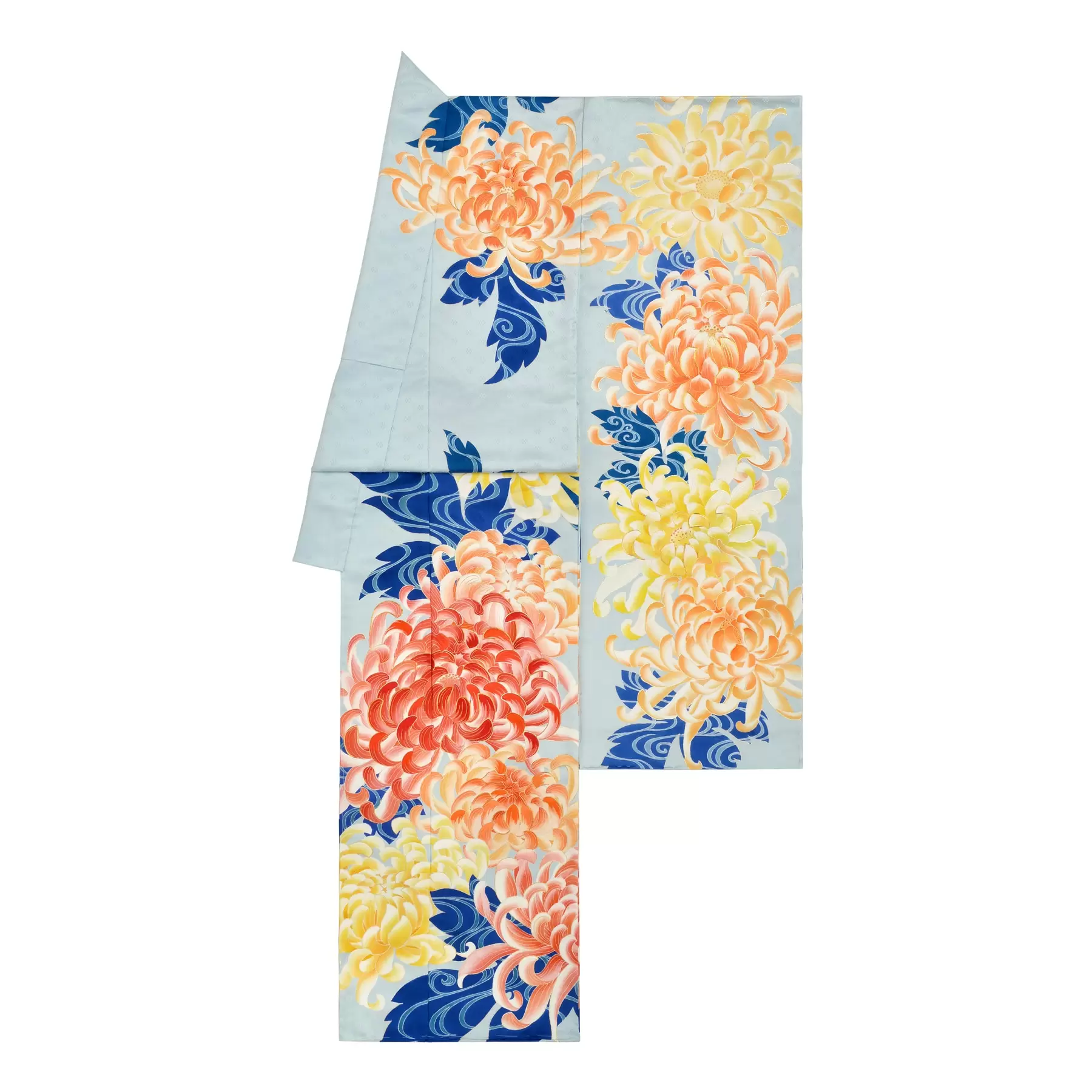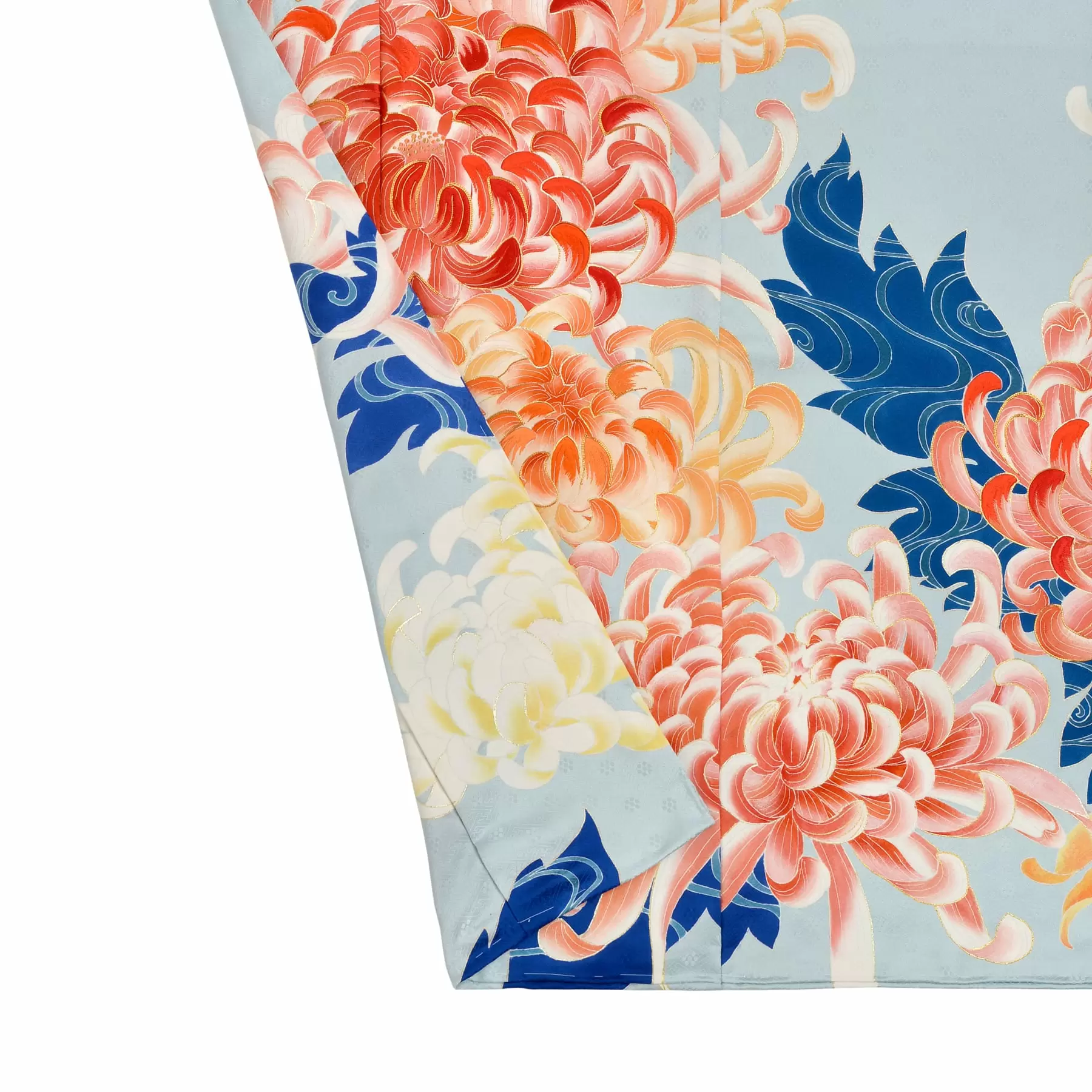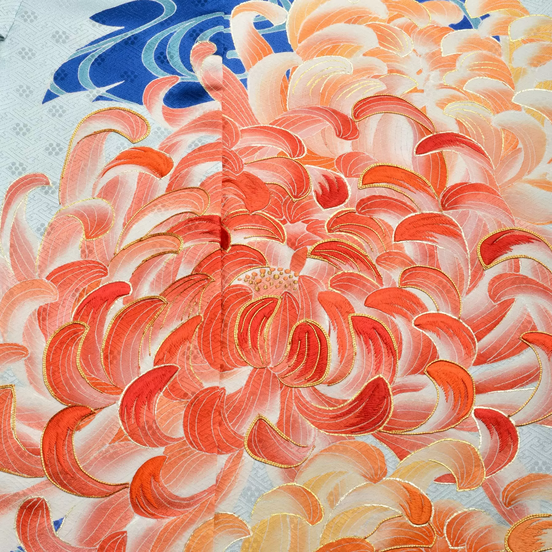 きもの全体に咲き誇る大輪の菊の花をデザインし、流水が映り込むようなイメージで描かれた菊葉を合わせて、長寿を願う吉祥文様の菊水を描きました。満開の菊の美しさを色のグラデーションで表現。裾は朱やオレンジの温かみのある色彩を使い、上半身に向かうにつれ黄、白へと変化していきます。グラデーションで染分けられた繊細な菊の花が、ブルーの地色と対照的な調和を生み出し、振袖らしい豪華さと華やかさを演出しています。