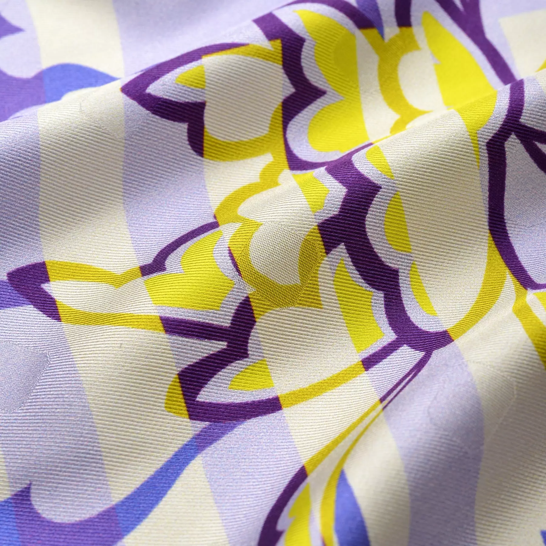 千總の紋にもある八角形を織り込んだスカーフのためのオリジナルの生地を開発。やわらかな風合いと上品な艶が、手で触るだけでも幸せな気持ちにさせてくれます。