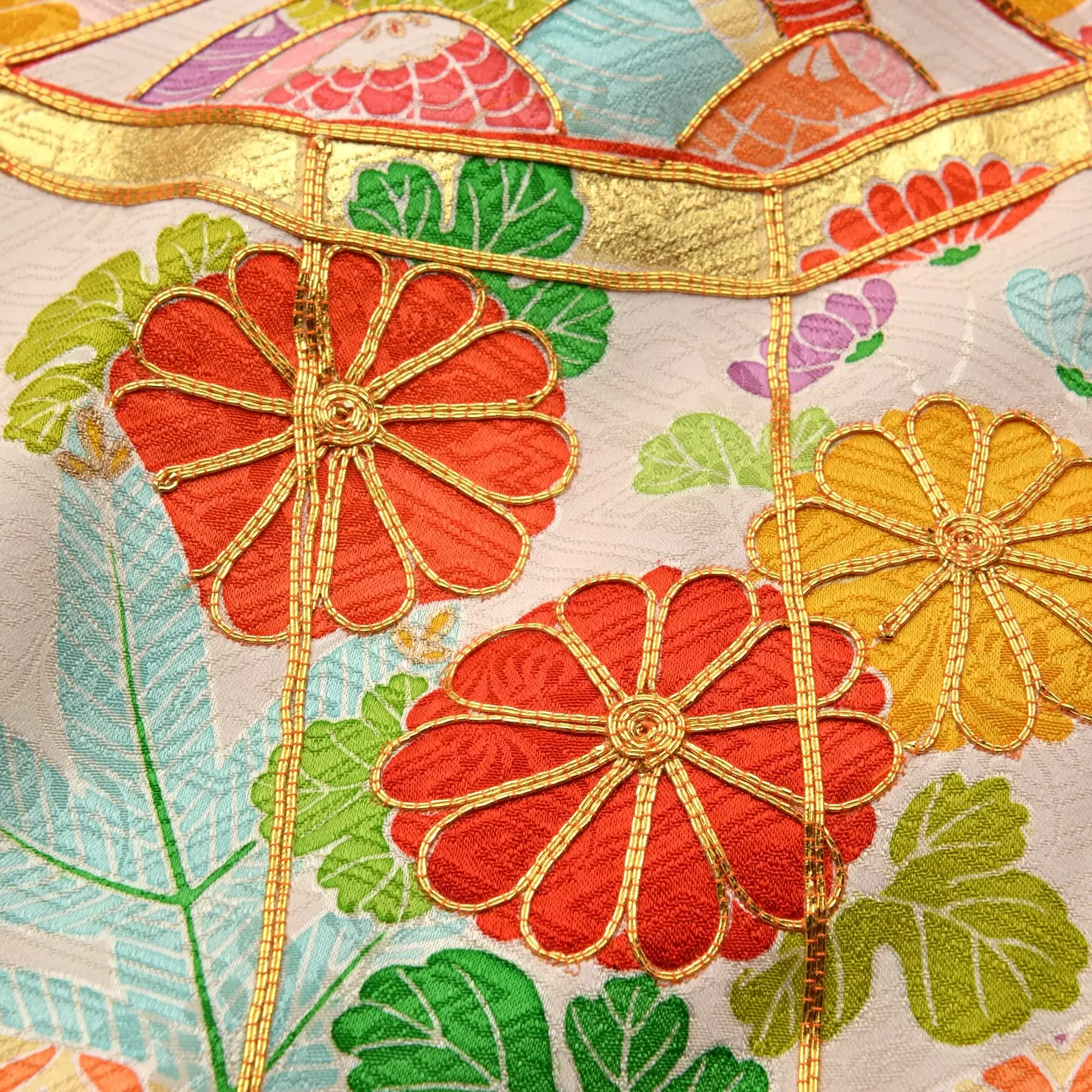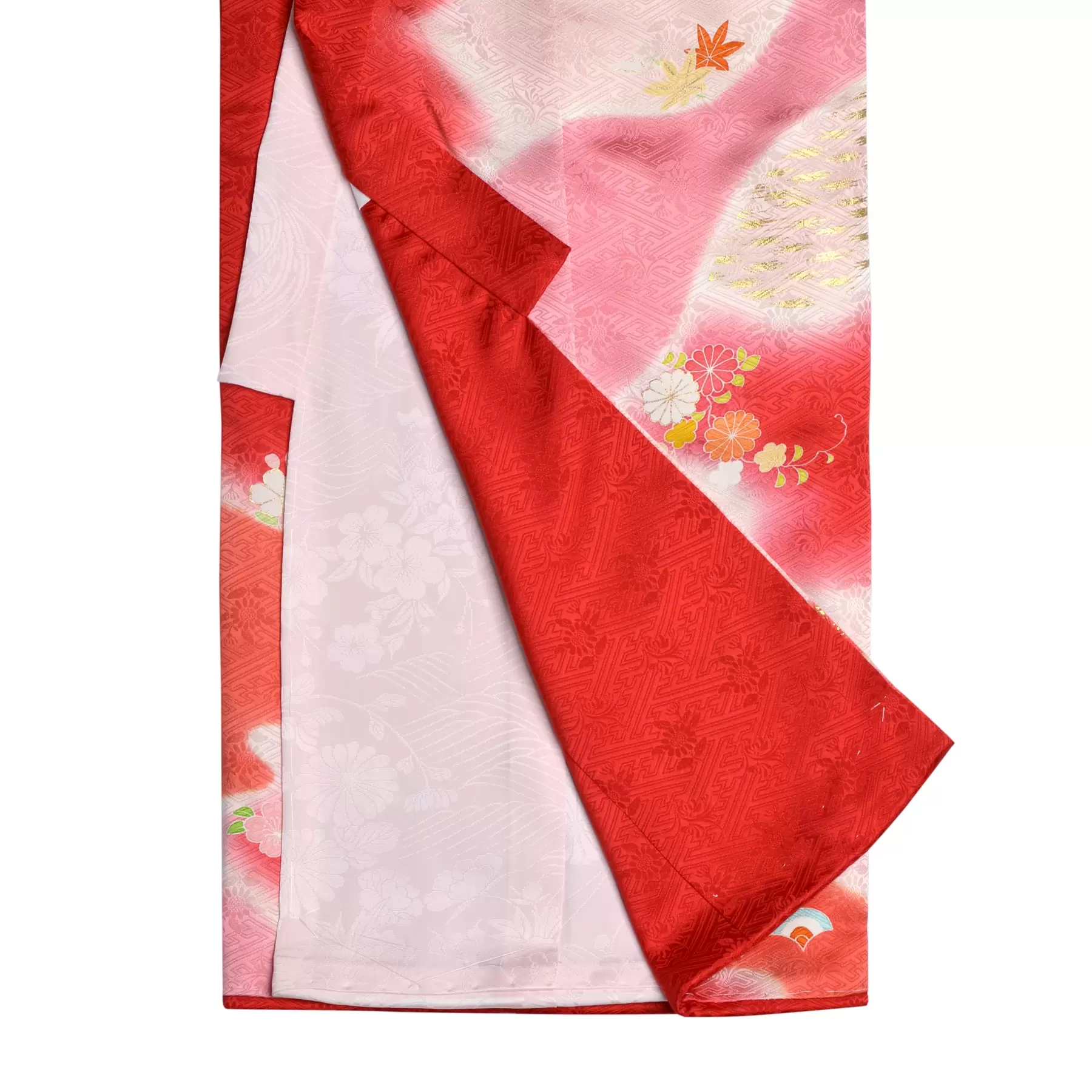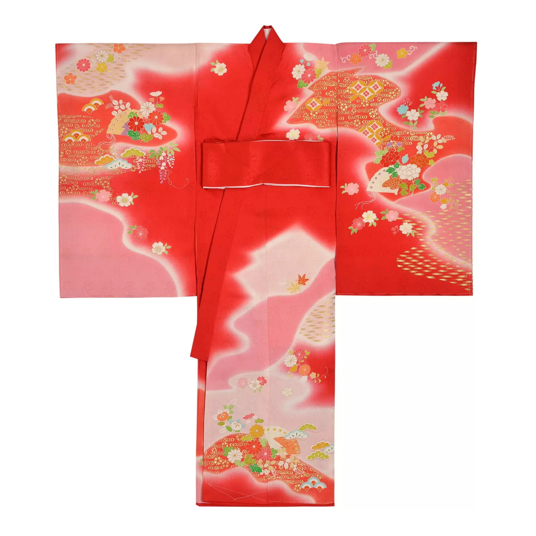 赤の地色をピンクの濃淡で染分けた優雅な初着です。繊細に描かれる桧扇と貝桶は、宮中の雅やかな生活を感じさせてくれる女の子ならではの文様。細やかな手仕事が際立つ箔や刺繍の使い方が重厚感を添えてくれる高貴な一枚です。
