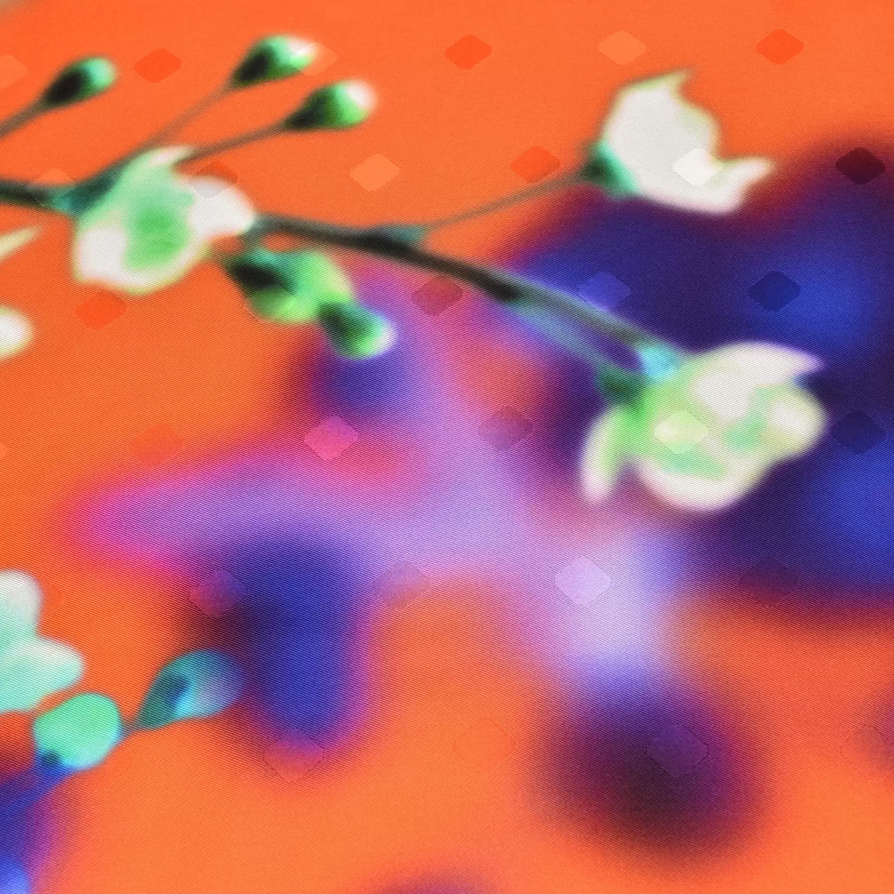 雨に濡れた窓や、すりガラスから見た春の風景を描いた一枚。京都の風景はどんなお天気でも美しいということを思い出させてくれます。ビビッドなカラーリングは装いのアクセントとしても活躍。顔映りも美しいスカーフです。