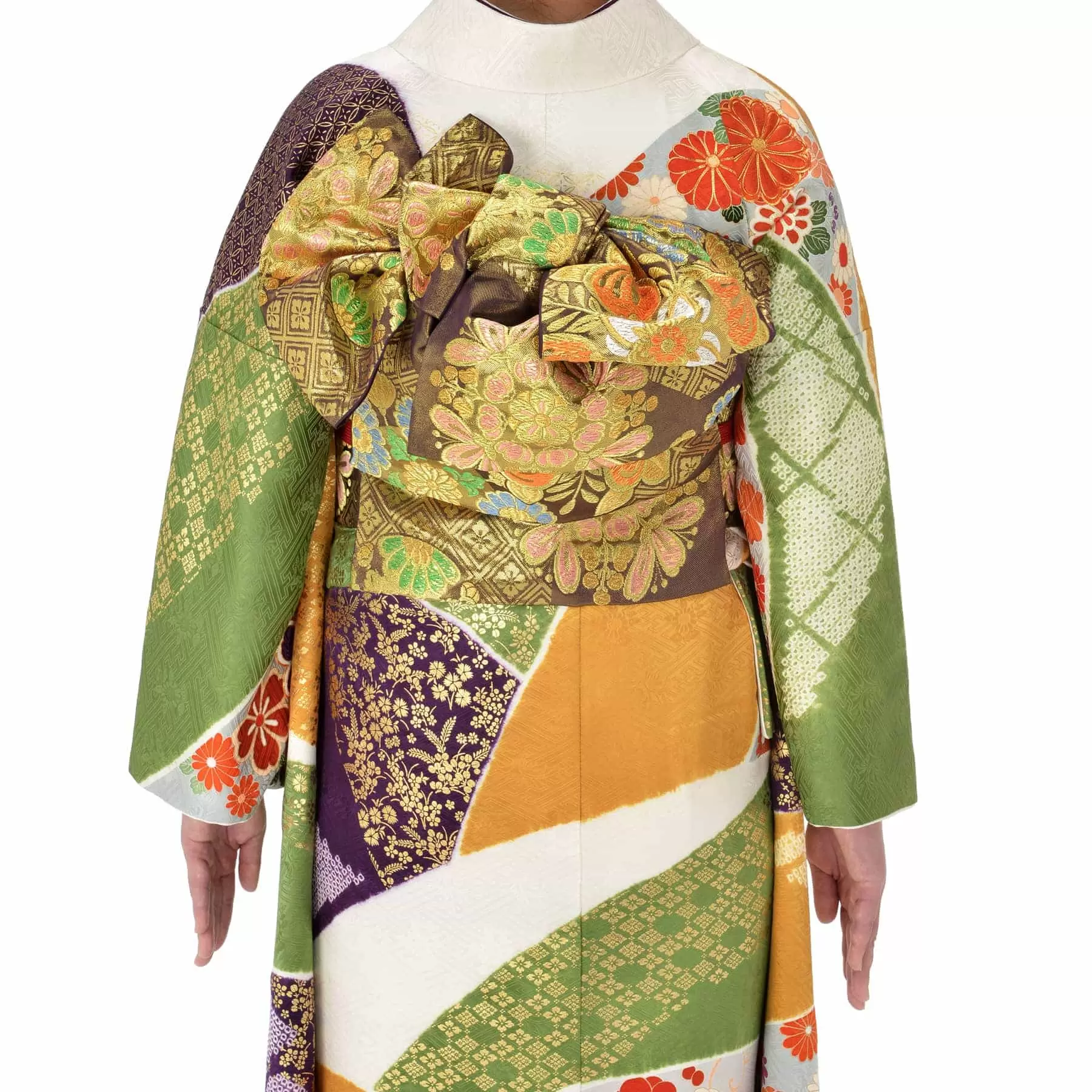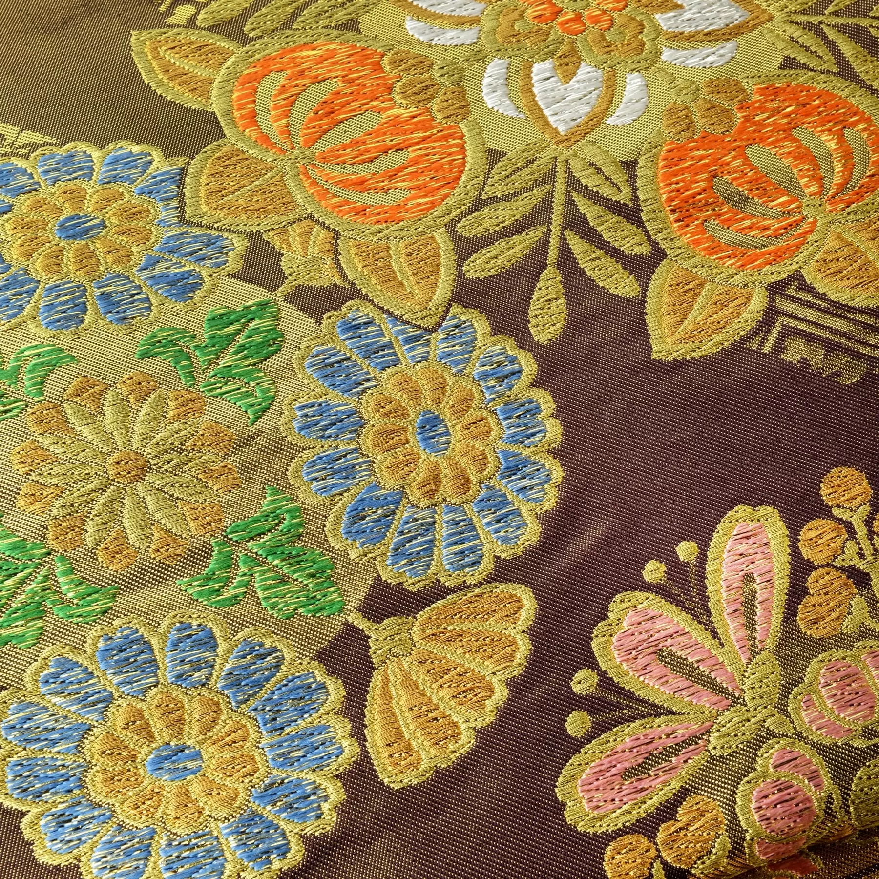 橘や八角形などの千總ならではの意匠と、やわらかい綺麗な色の組み合わせにこだわって何度も考案を重ねた、きものが美しく引き立つ千總の初めての袋帯です。
