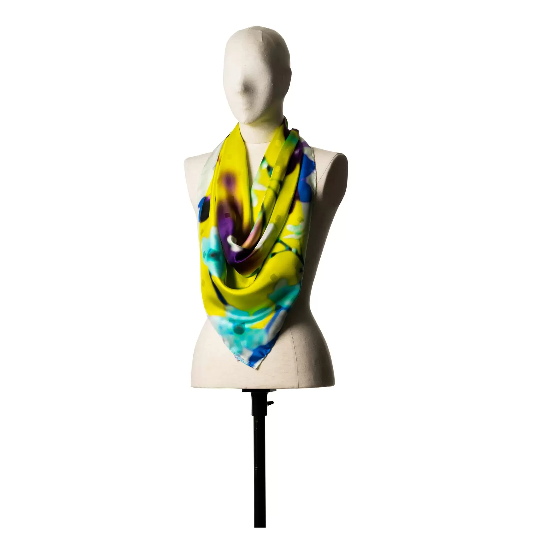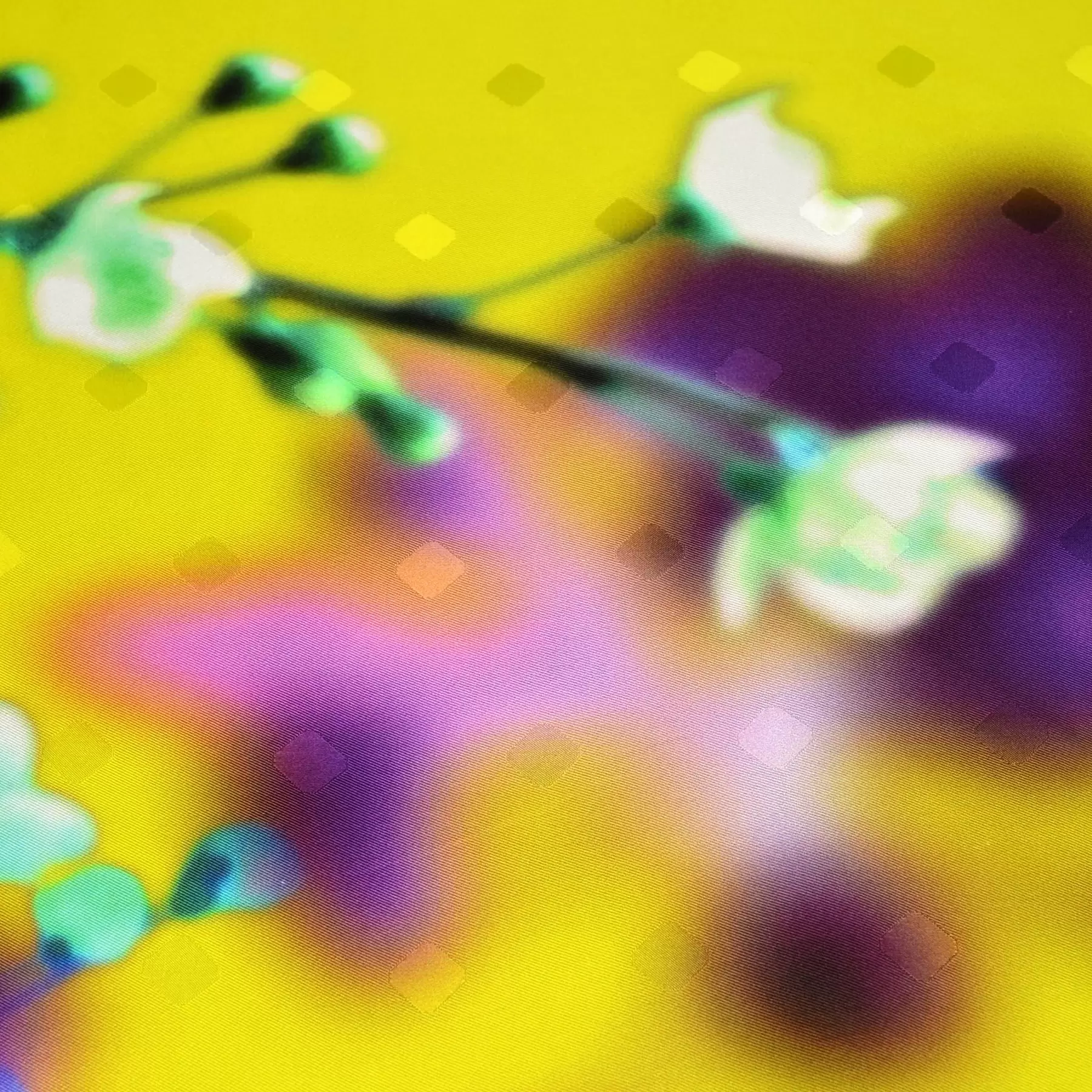 雨に濡れた窓や、すりガラスから見た春の風景を描いた一枚。京都の風景はどんなお天気でも美しいということを思い出させてくれます。ビビッドなカラーリングは装いのアクセントとしても活躍。顔映りも美しいスカーフです。