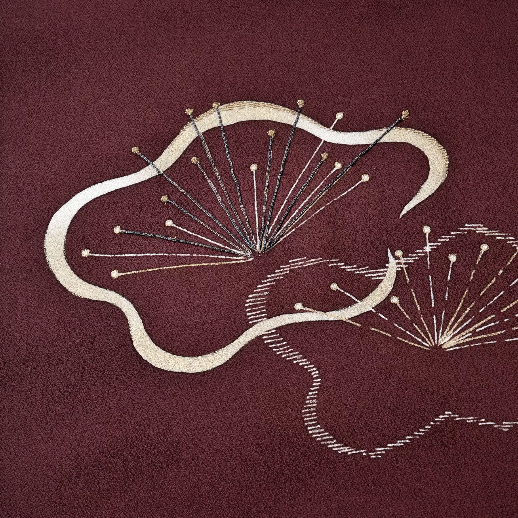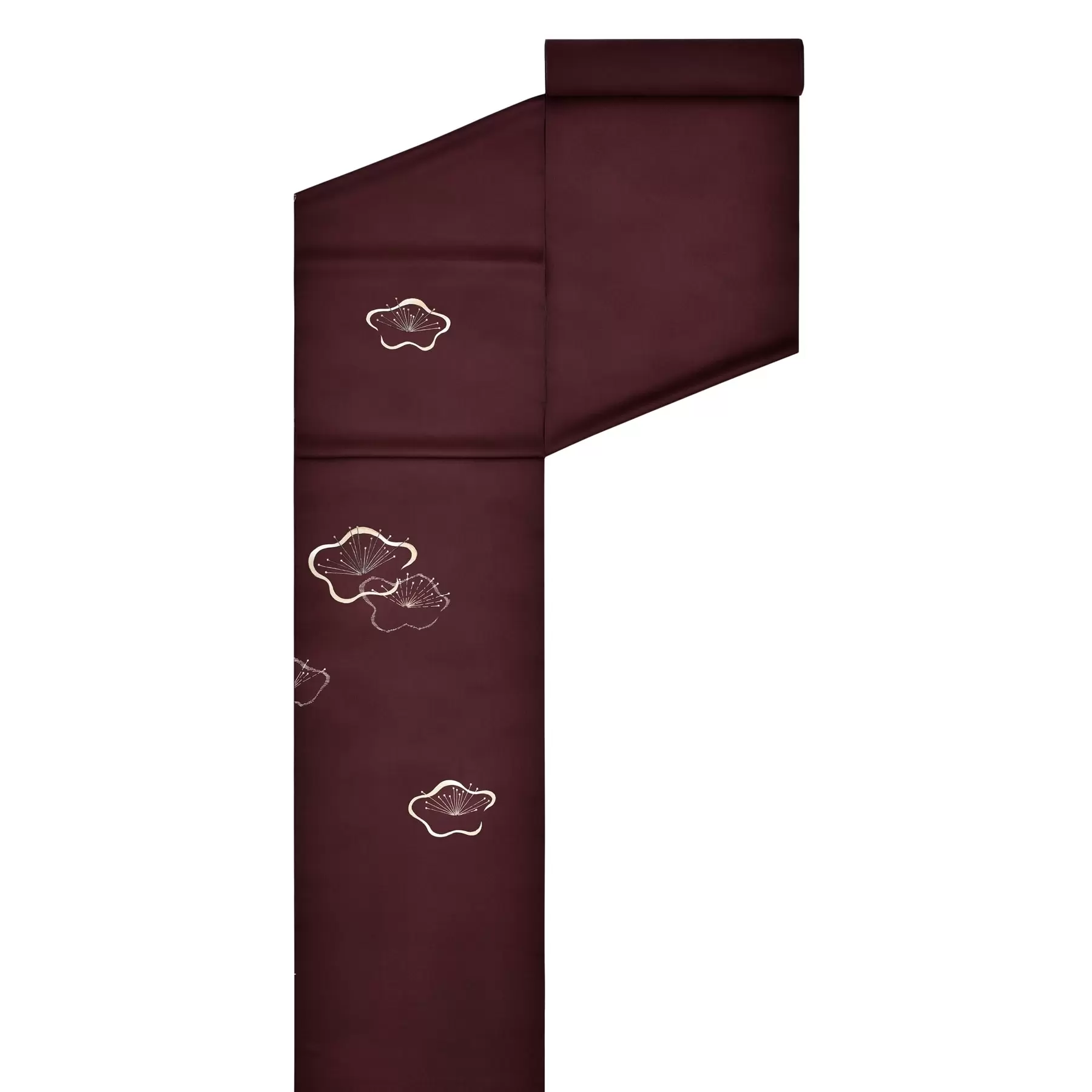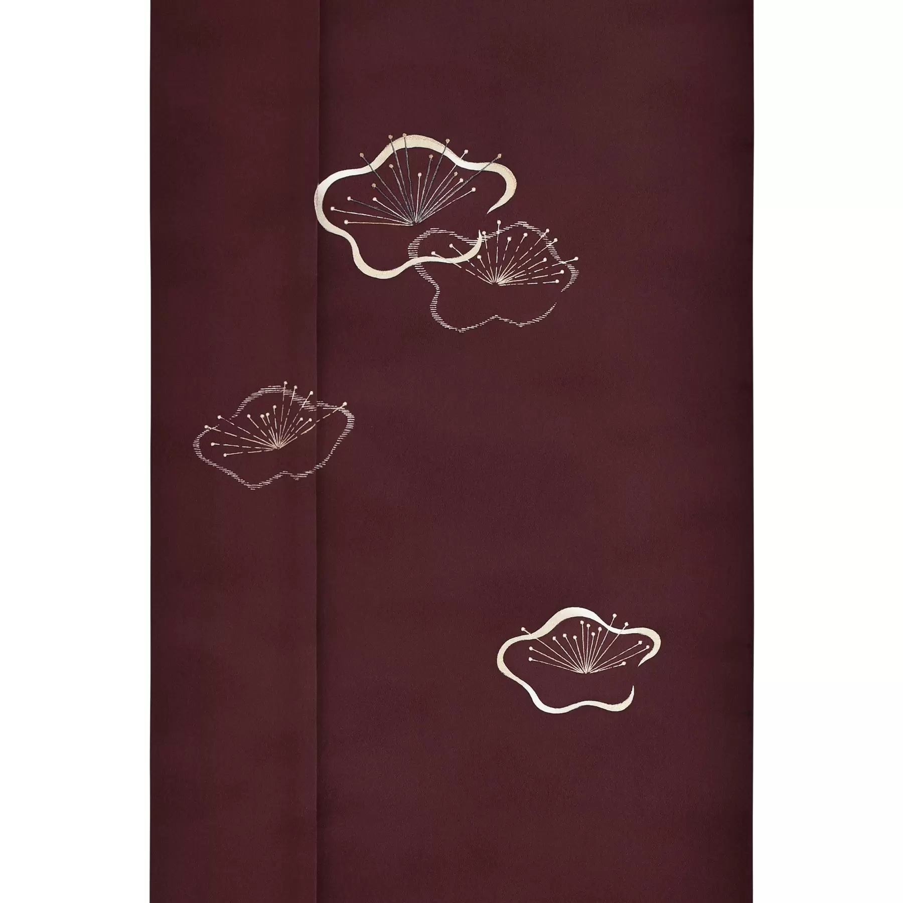 デフォルメされたユーモラスな形と、餅米を用いた真糊(まのり)の柔らかな線が特長の、梅柄の付下です。ゴムの糊より防染力が優しい真糊で描き出される線はむっくりとして味わい深く、表現に風合いを添えてくれます。チョコレートのような深い赤茶色は、お顔写りが良く、お洒落上級者に見せてくれるおすすめの地色です。お正月や節分などの行事や、観劇などにぜひお召しください。