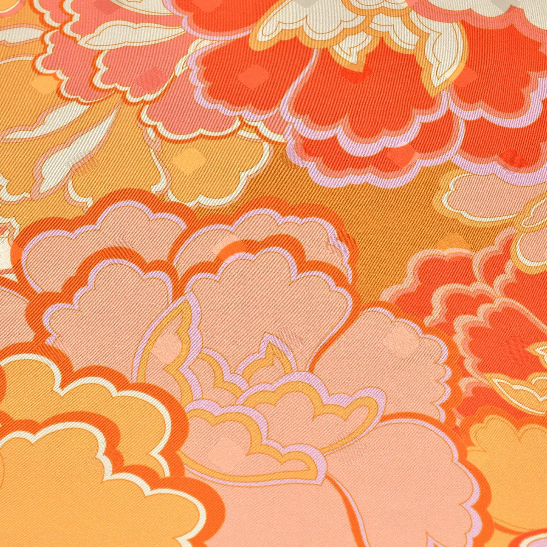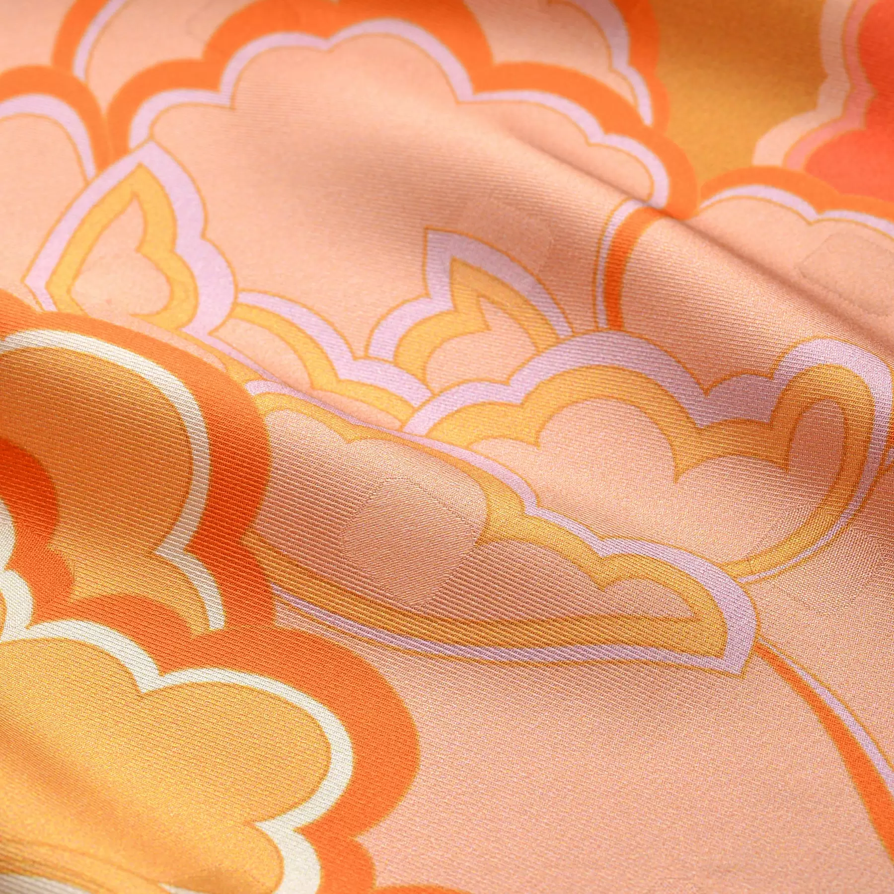 千總の紋にもある八角形を織り込んだスカーフのためのオリジナルの生地を開発。やわらかな風合いと上品な艶が、手で触るだけでも幸せな気持ちにさせてくれます。