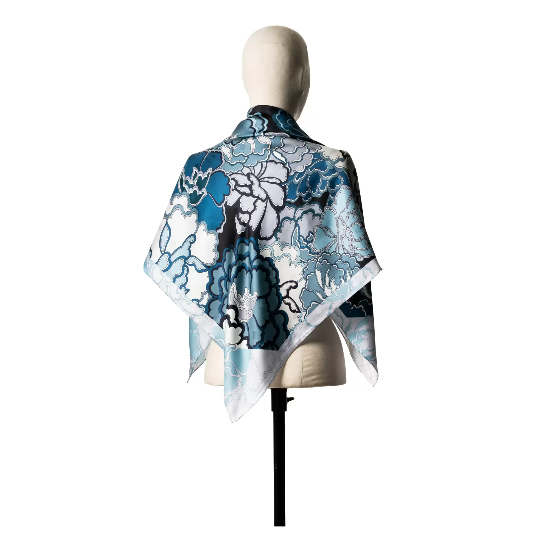 たくさんの牡丹が重なるように描かれ、どこまでも続いているように表現された一枚。ワントーンなカラーリングでありながら、濃淡をつけることにより巻く度に印象を変えてくれるスカーフです。