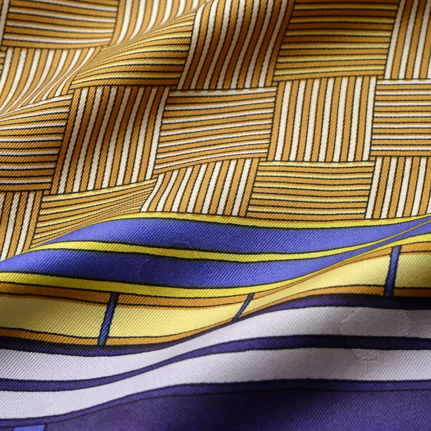 千總の紋にもある八角形を織り込んだスカーフのためのオリジナルの生地を開発。やわらかな風合いと上品な艶が、手で触るだけでも幸せな気持ちにさせてくれます。