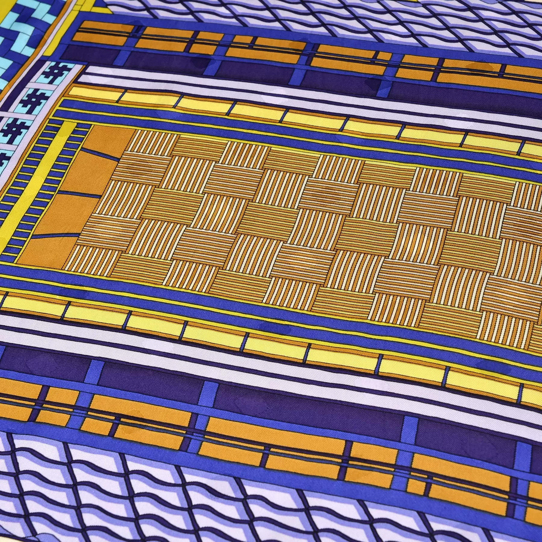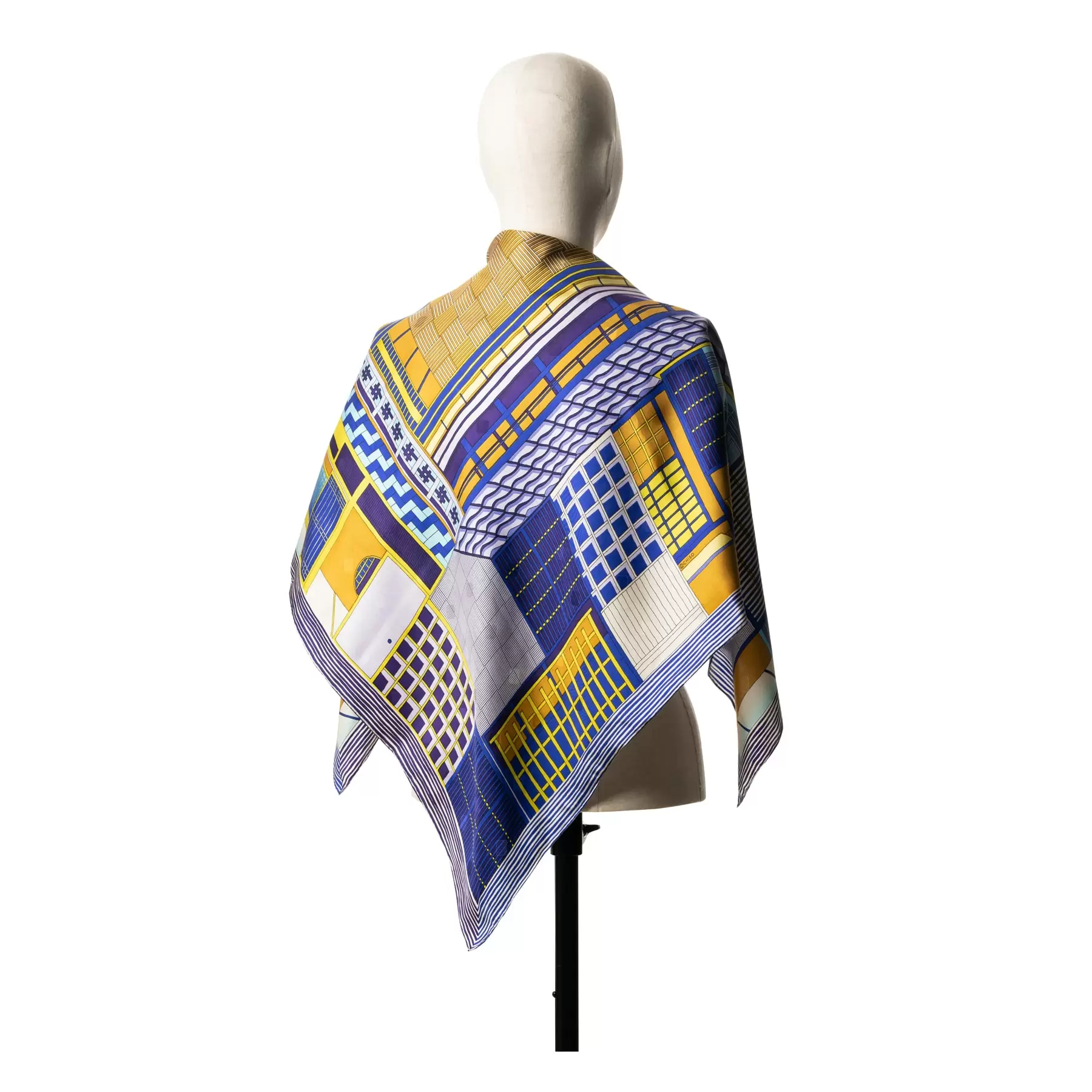 自然との調和を大事にしながら設計された京町家をデザインしたこちらのスカーフは、幾何学的な造りの中に覗く自然の柔らかな光や色彩を想像させてくれる一枚になっています。ワントーンに近いカラーリングはスタイリッシュで上品な印象を与えてくれます。