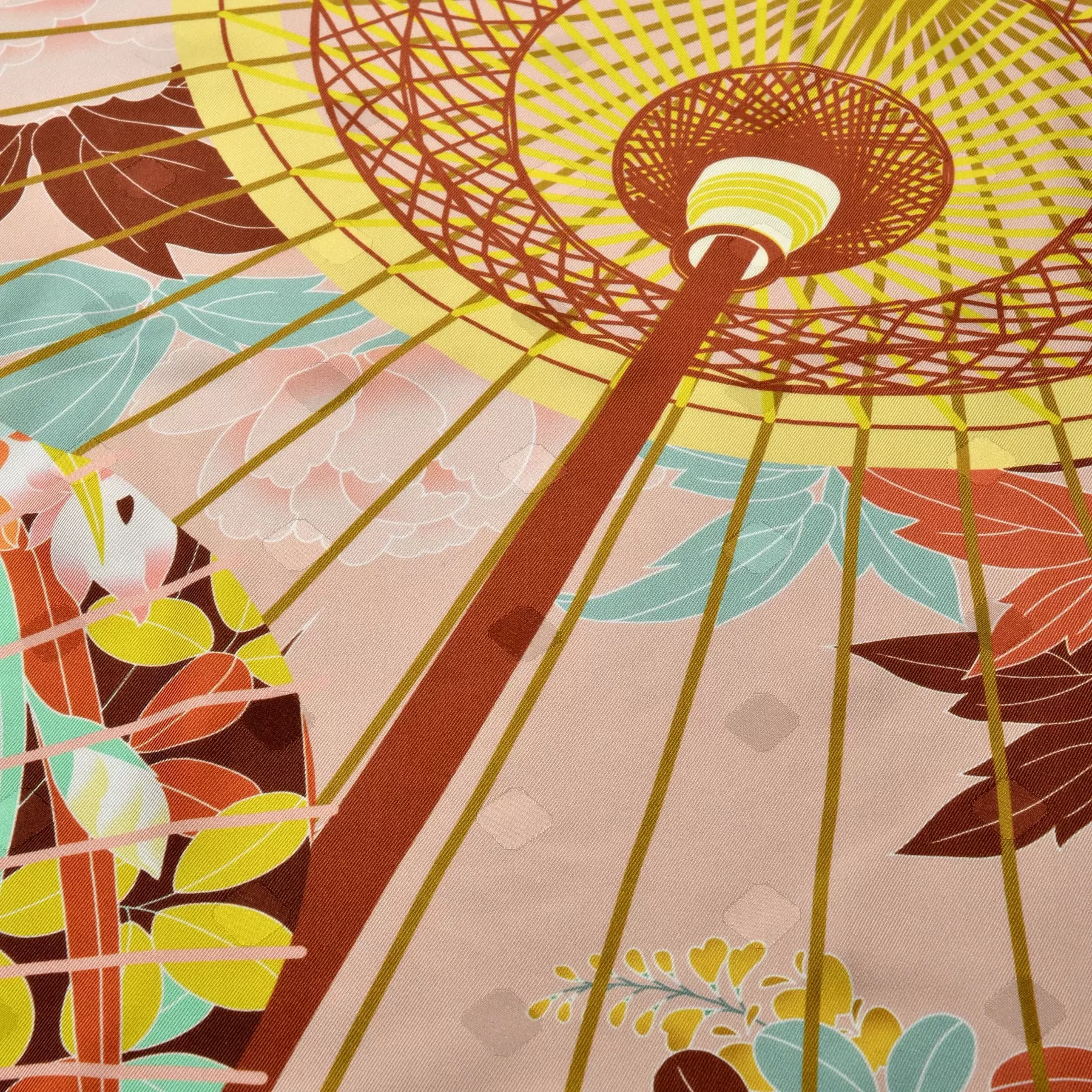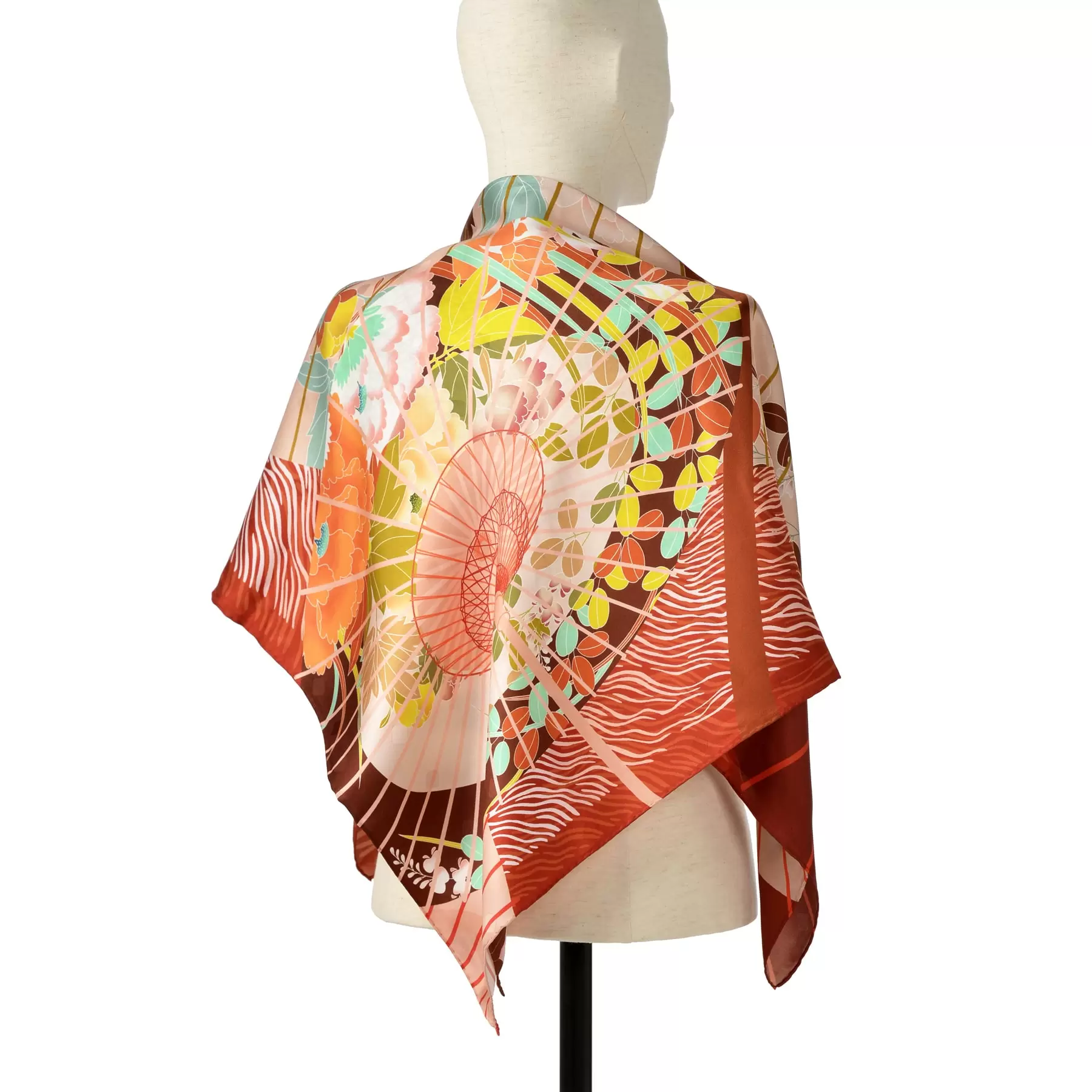 千總が所有する友禅染の見本裂の柄をもとに、スカーフ一面に、蛇の目傘に牡丹、杜若、撫子、萩と春秋の花々を描いた大胆で華やかなデザインのスカーフ。グラデーションで染め分けた背景の波文様が全体をモダンにまとめてくれています。華やかな牡丹、傘と波の幾何学的な文様など、見せる面によって表情が変わり、コーディネートや気分に合わせてスタイリングを楽しむことができる一枚です。