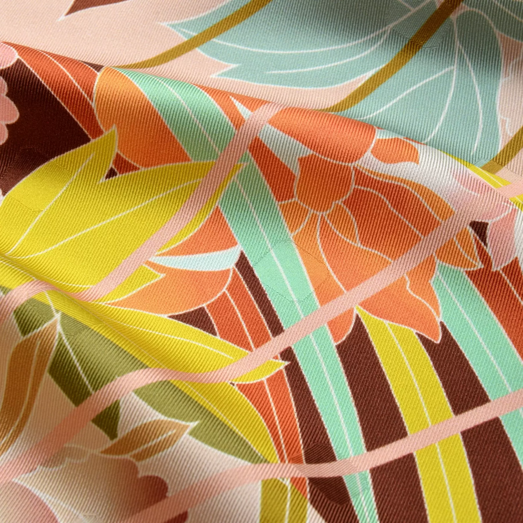 千總の紋にもある八角形を織り込んだスカーフのためのオリジナルの生地を開発。やわらかな風合いと上品な艶が、手で触るだけでも幸せな気持ちにさせてくれます。