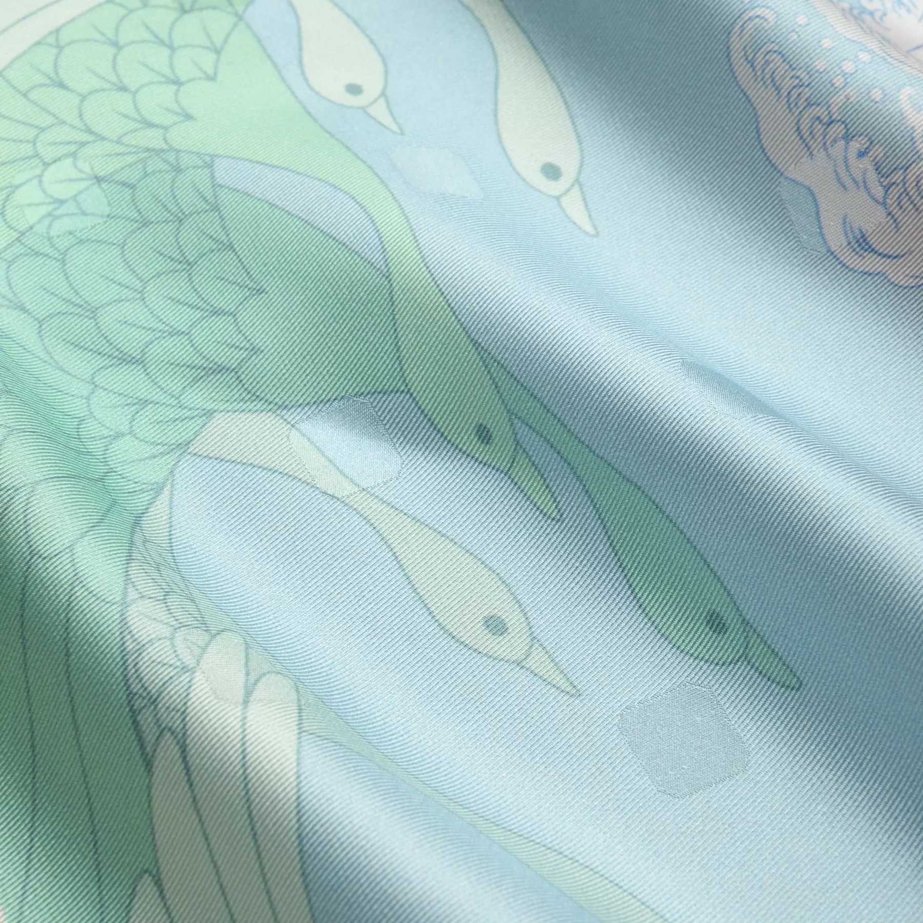 四方に扇子を配置した天地左右のないスカーフらしい構図です。幾何学的に表現された波文様と有機的な鶴や鯉の対比がポイント。大柄な扇子が目を引く特徴的なデザインを、ワントーンの配色で上品にまとめることで、洋服にも合わせやすいスカーフに仕上がりました。扇面、鯉、鶴と縁起の良いモチーフを楽しめるスカーフに仕上げました。