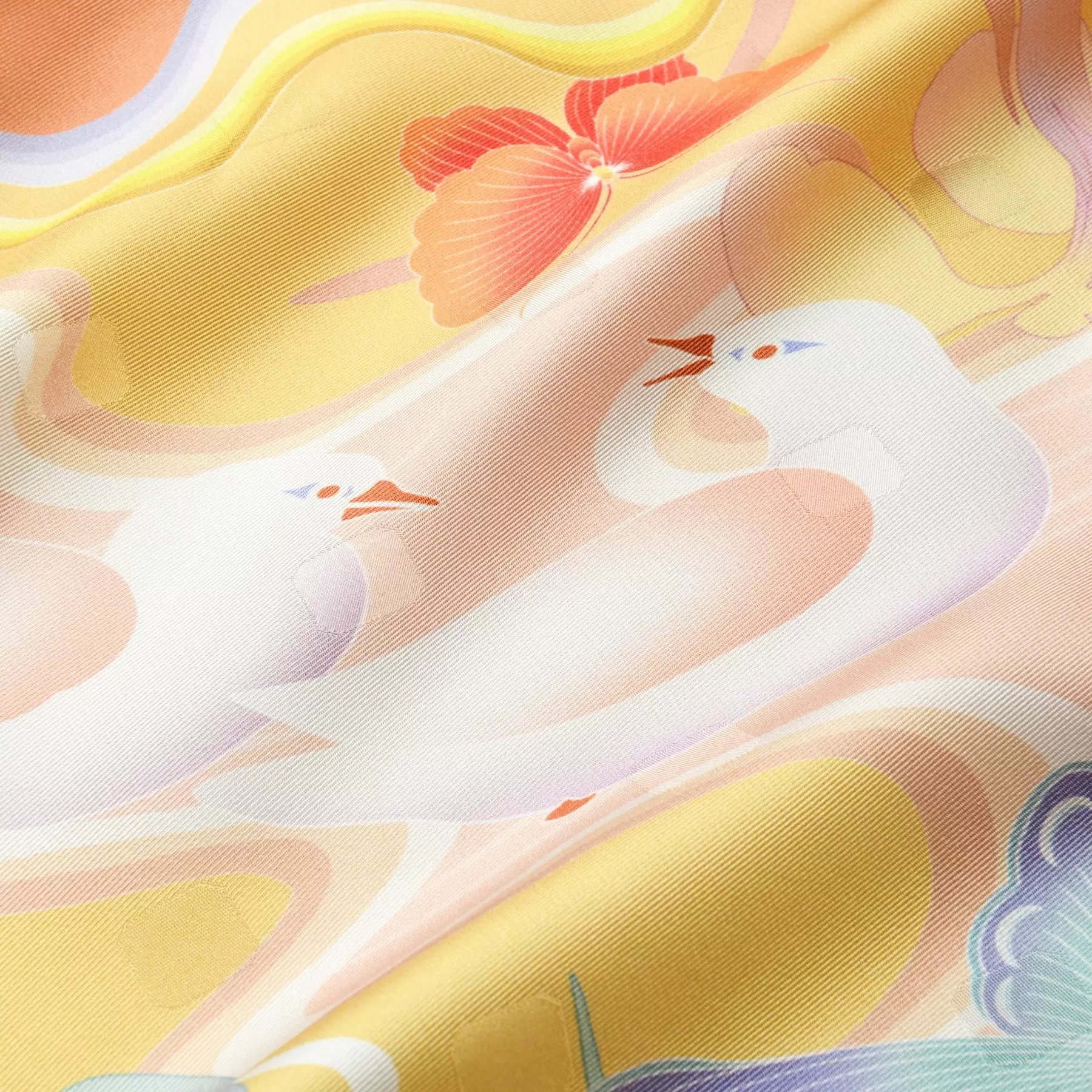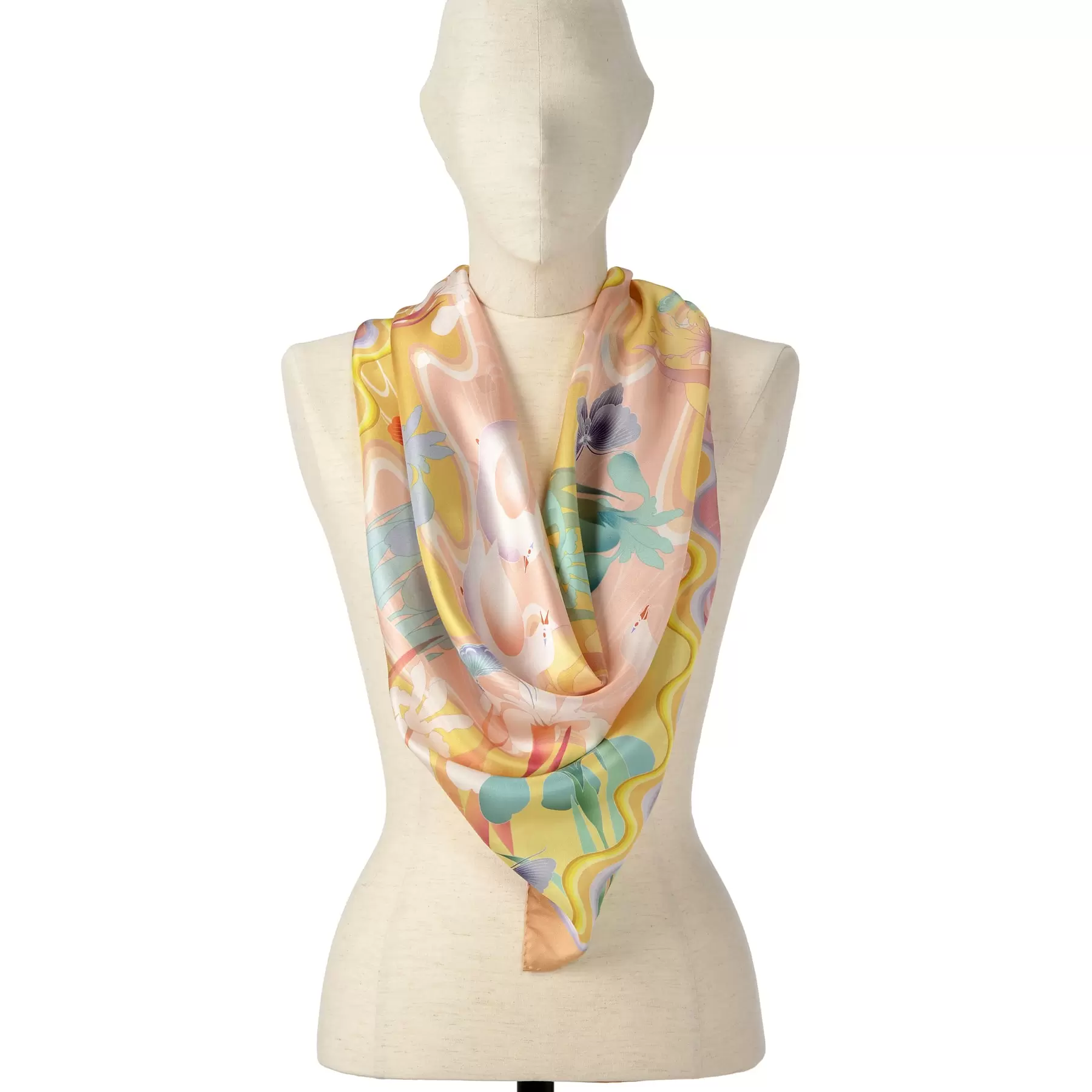 千總が所有する友禅染の見本裂の柄をもとに、水鳥、杜若、蝶が流れる水の中にリズミカルに配された美しいデザインのスカーフ。繧繝彩色から着想を得たカラフルな波の文様の縁取りが、より幻想的な空間を演出しています。