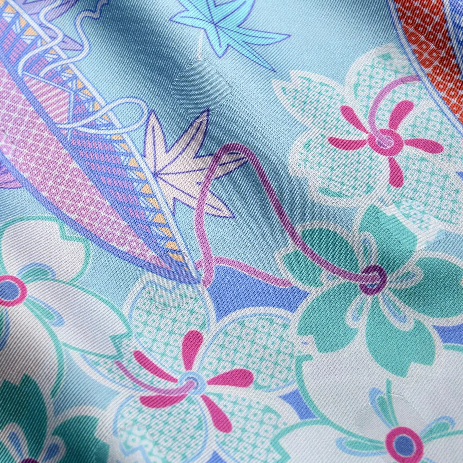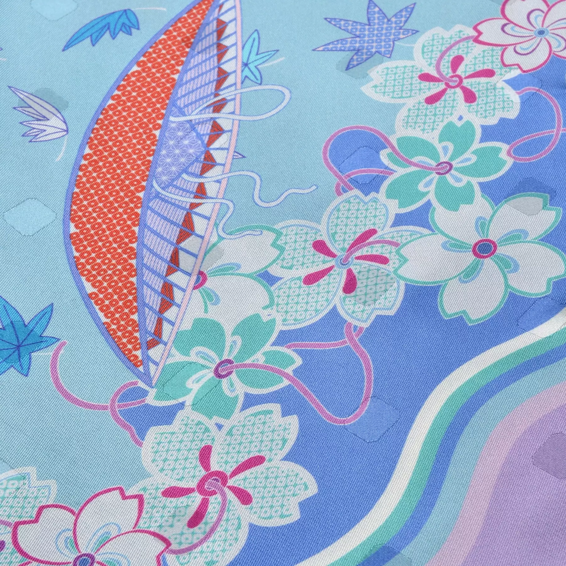 小袖をもとにデザインしました。江戸時代に粋な小道具して親しまれた傘と、春秋を表す桜と楓をリズミカルに散らした柔らかい雰囲気のスカーフです。違う色で染め分けられた剣先の両端がポイントに。