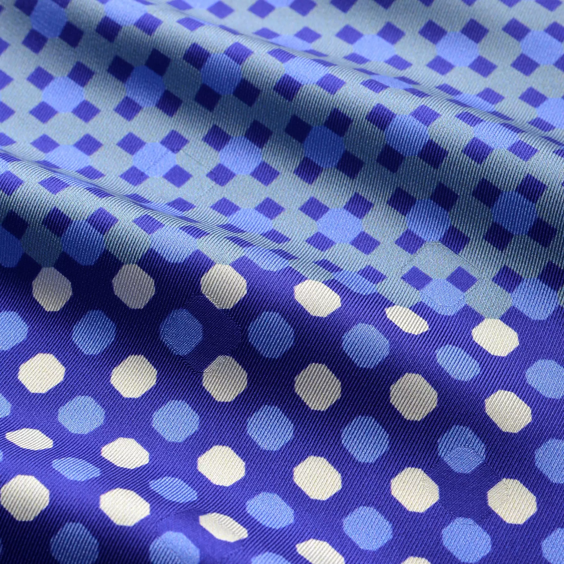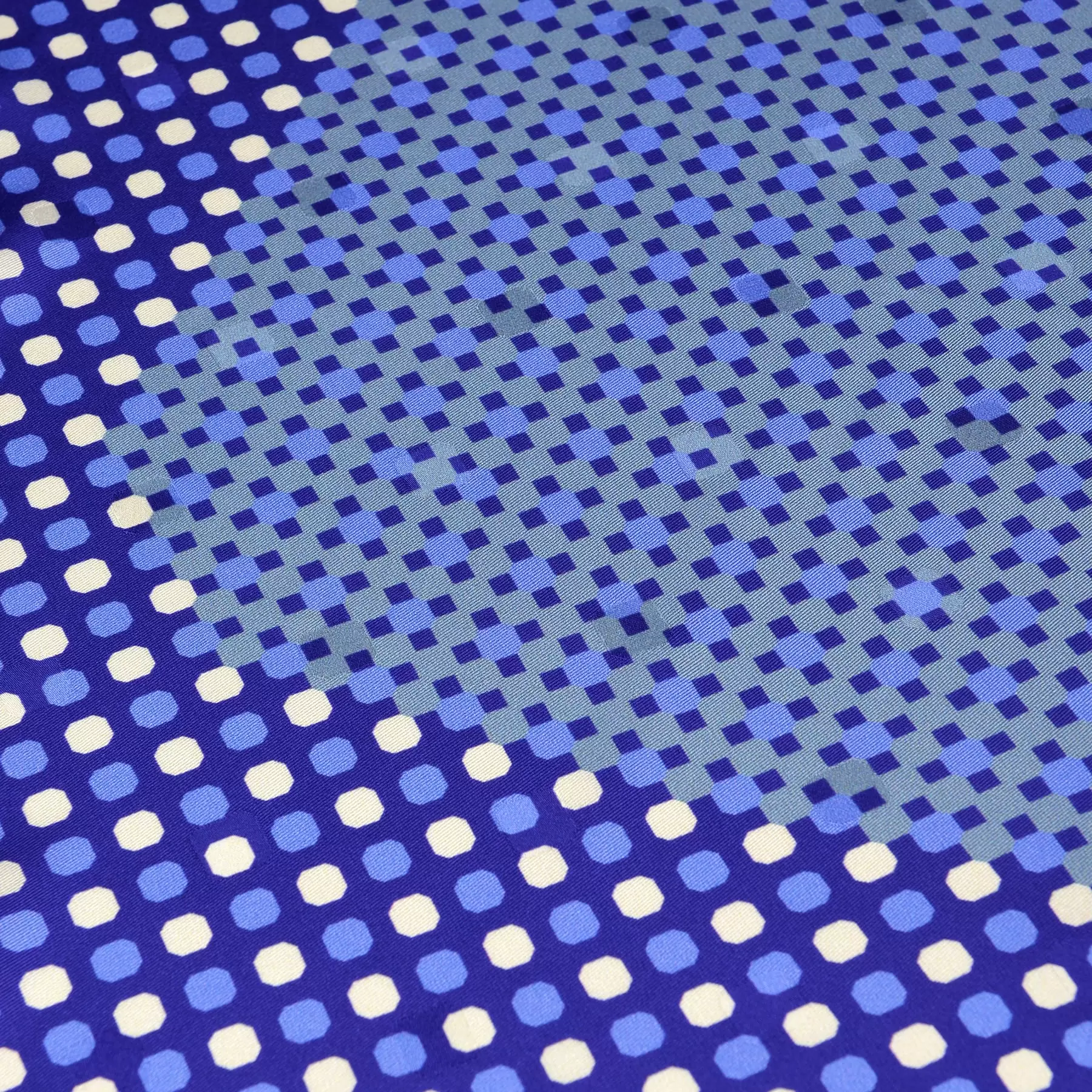 千總の紋にもある八角形を織り込んだスカーフのためのオリジナルの生地を開発。やわらかな風合いと上品な艶が、手で触るだけでも幸せな気持ちにさせてくれます。