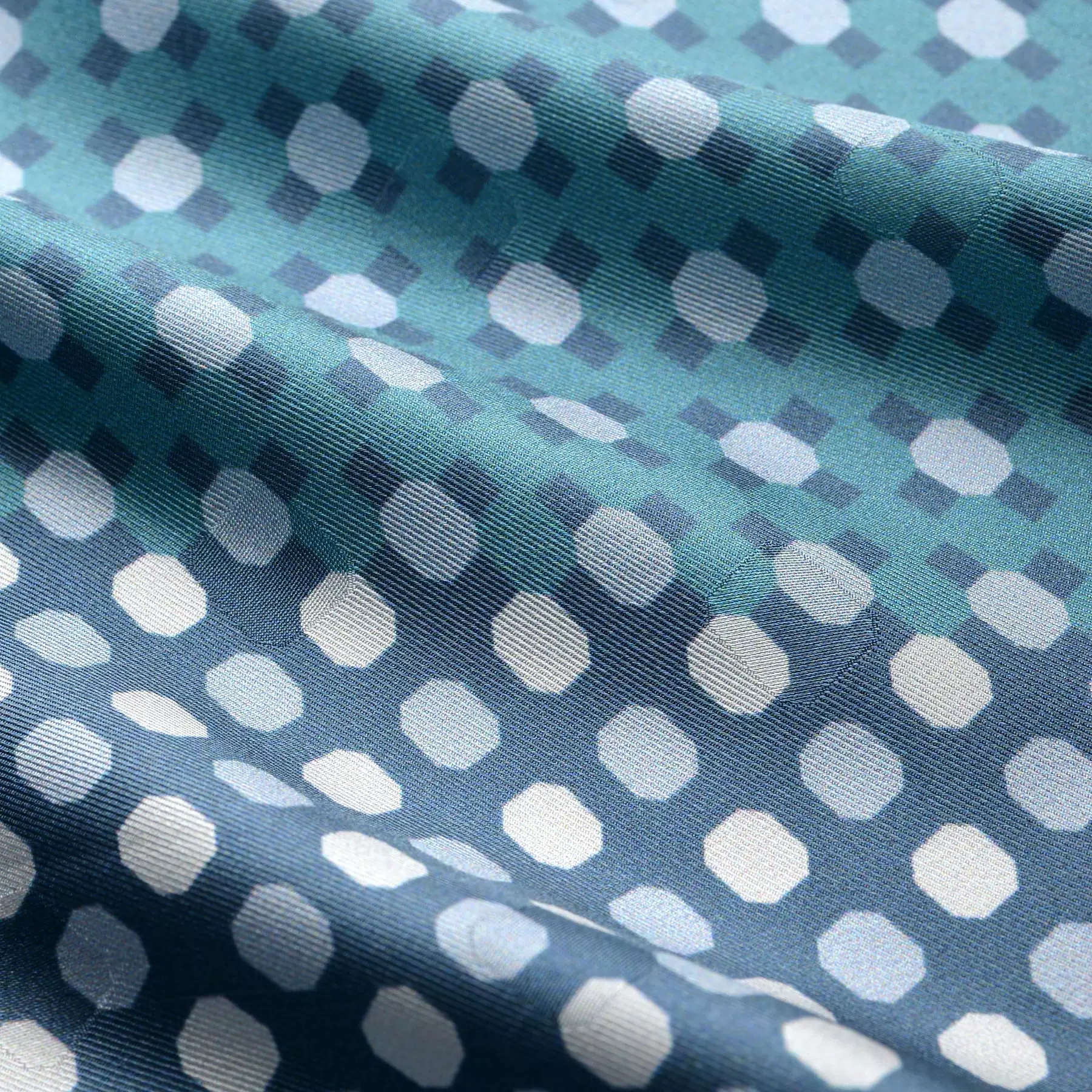 千總の紋にもある八角形を織り込んだスカーフのためのオリジナルの生地を開発。やわらかな風合いと上品な艶が、手で触るだけでも幸せな気持ちにさせてくれます。