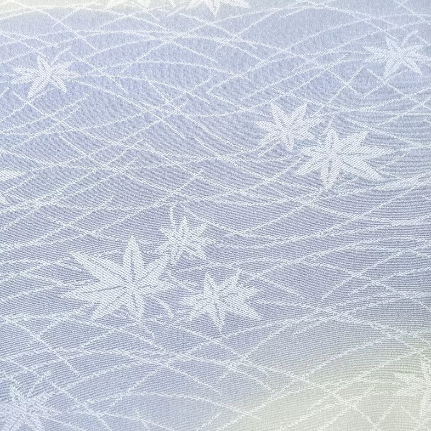 芒と楓を組み合わせた秋をイメージした地紋を織り込んだ、しなやかな風合いの生地を使用しています。楊柳の特徴的な「しぼ」は、軽やかで肌触りがよく涼しげにお召しいただけます。涼しげなブルーの色で暈し染めを施しています。