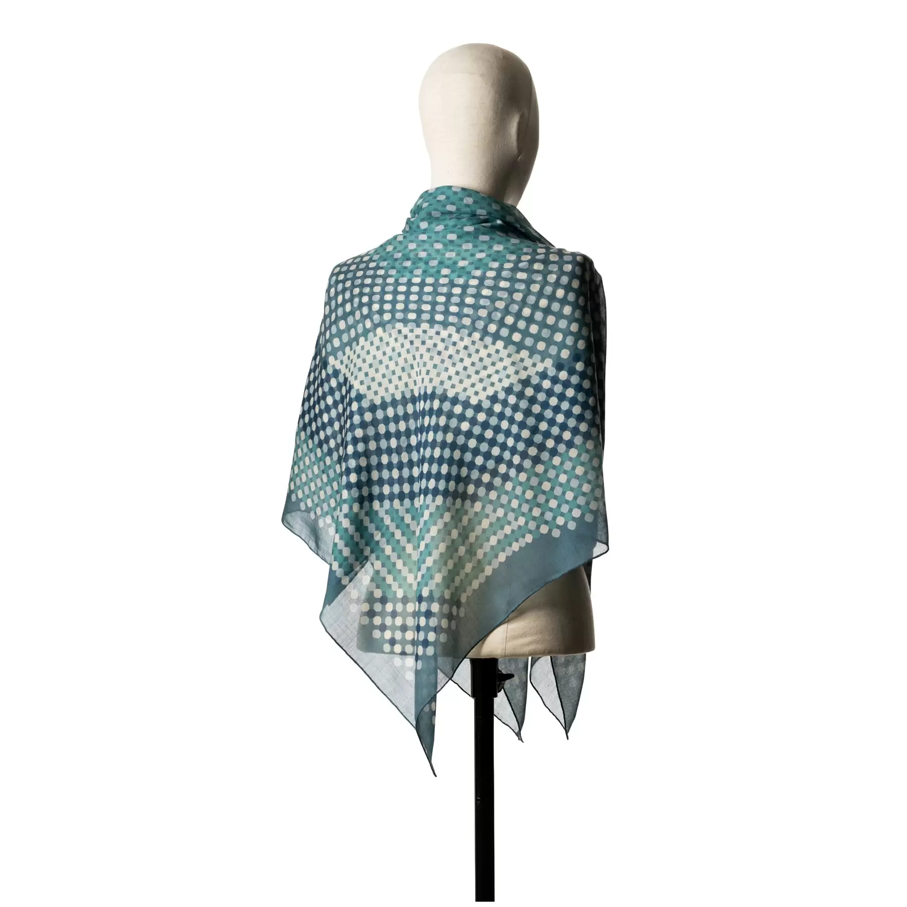 千總の紋である千切台の八角形を大胆にたくさん並べたスカーフ。ワントーンでありながら色彩には濃淡をつけ、巻いたときに楽しさを感じる一枚に。スカーフ全体を見れば、幾つもの八角形が重なって見えるように工夫されており、シンプルさの中にデザイン力の高さを感じさせるスカーフです。