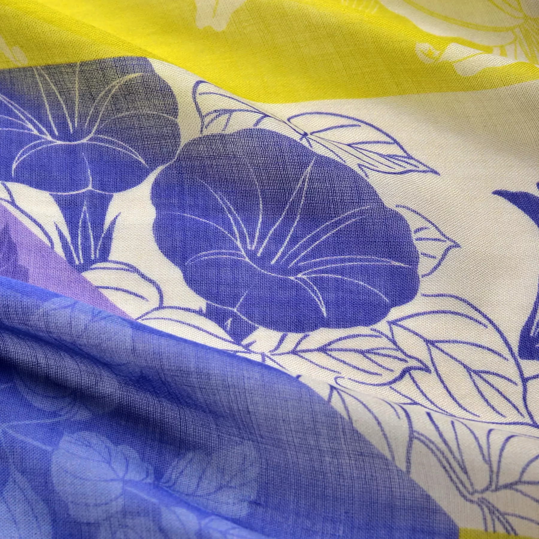 千總の紋である千切台の八角形をカラーブロックで表現したユニークなデザイン。大胆な構図の中には繊細に描かれた春夏の草花。まるで宝探しのように季節を感じる自然を見つけては、思わず笑みのこぼれる一枚です。